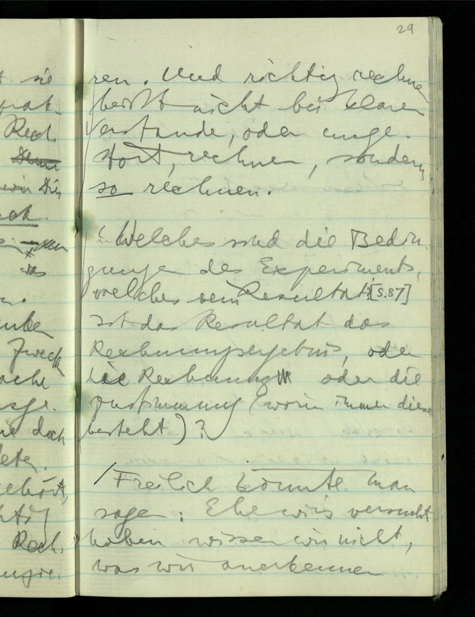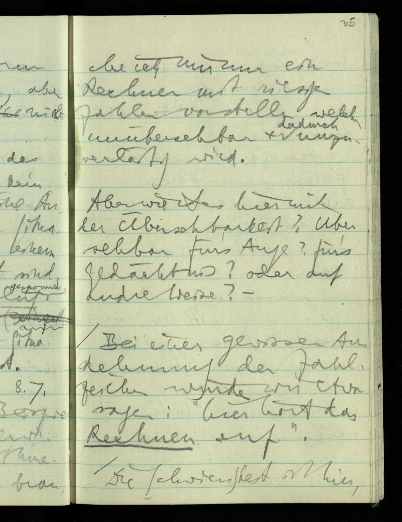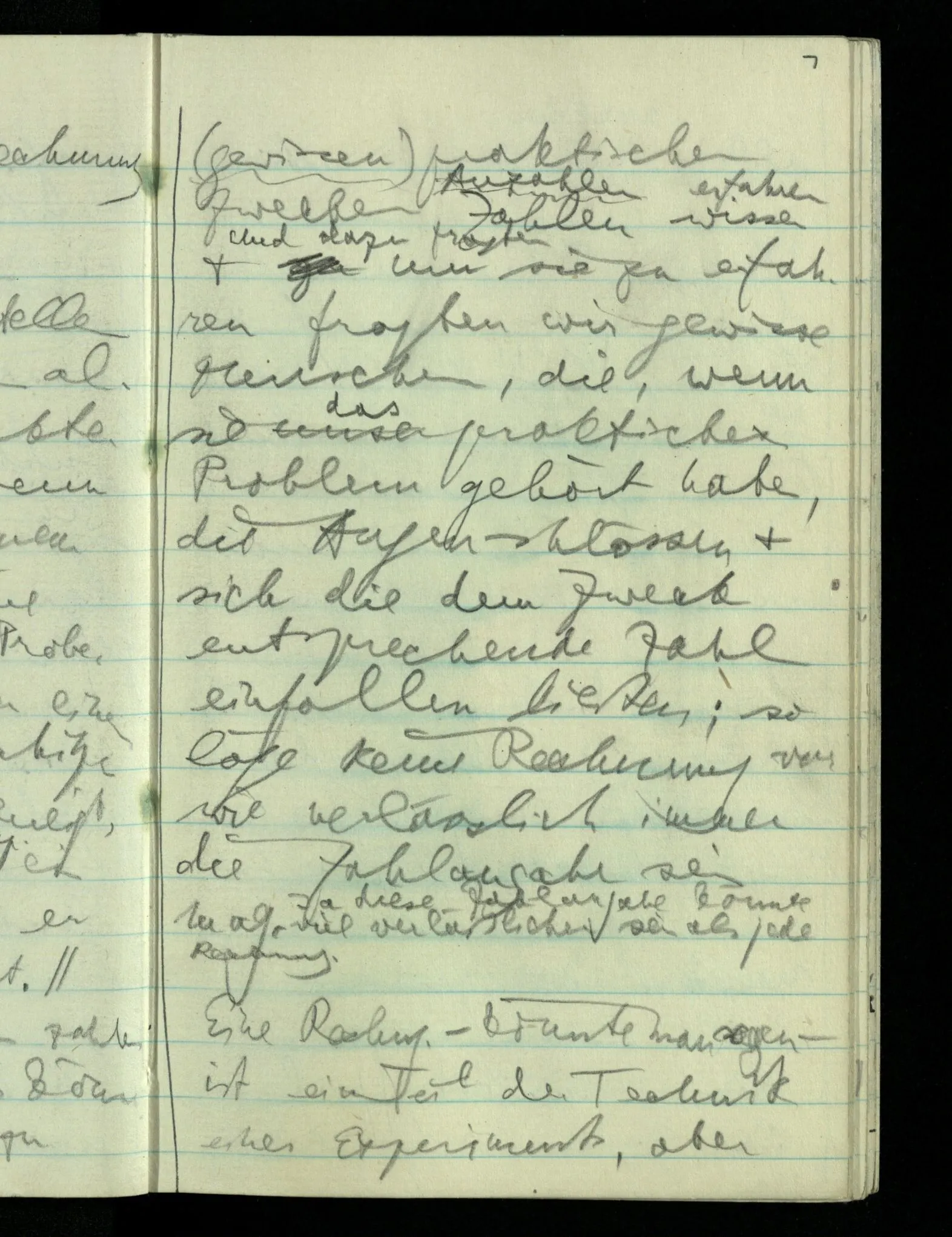 Wenn wir zählen könnten & wir wollten zu (gewissen) praktischen Zwecken Zahlen wissen. & um sie zu erfahren fragten wir gewisse Menschen, die, wenn sie unser praktisches Problem gehört haben, die Augen schlössen & sich die dem Zweck entsprechende Zahl einfallen ließen; so läge keine Rechnung vor wie verläßlich immer die Zahlangabe sein mag. Ja diese Zahlangabe könnte viel verläßlicher sein als jede Rechnung.
