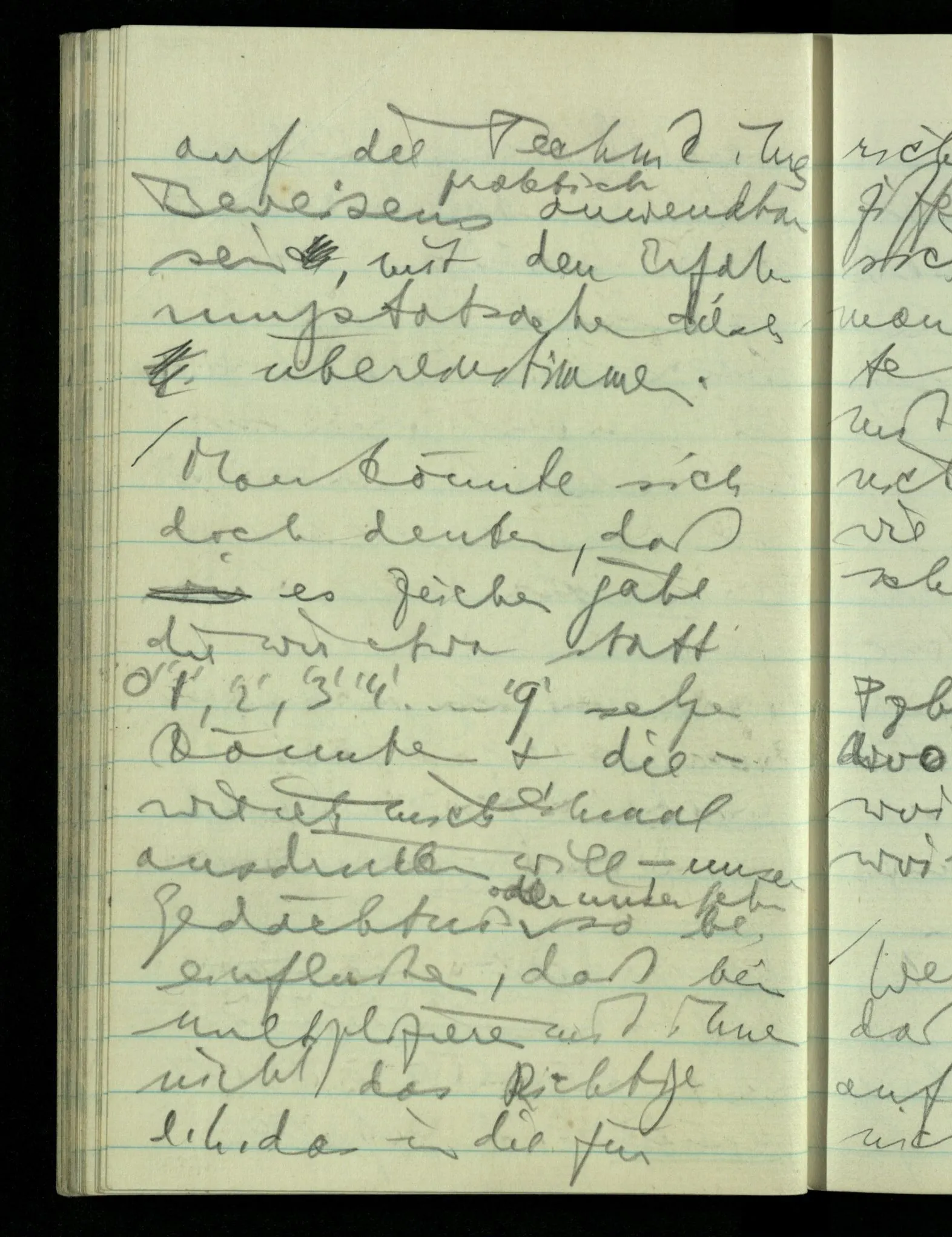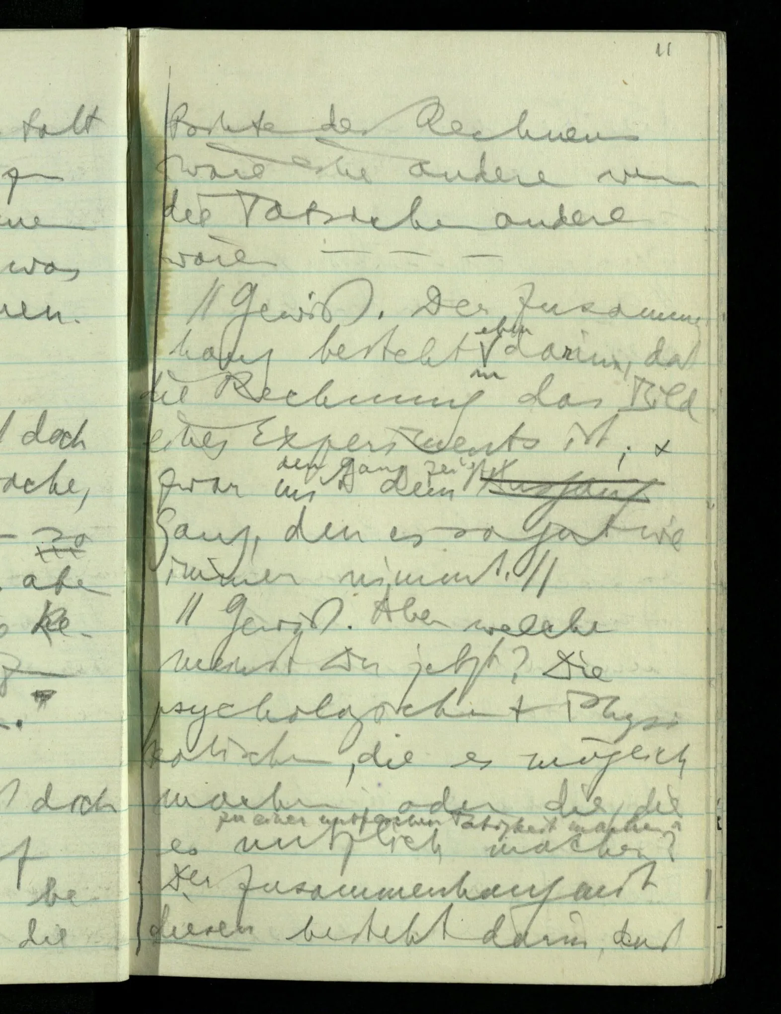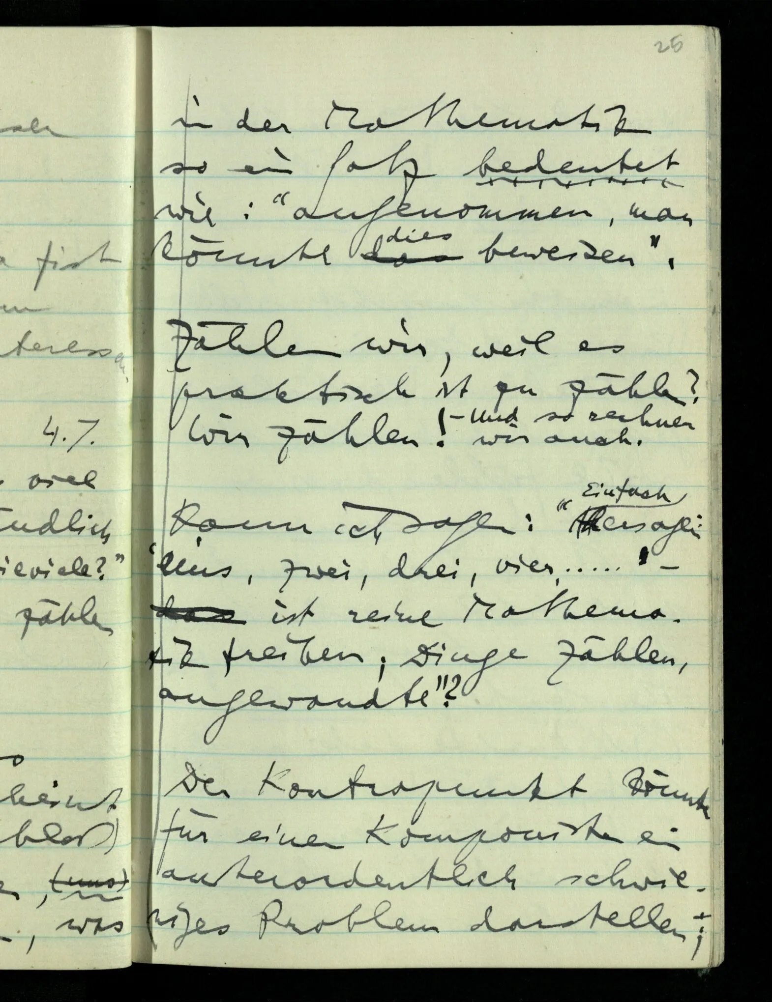 Wenn wir zählen könnten & wir wollten zu (gewissen) praktischen Zwecken Zahlen wissen. & um sie zu erfahren fragten wir gewisse Menschen, die, wenn sie unser praktisches Problem gehört haben, die Augen schlössen & sich die dem Zweck entsprechende Zahl einfallen ließen; so läge keine Rechnung vor wie verläßlich immer die Zahlangabe sein mag. Ja diese Zahlangabe könnte viel verläßlicher sein als jede Rechnung.