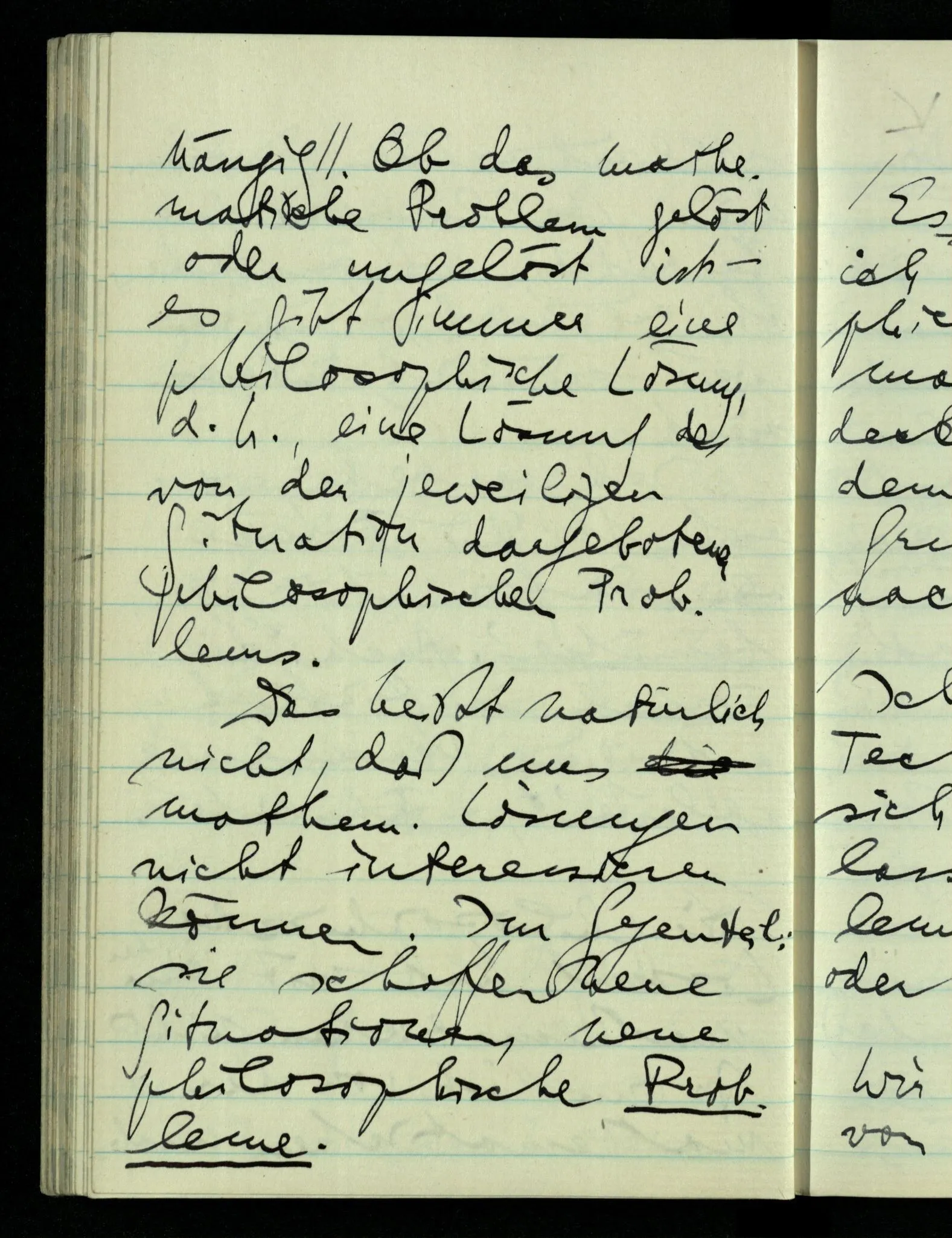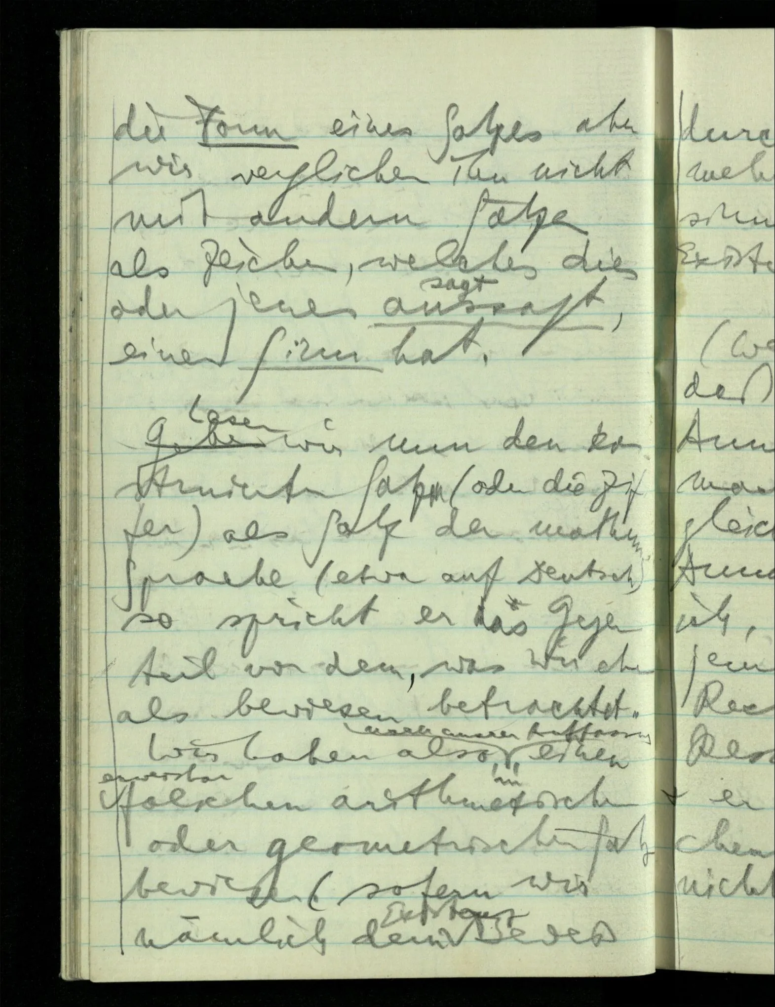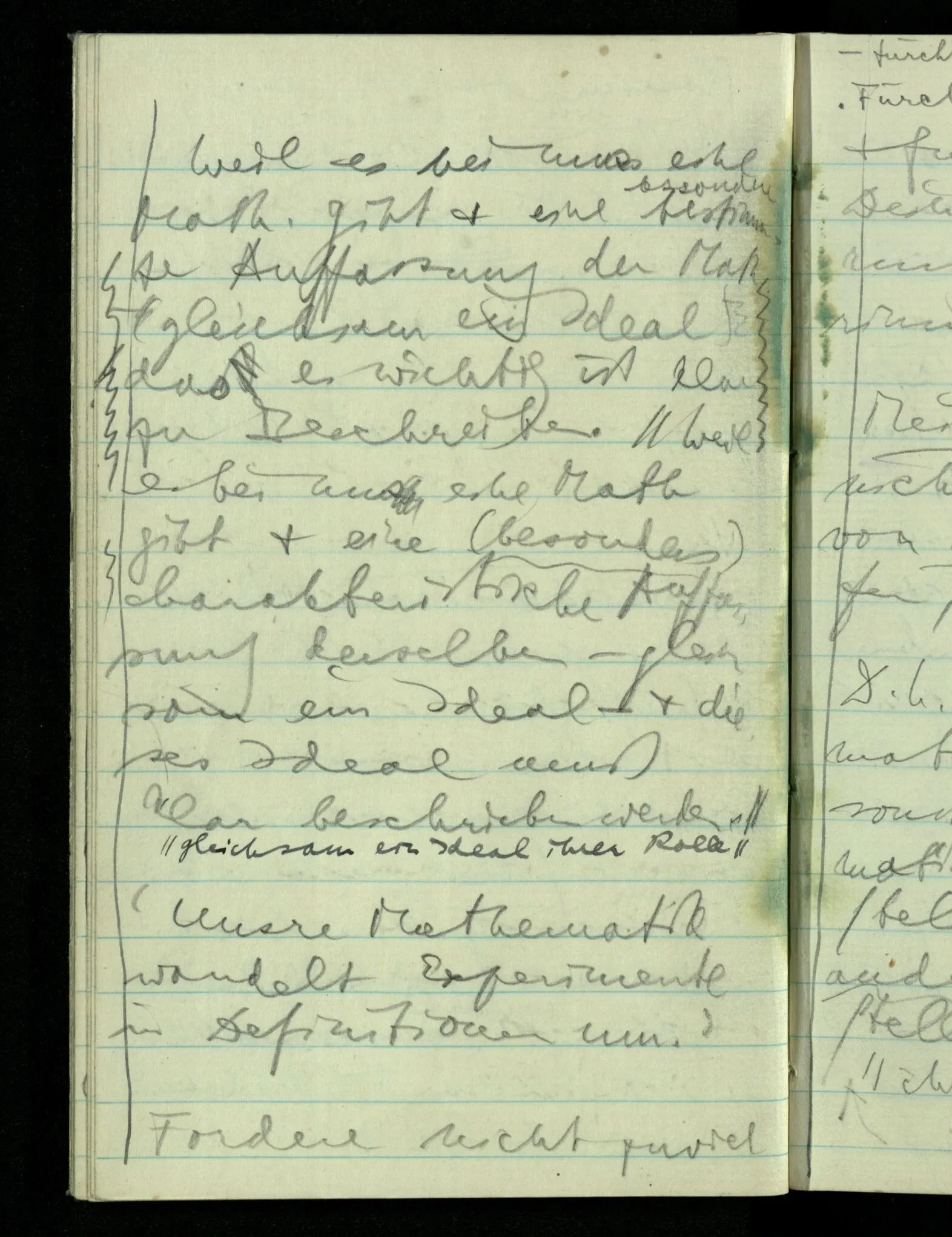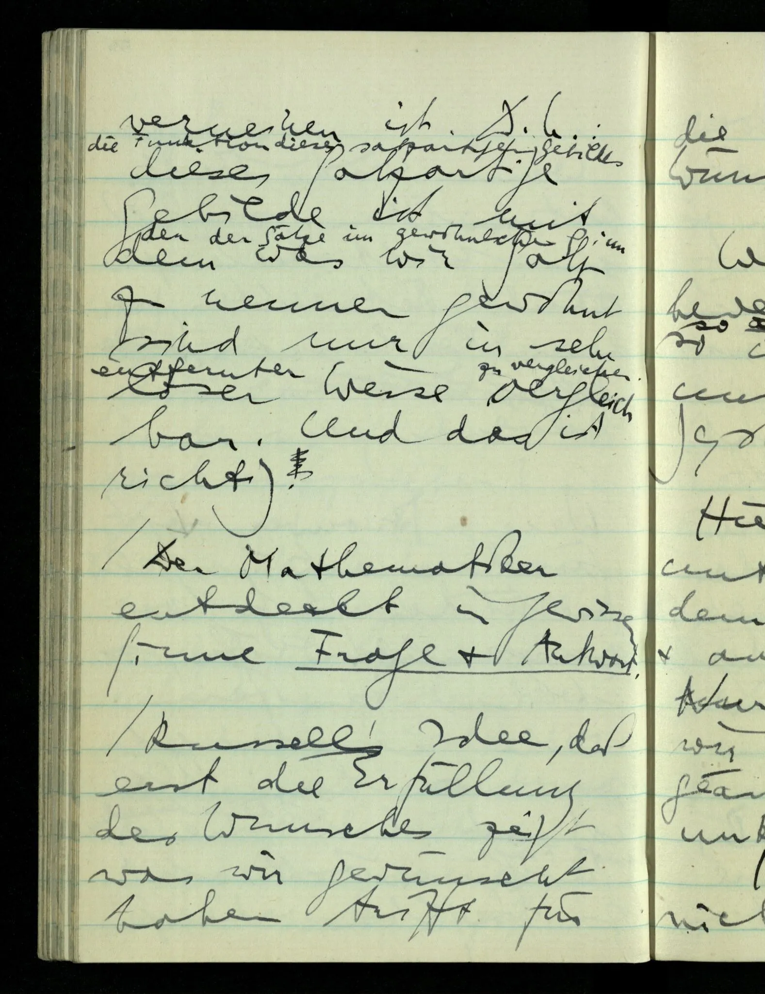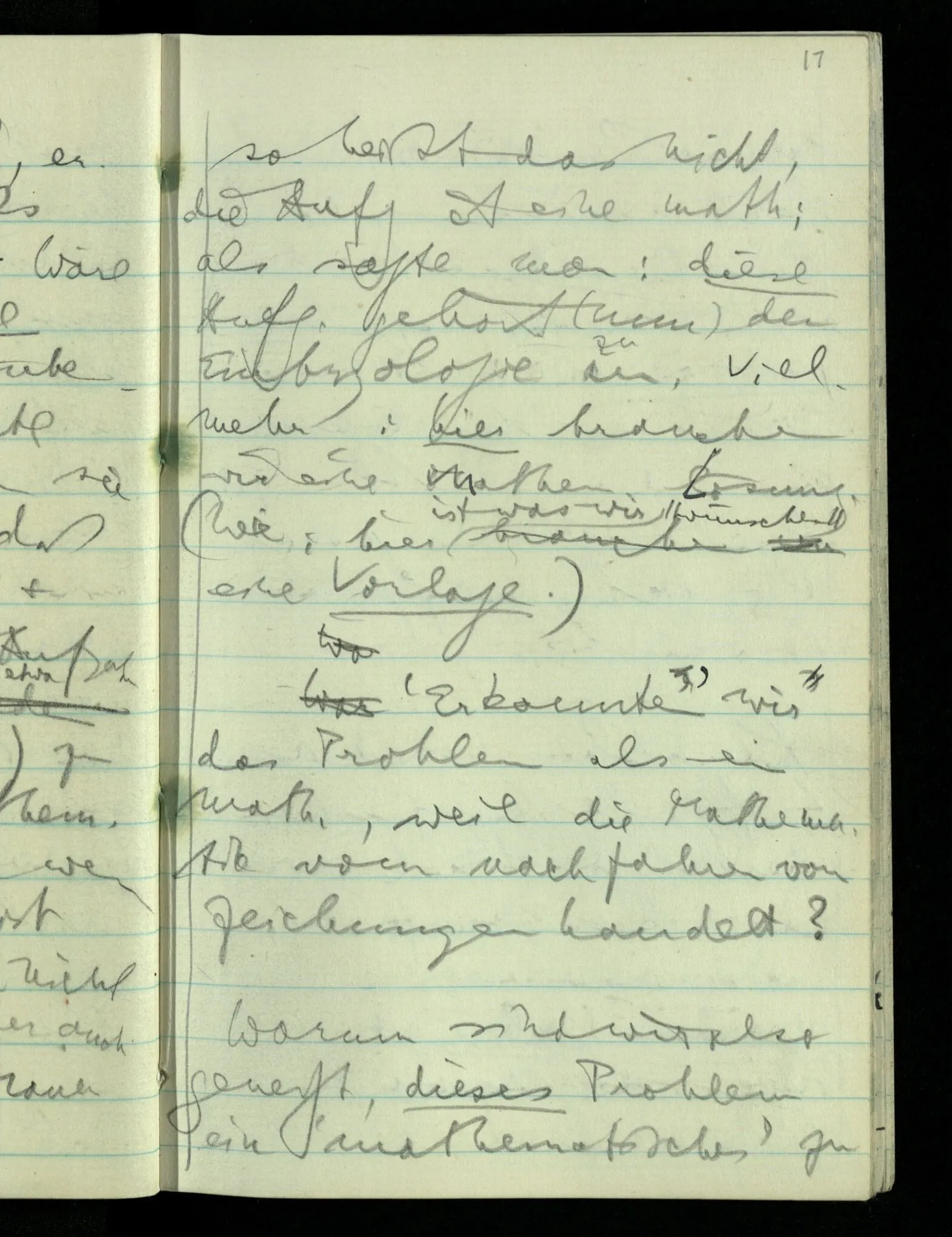 Aber können wir uns keine menschliche Gesellschaft denken in der es ebensowenig ein Rechnen ganz in unserm Sinn, wie ein Messen ganz in unserm Sinn gibt? – Doch. – Aber wozu will ich mich dann bemühen, was Mathematik ist, exakt herauszuarbeiten? Weil es bei uns eine Math. gibt & eine bestimmte Auffassung der Math. (gleichsam ein Ideal) das es wichtig ist klar zu beschreiben.