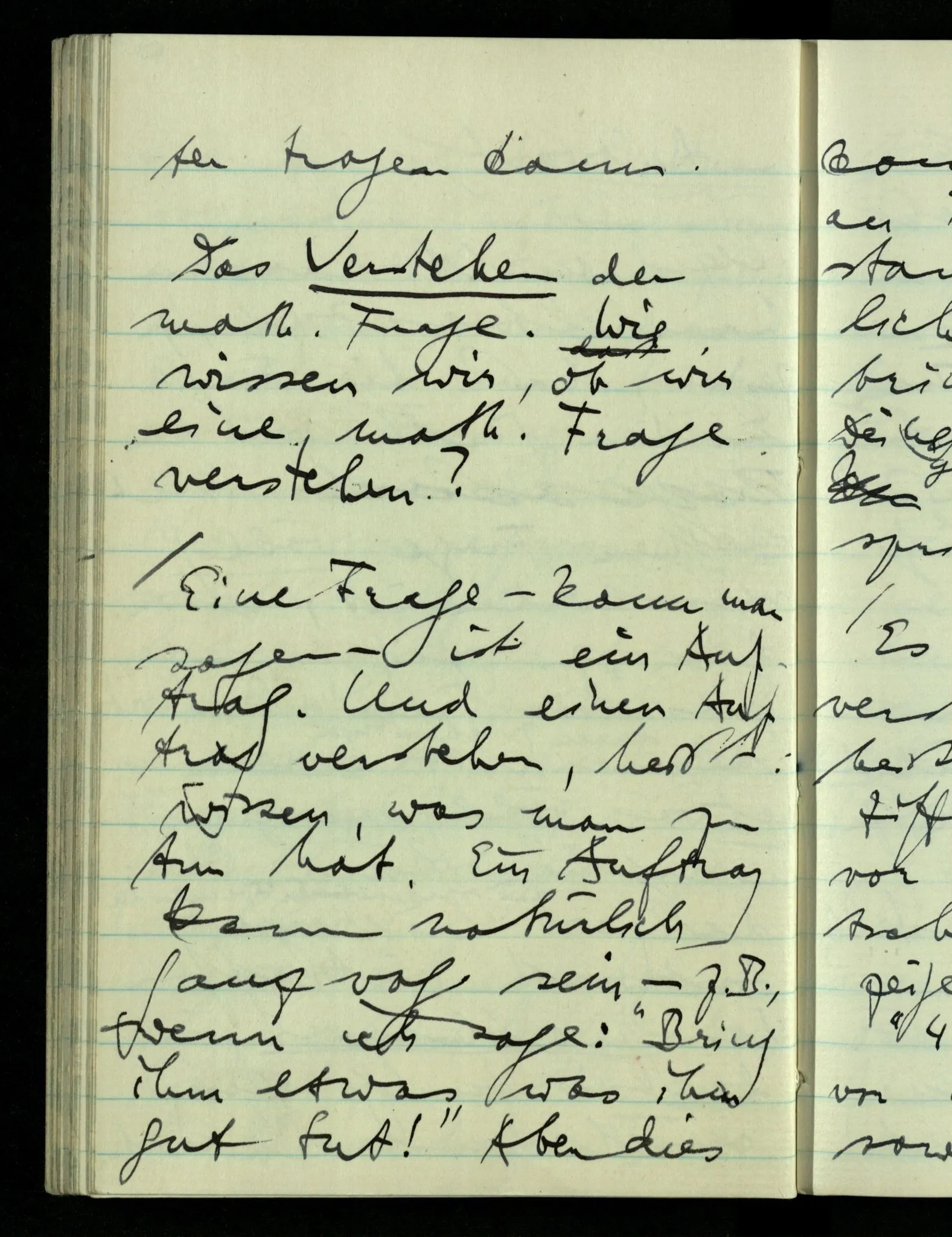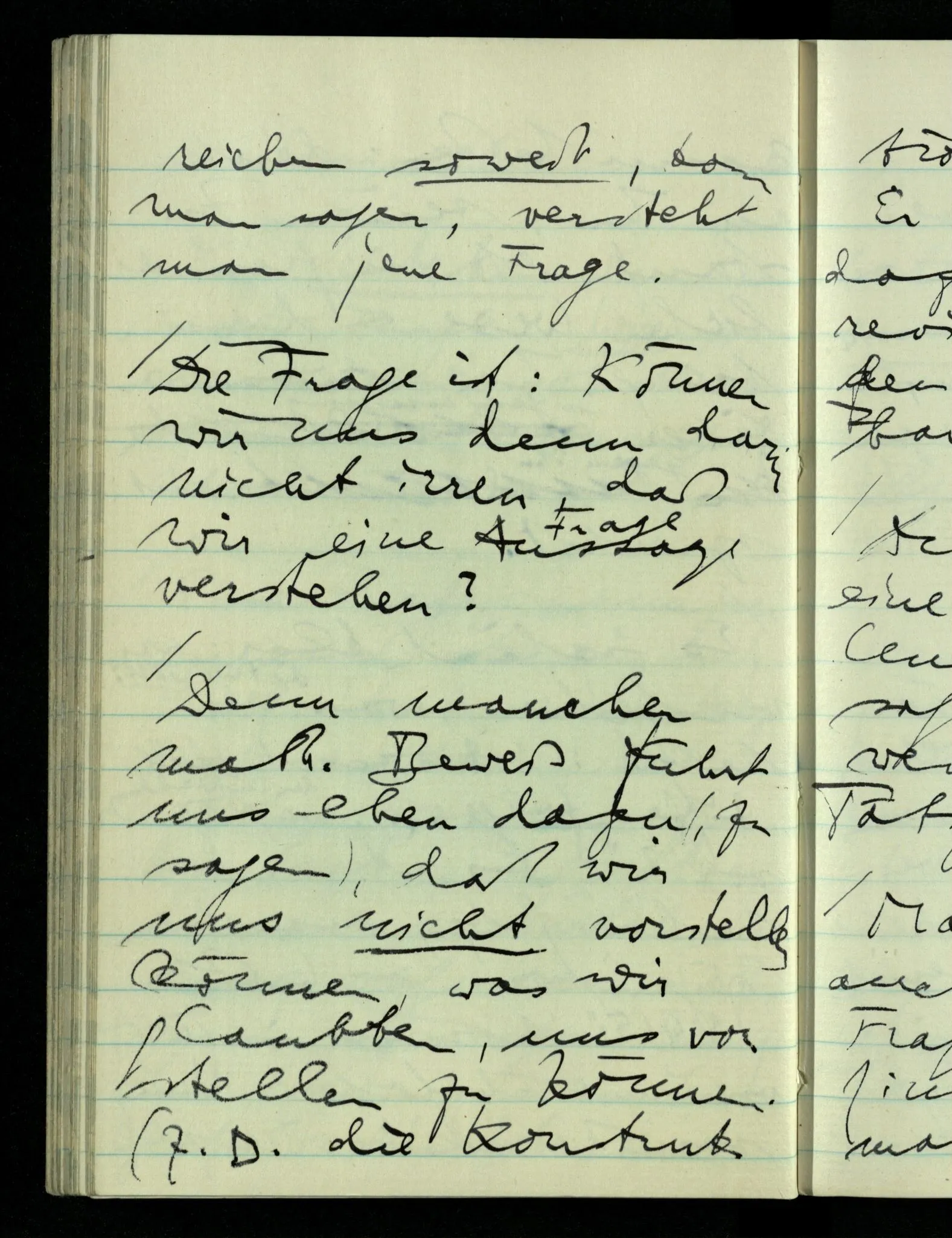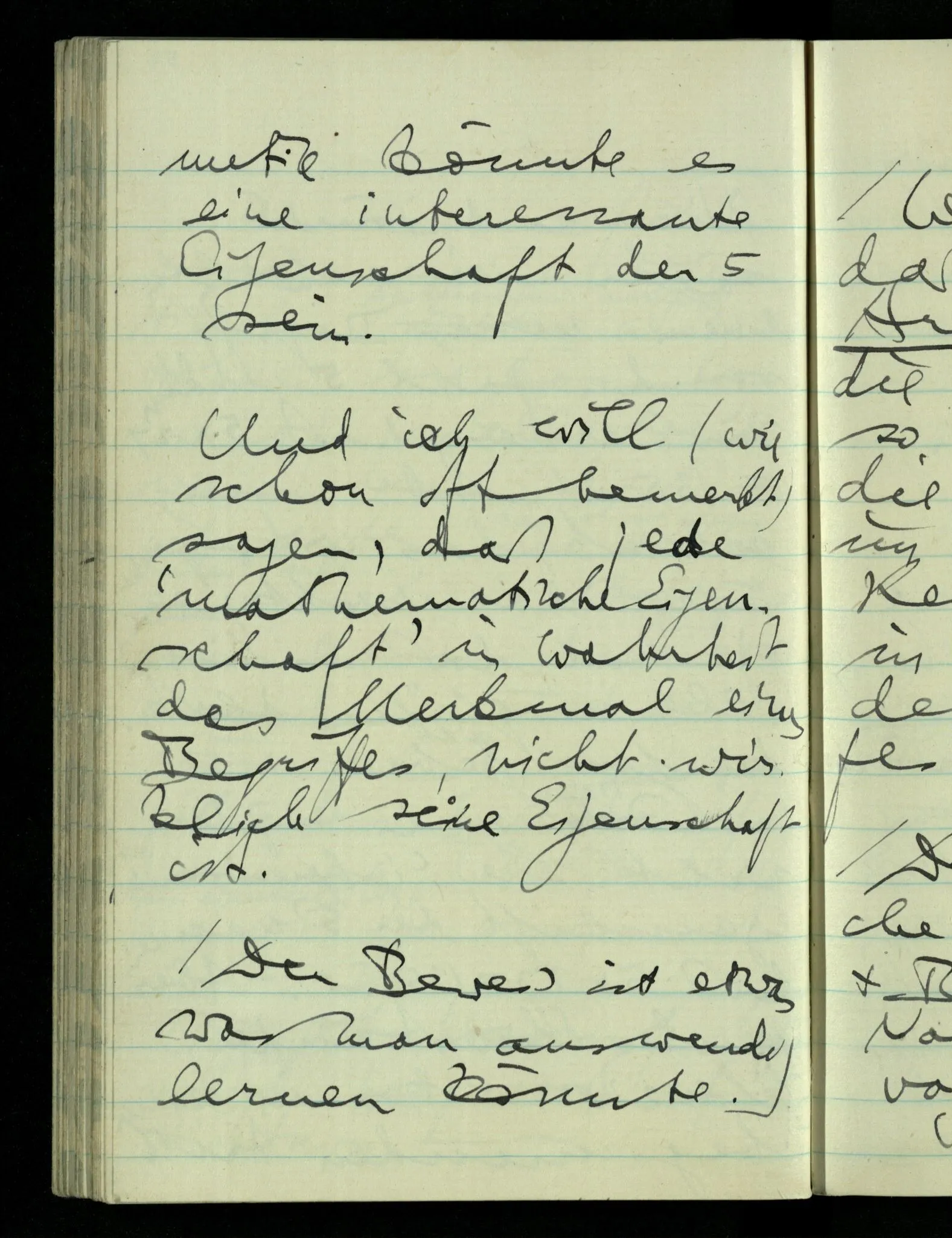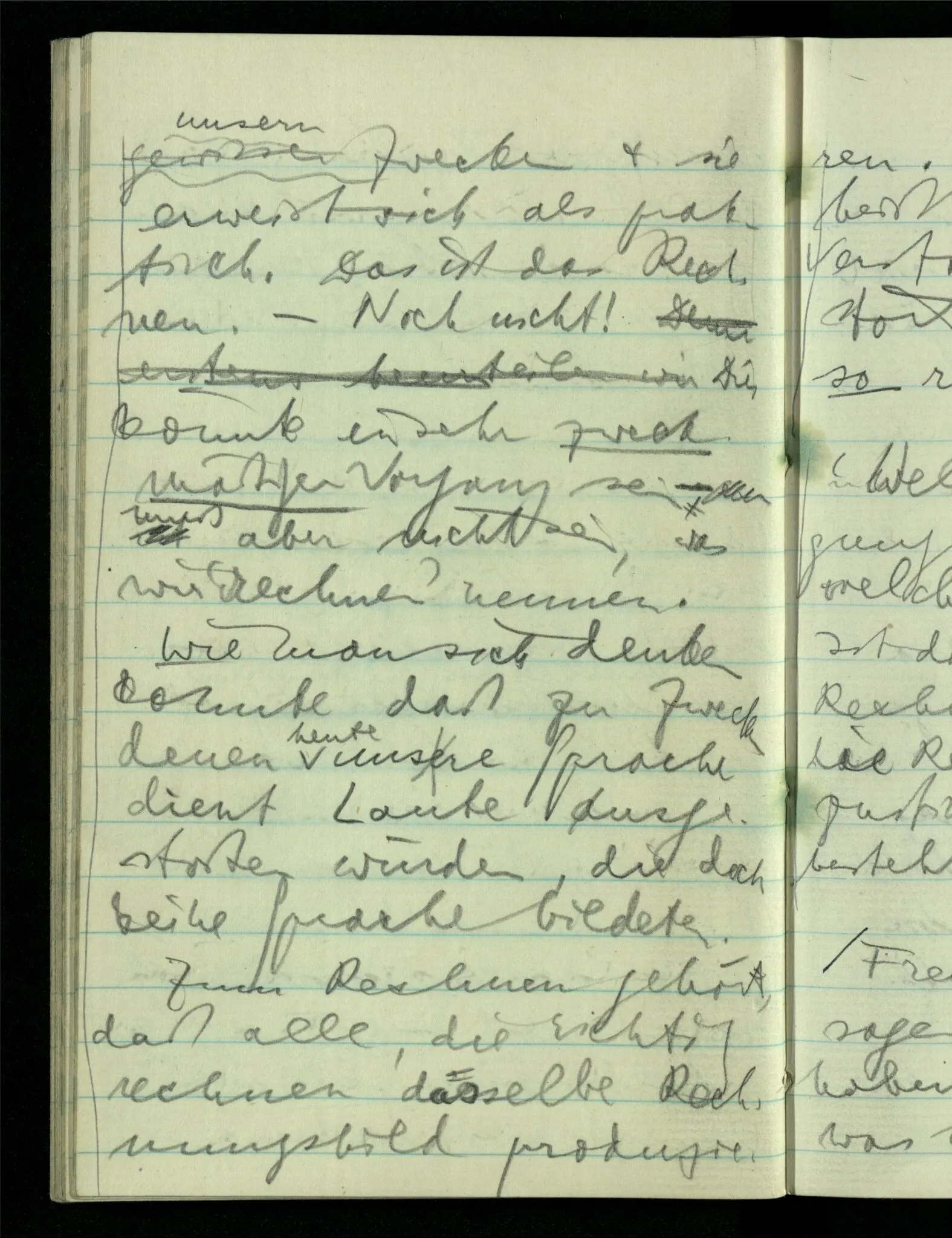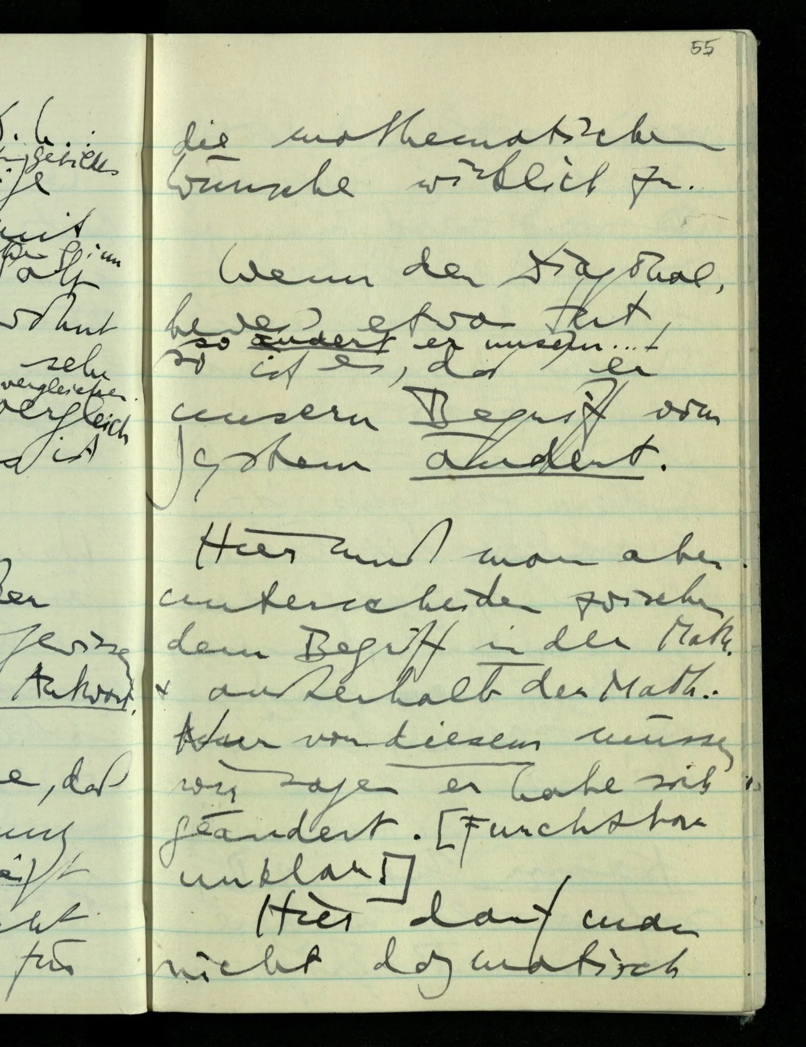 Aber können wir uns keine menschliche Gesellschaft denken in der es ebensowenig ein Rechnen ganz in unserm Sinn, wie ein Messen ganz in unserm Sinn gibt? – Doch. – Aber wozu will ich mich dann bemühen, was Mathematik ist, exakt herauszuarbeiten? Weil es bei uns eine Math. gibt & eine bestimmte Auffassung der Math. (gleichsam ein Ideal) das es wichtig ist klar zu beschreiben.