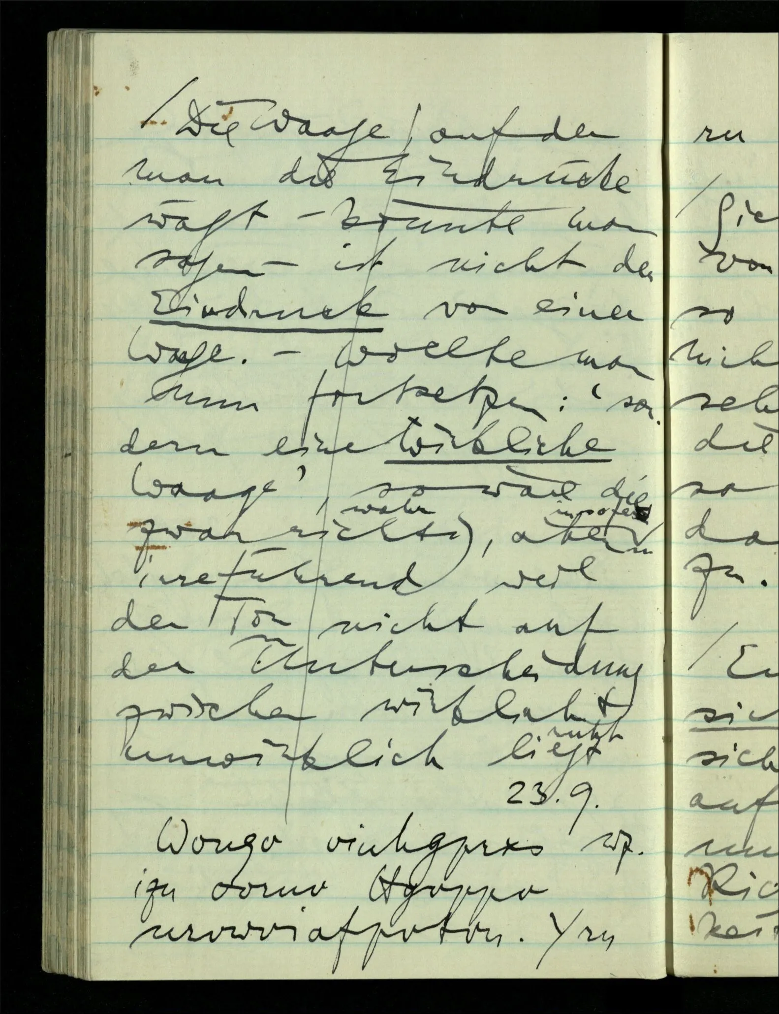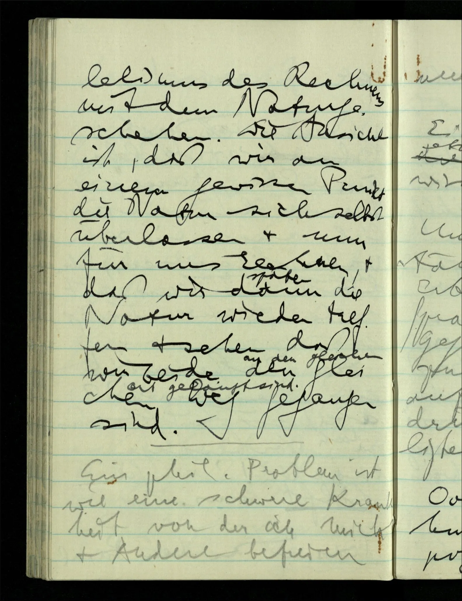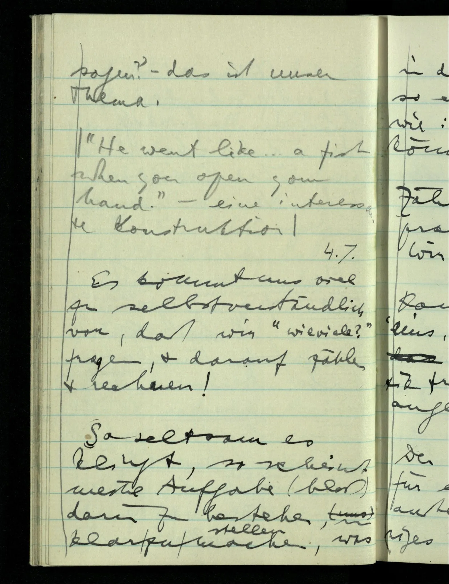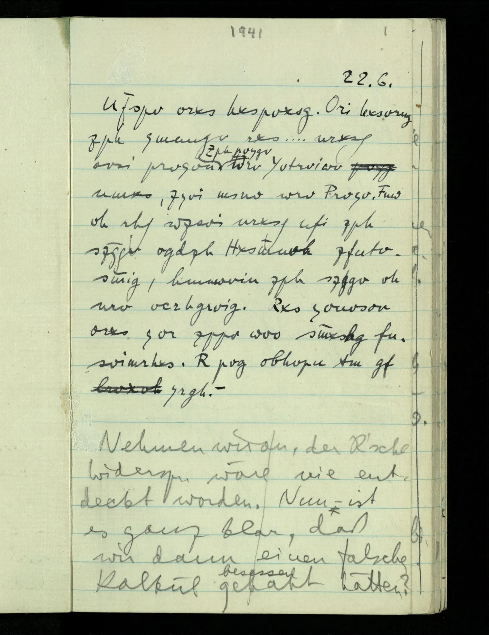 22.06.1941 Fühle mich schlecht. Mir scheint als könnte ich … nicht mehr lieben. Als lebte die Begierde noch, aber ohne die Liebe. Und es ist daher nicht nur als hätte etwas Schönes aufgehört, sondern als hätte es nie existiert. Ich benehme mich bei alle dem höchst unheroisch. I let myself go to bits. –
