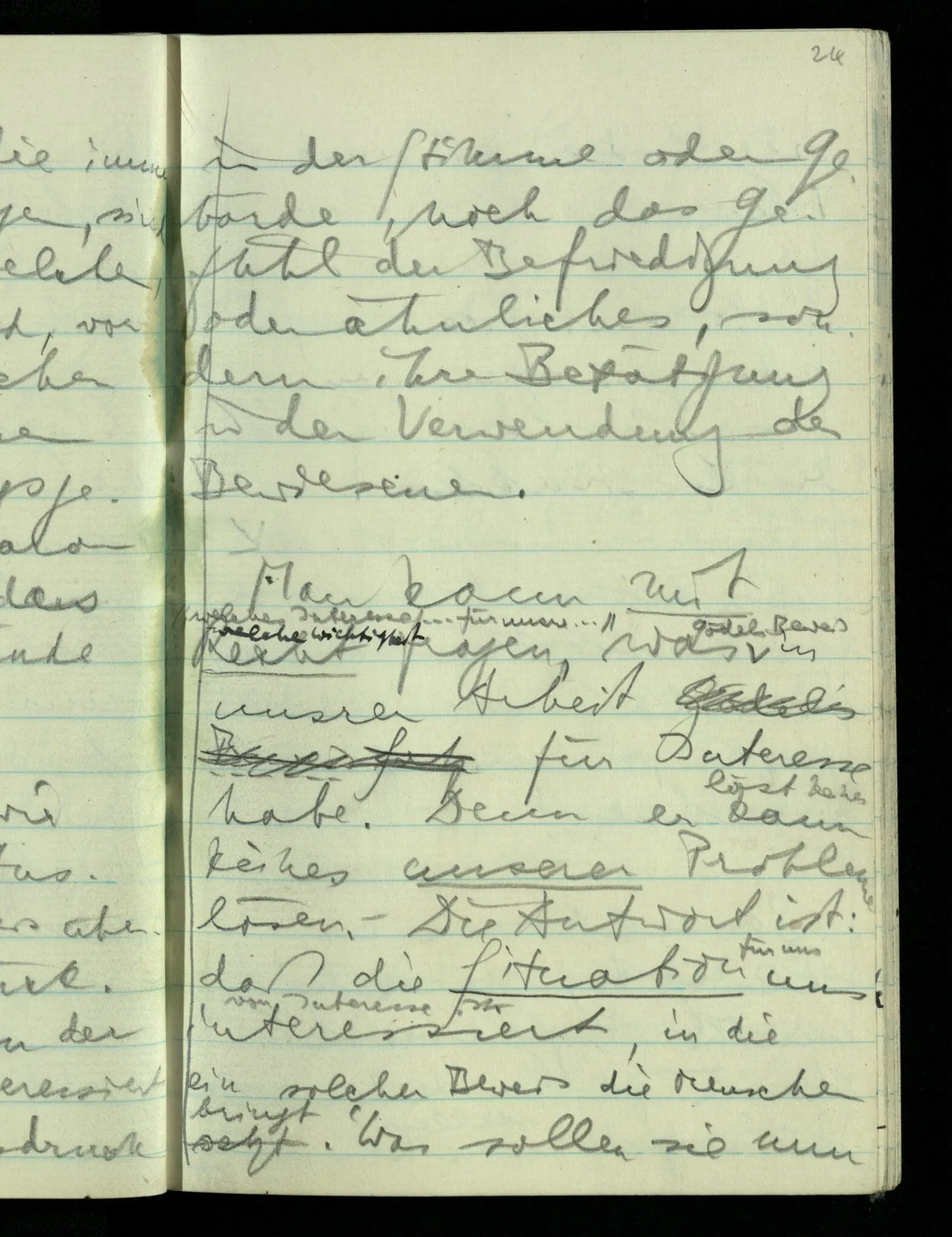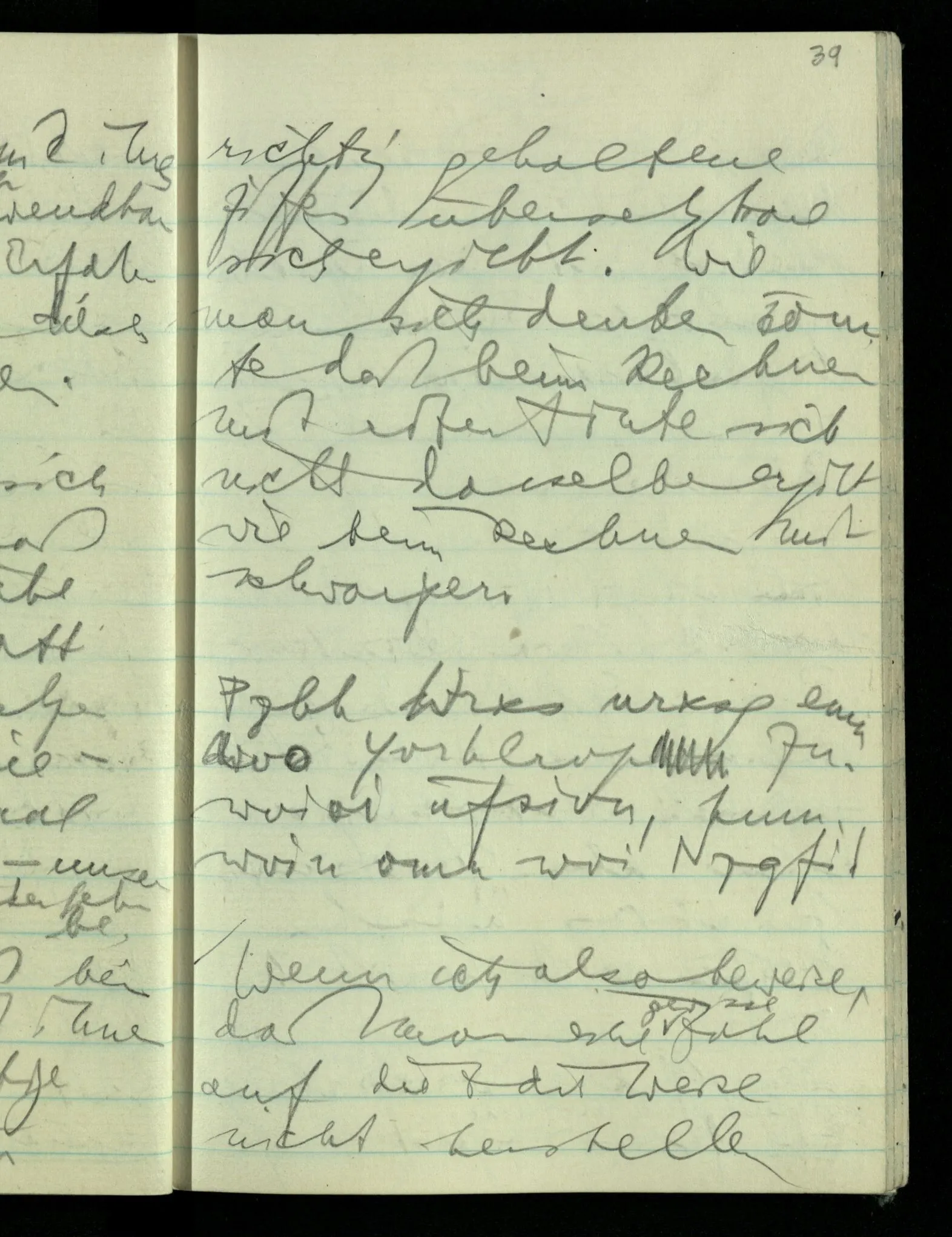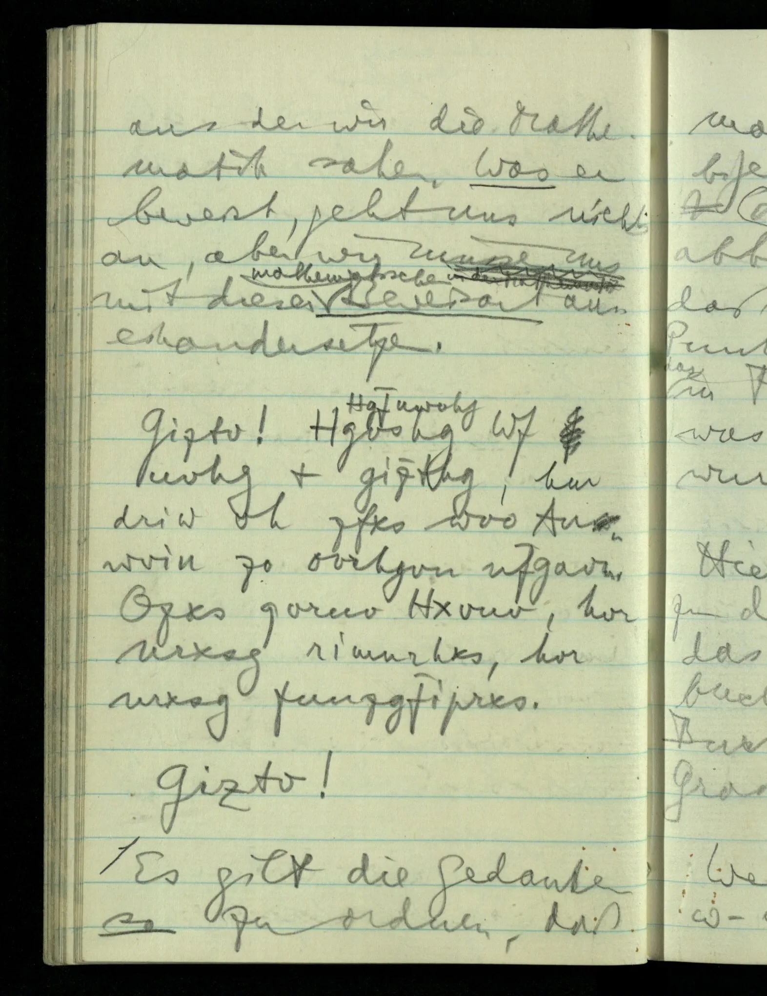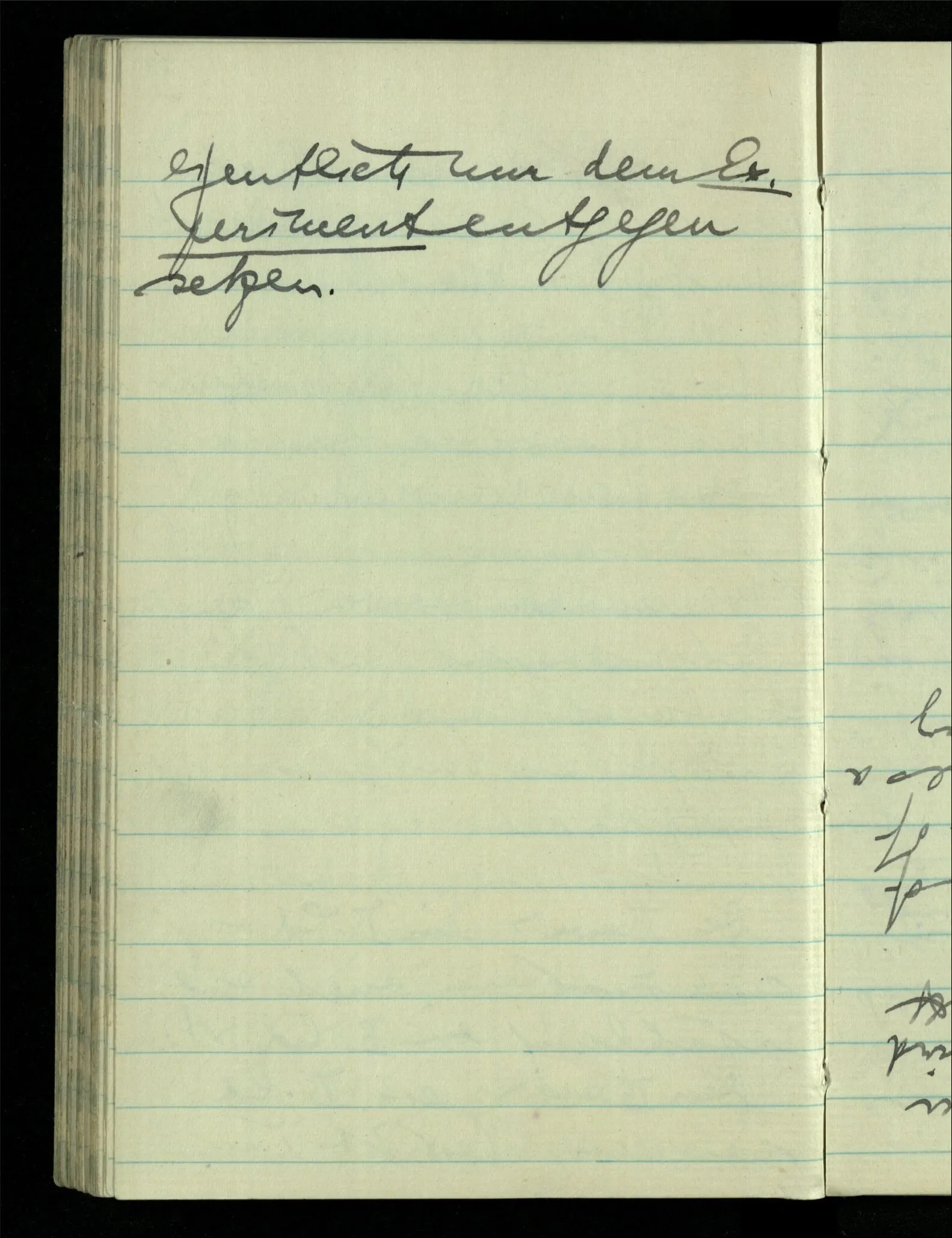22.06.1941 Fühle mich schlecht. Mir scheint als könnte ich … nicht mehr lieben. Als lebte die Begierde noch, aber ohne die Liebe. Und es ist daher nicht nur als hätte etwas Schönes aufgehört, sondern als hätte es nie existiert. Ich benehme mich bei alle dem höchst unheroisch. I let myself go to bits. –