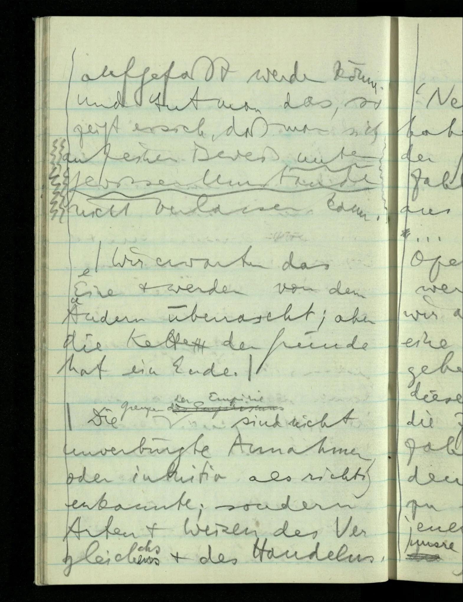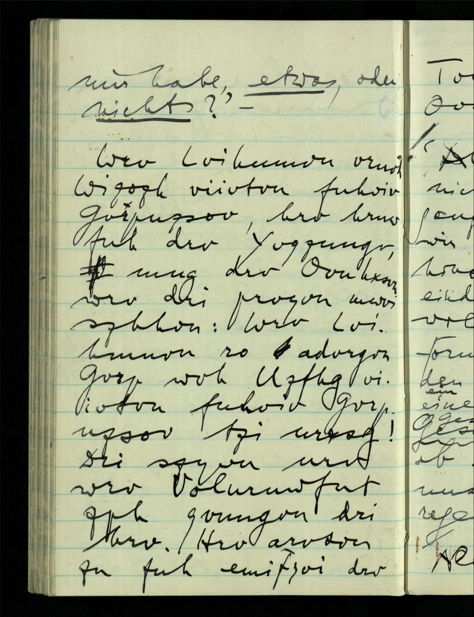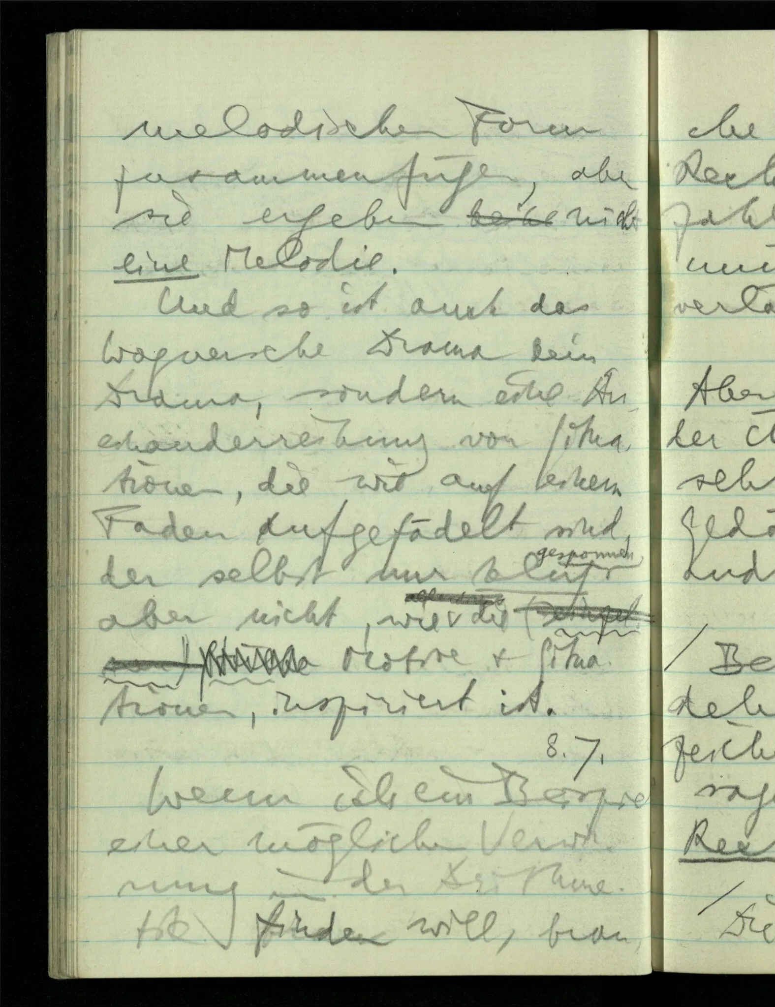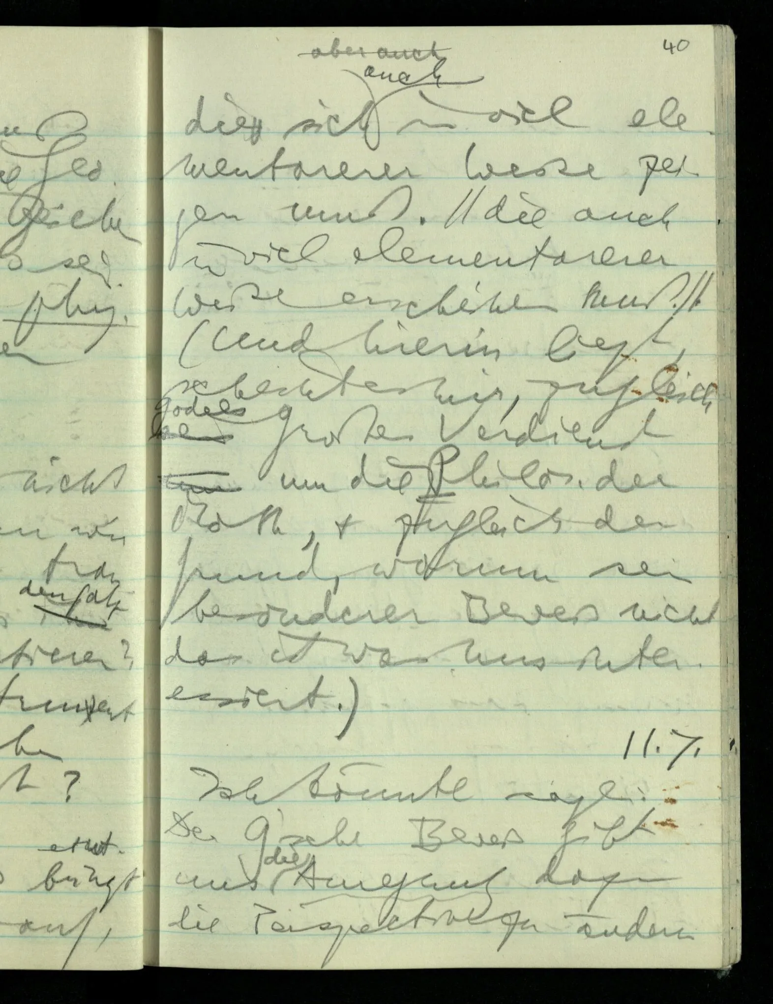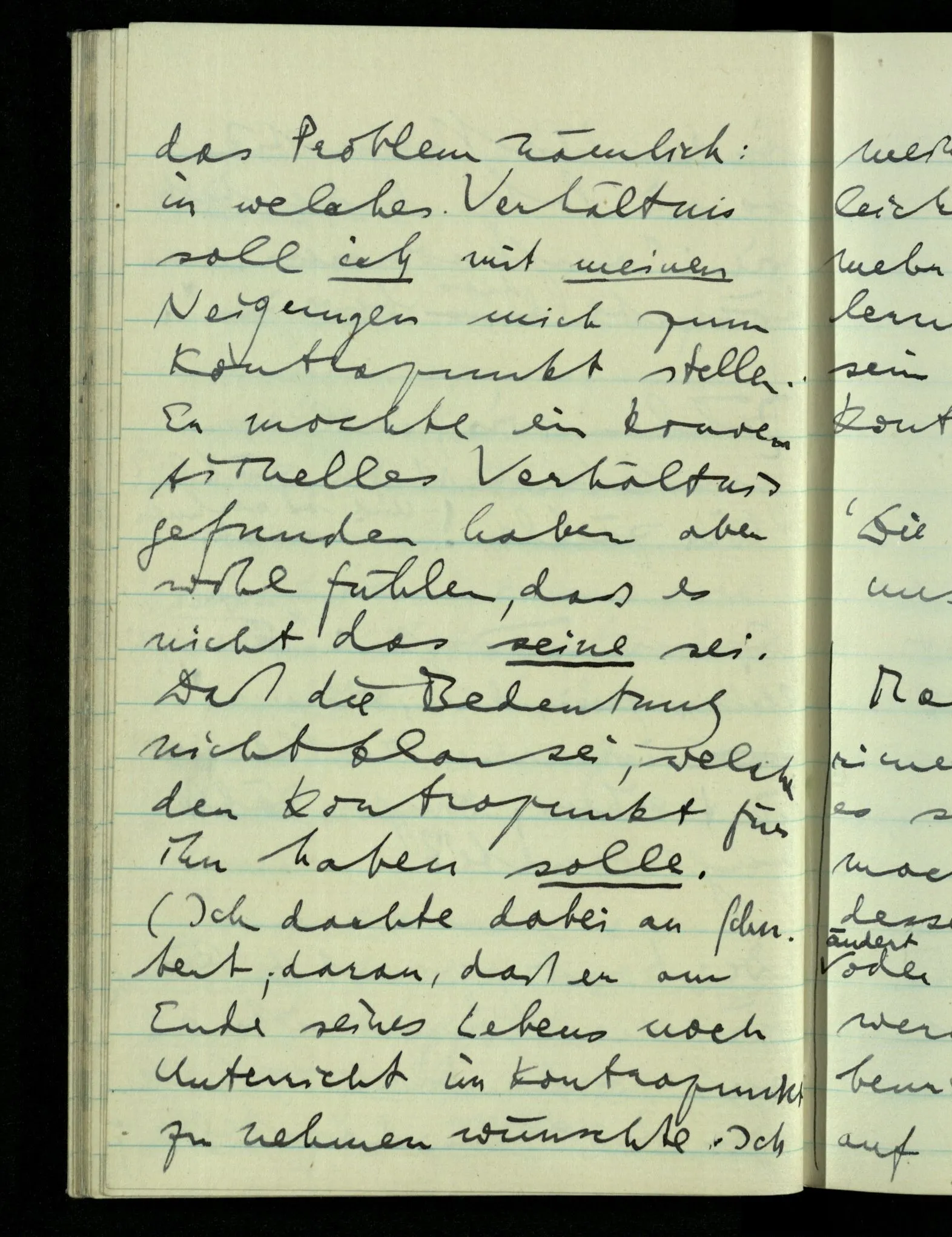 22.06.1941 Fühle mich schlecht. Mir scheint als könnte ich … nicht mehr lieben. Als lebte die Begierde noch, aber ohne die Liebe. Und es ist daher nicht nur als hätte etwas Schönes aufgehört, sondern als hätte es nie existiert. Ich benehme mich bei alle dem höchst unheroisch. I let myself go to bits. –