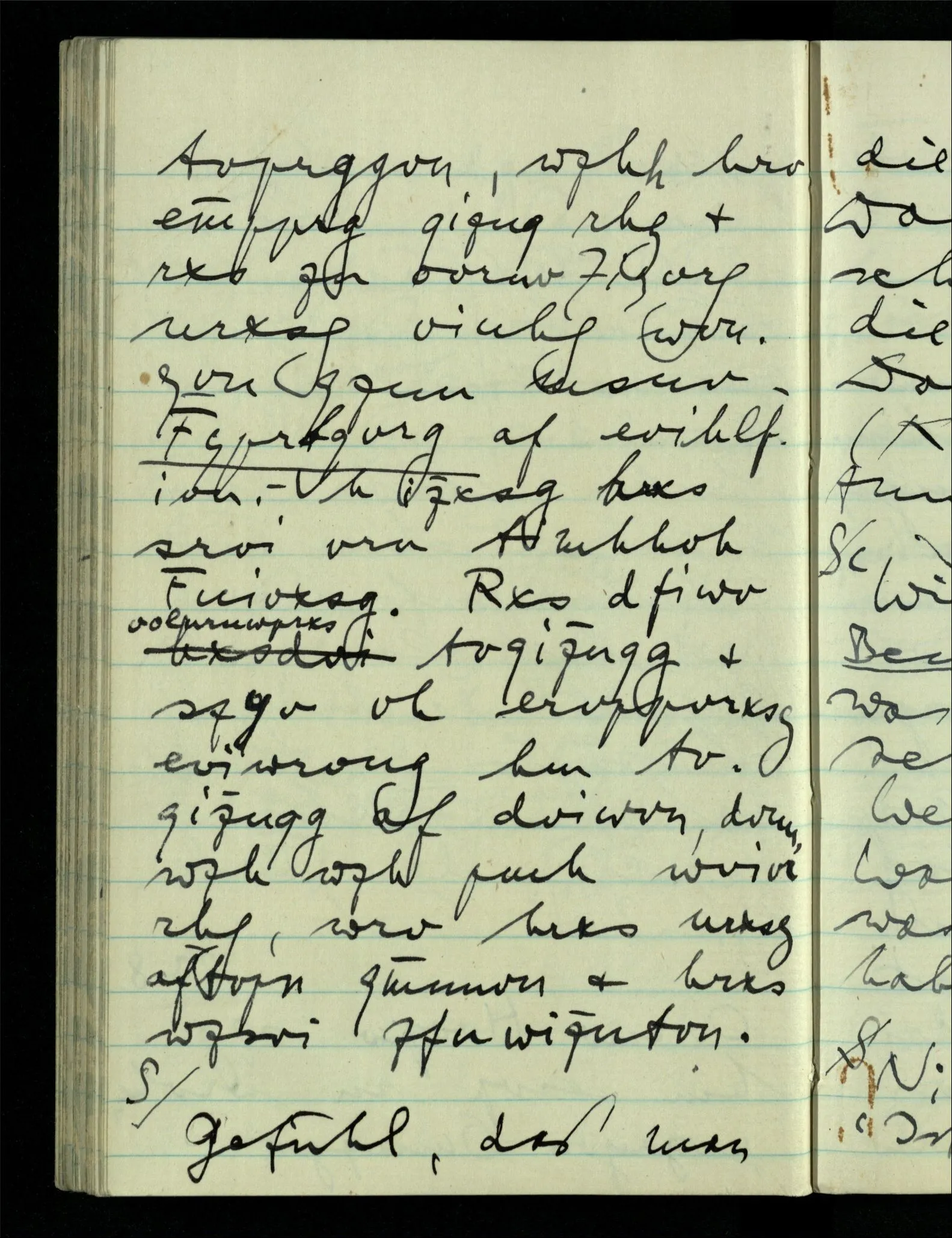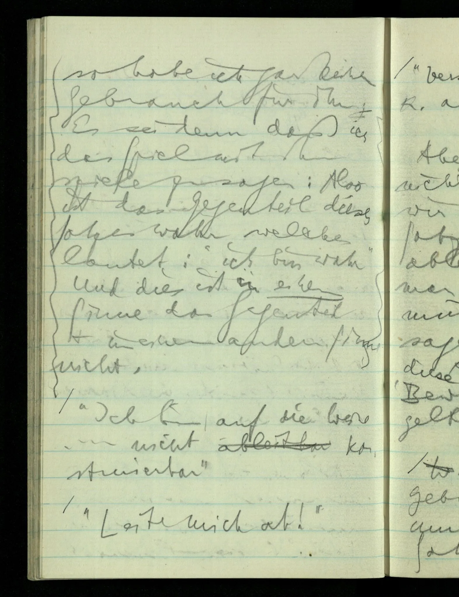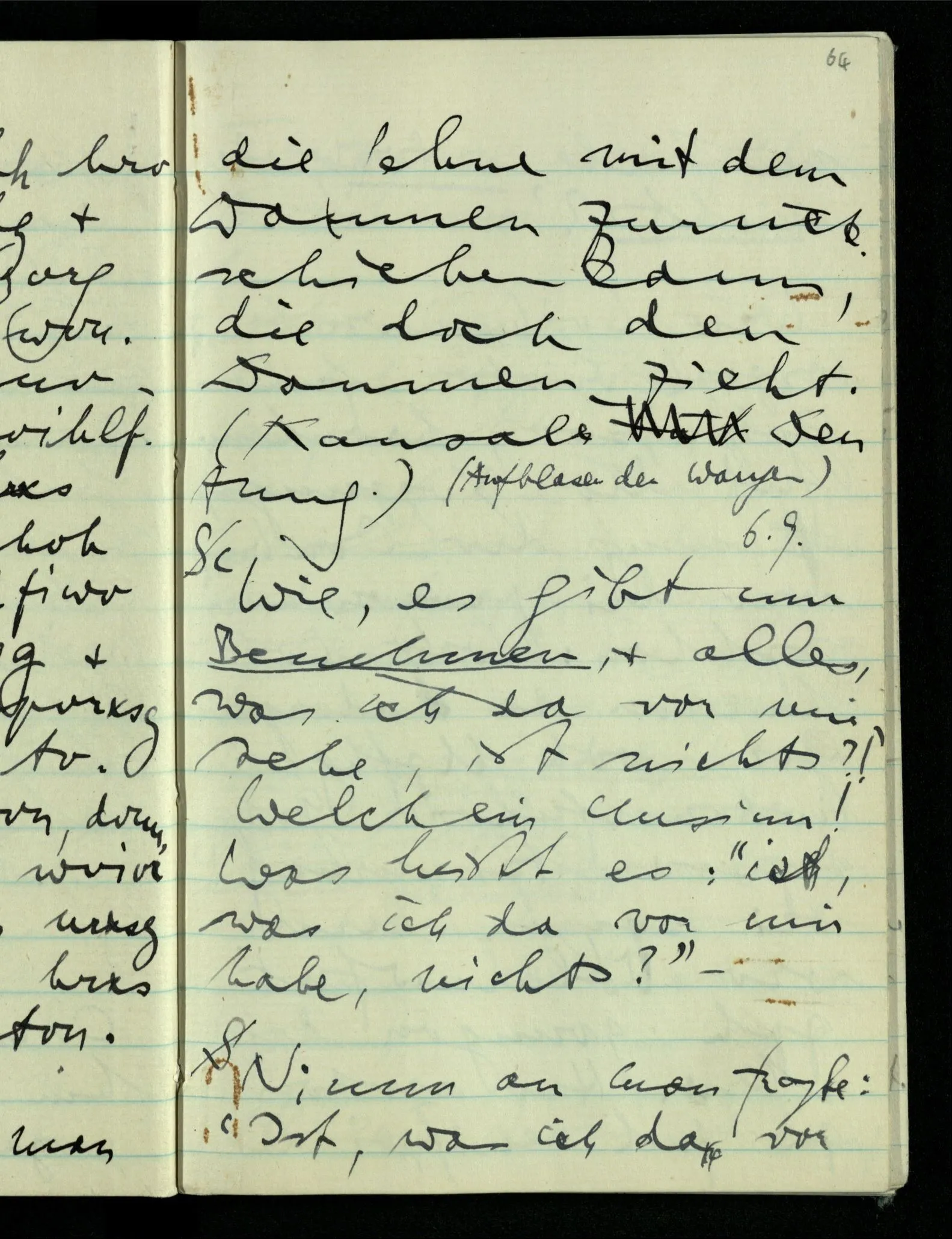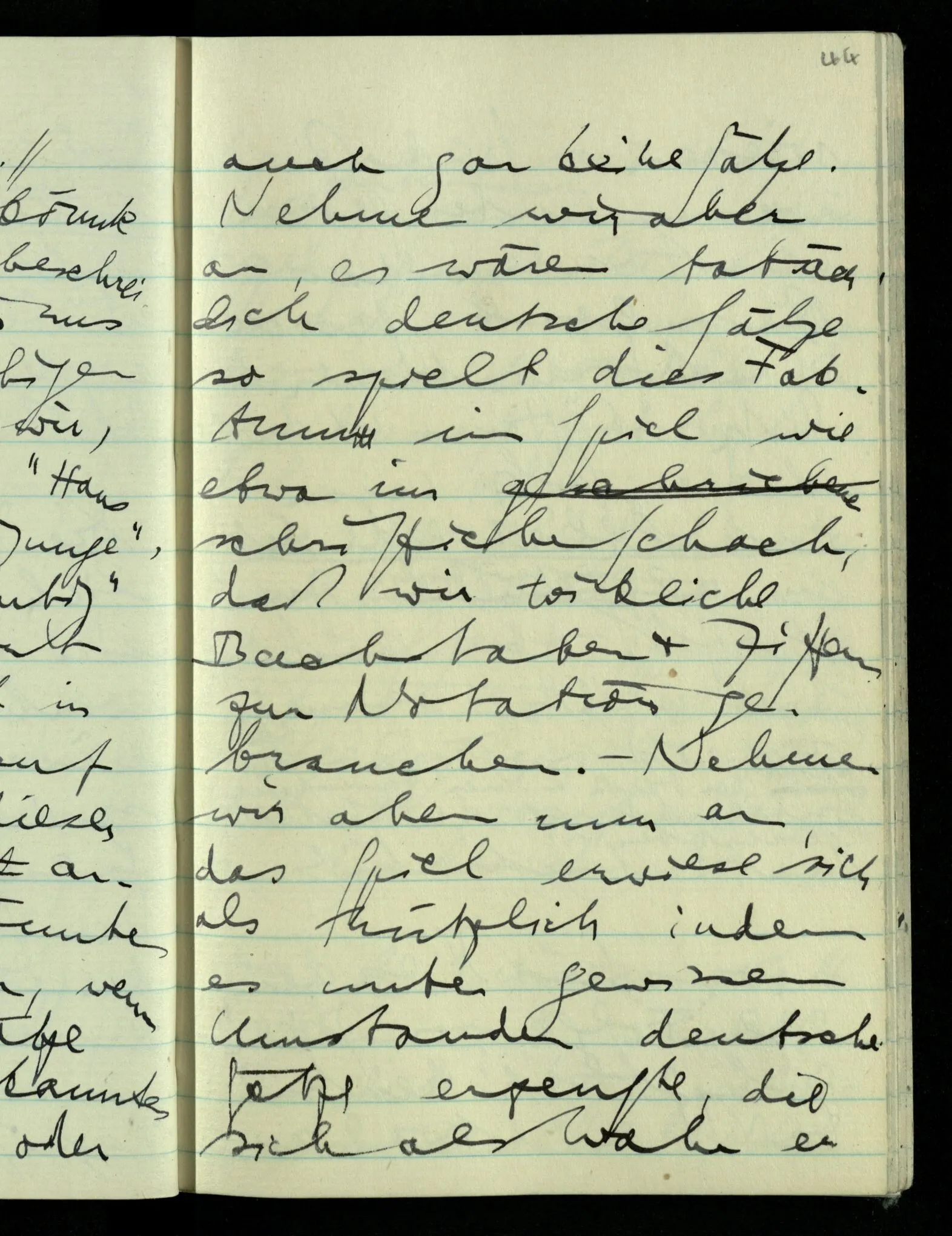 22.06.1941 Fühle mich schlecht. Mir scheint als könnte ich … nicht mehr lieben. Als lebte die Begierde noch, aber ohne die Liebe. Und es ist daher nicht nur als hätte etwas Schönes aufgehört, sondern als hätte es nie existiert. Ich benehme mich bei alle dem höchst unheroisch. I let myself go to bits. –