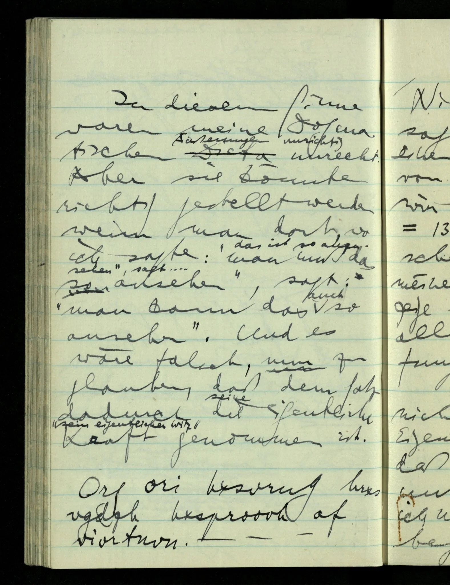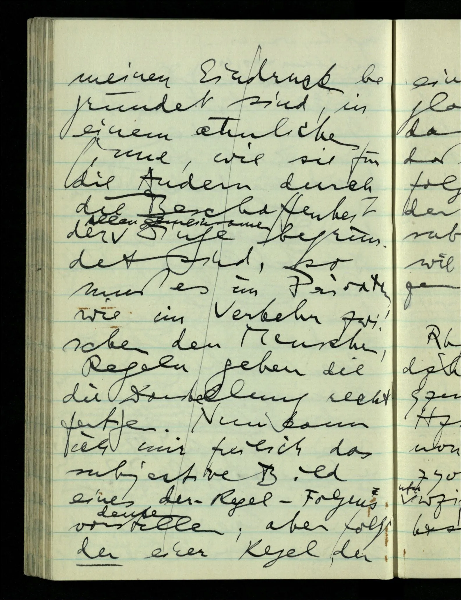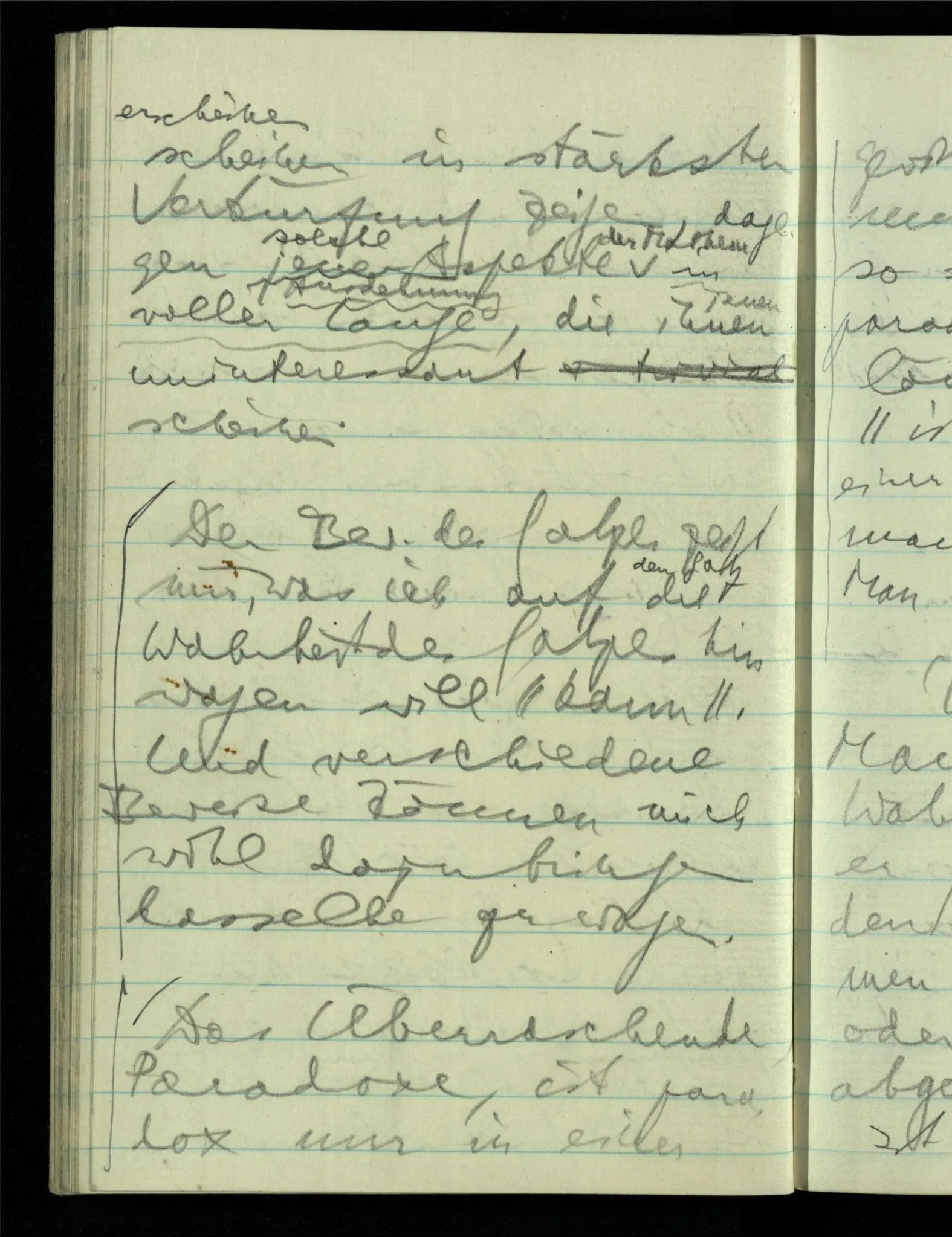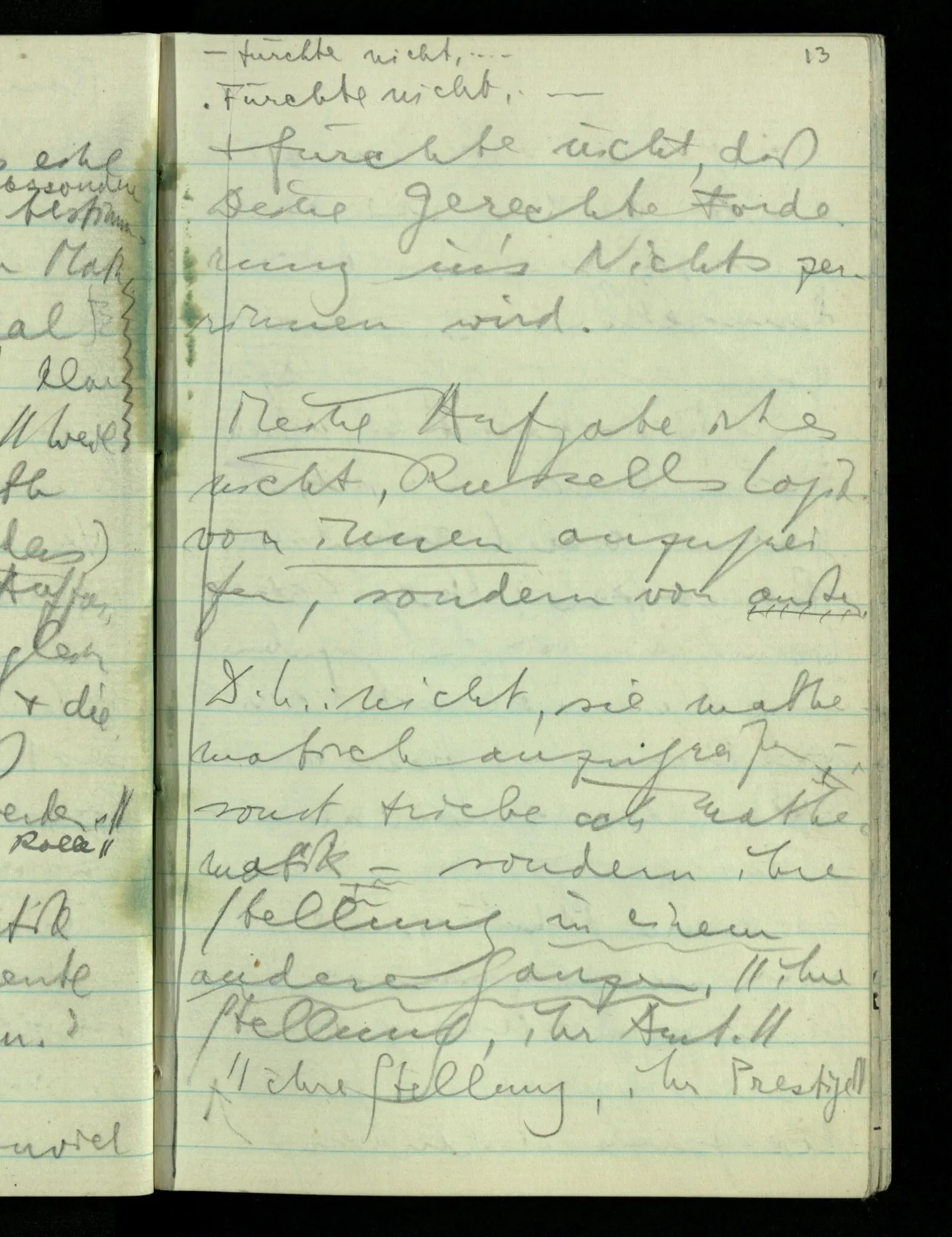 22.06.1941 Fühle mich schlecht. Mir scheint als könnte ich … nicht mehr lieben. Als lebte die Begierde noch, aber ohne die Liebe. Und es ist daher nicht nur als hätte etwas Schönes aufgehört, sondern als hätte es nie existiert. Ich benehme mich bei alle dem höchst unheroisch. I let myself go to bits. –