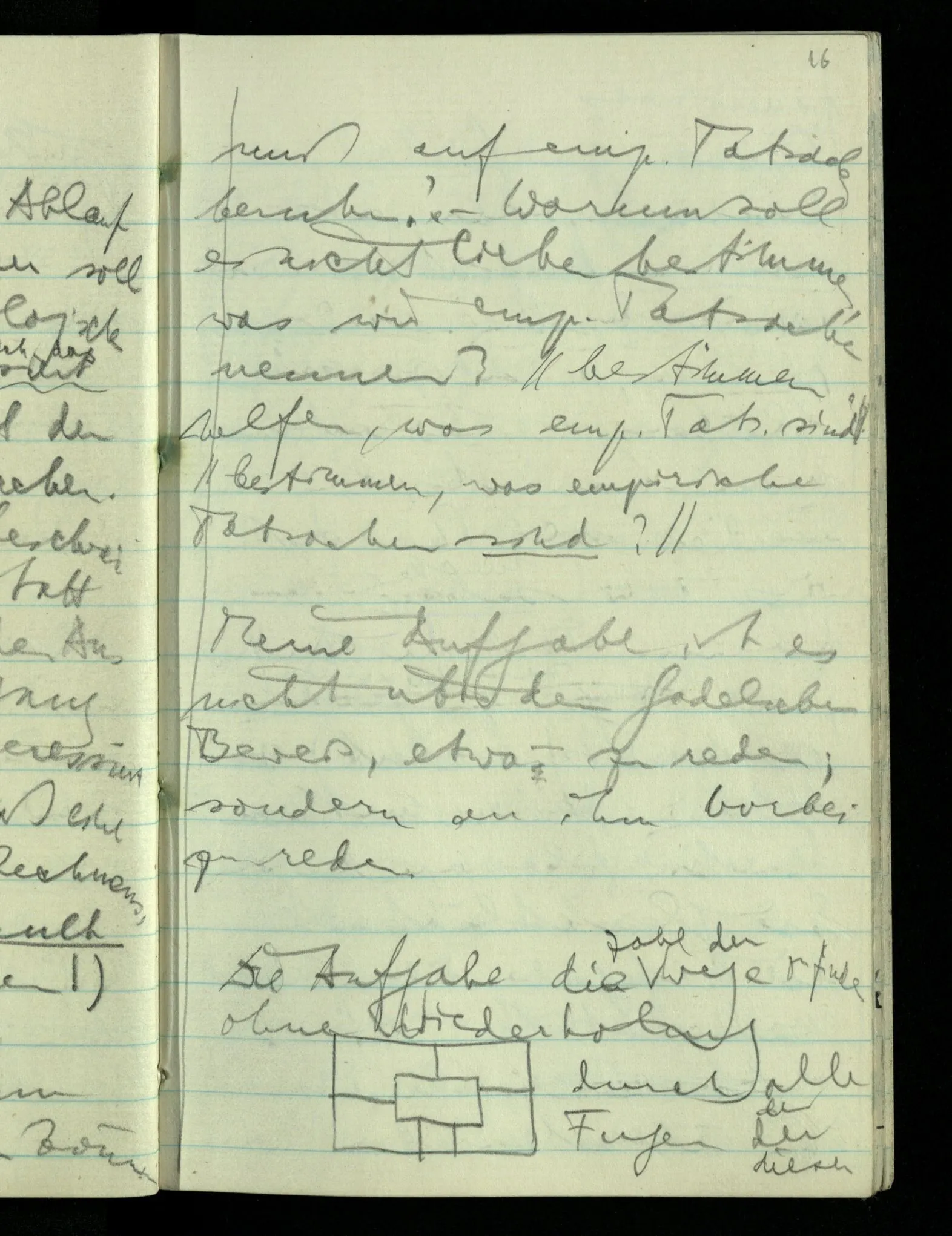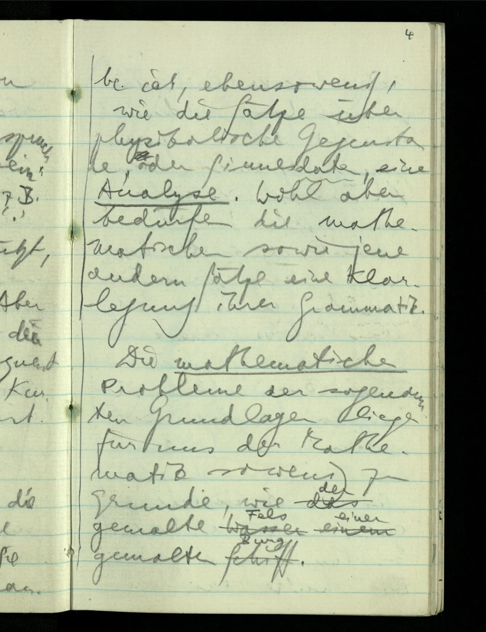 Wozu braucht die Mathematik eine Grundlegung?! Sie braucht sie, glaube ich, ebensowenig, wie die Sätze über physikalische Gegenstände, oder Sinnesdaten, eine Analyse. Wohl aber bedürfen die mathematischen sowie jene andern Sätze einer Klarlegung ihrer Grammatik.