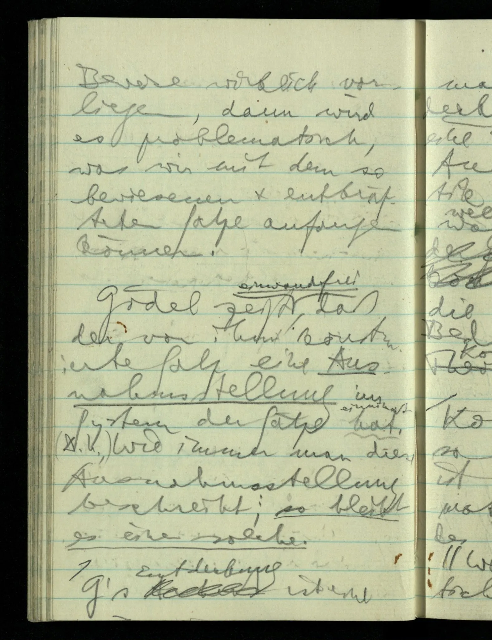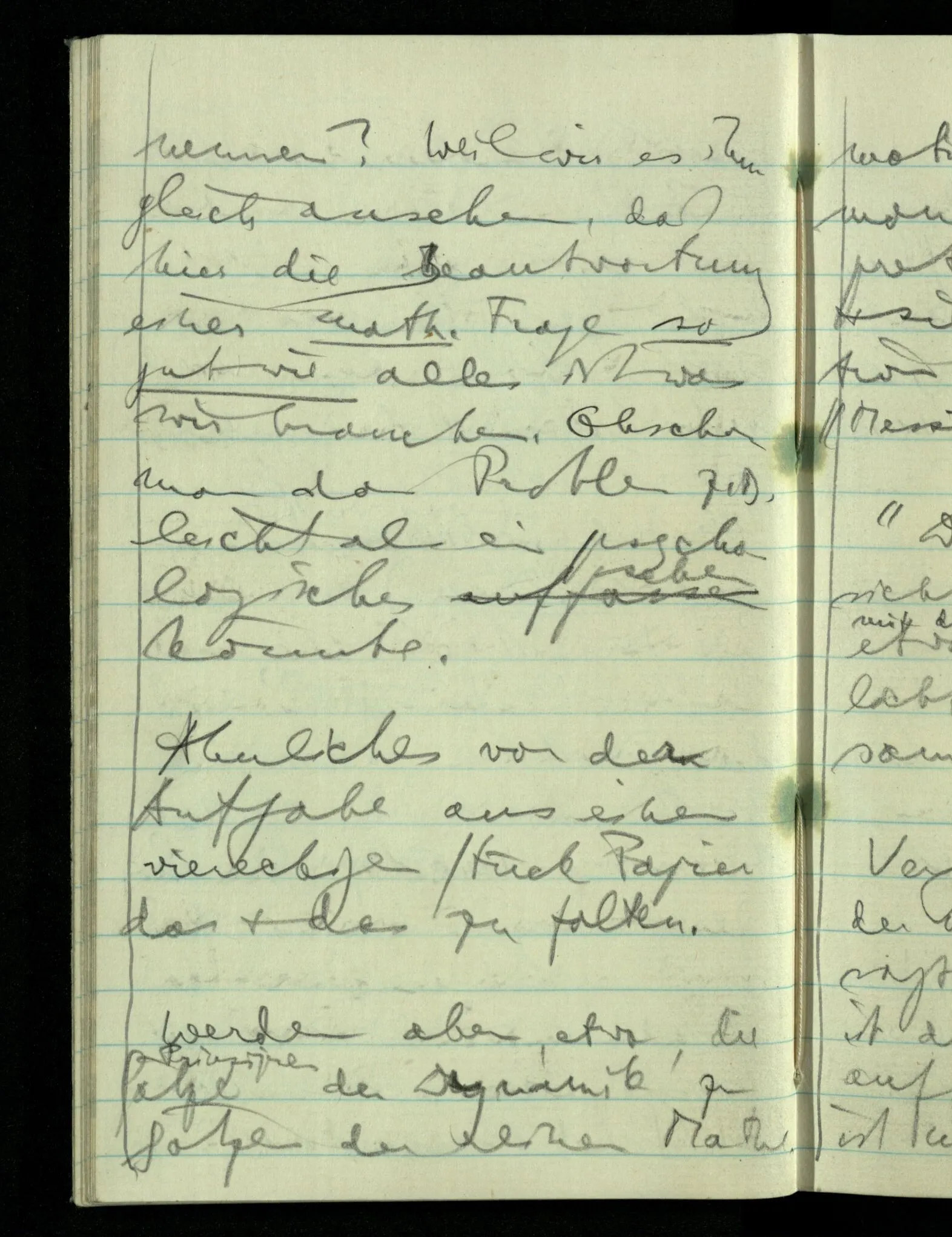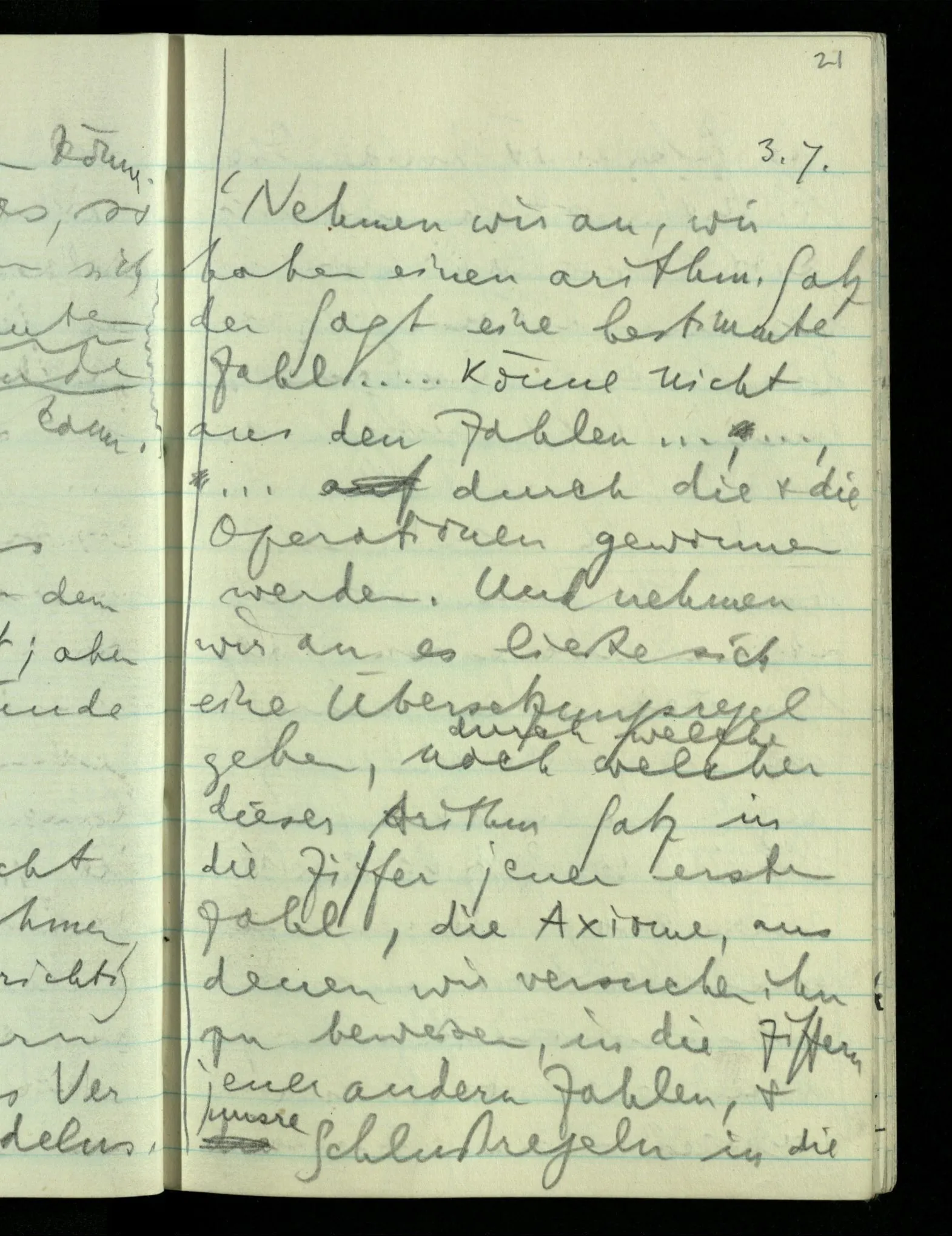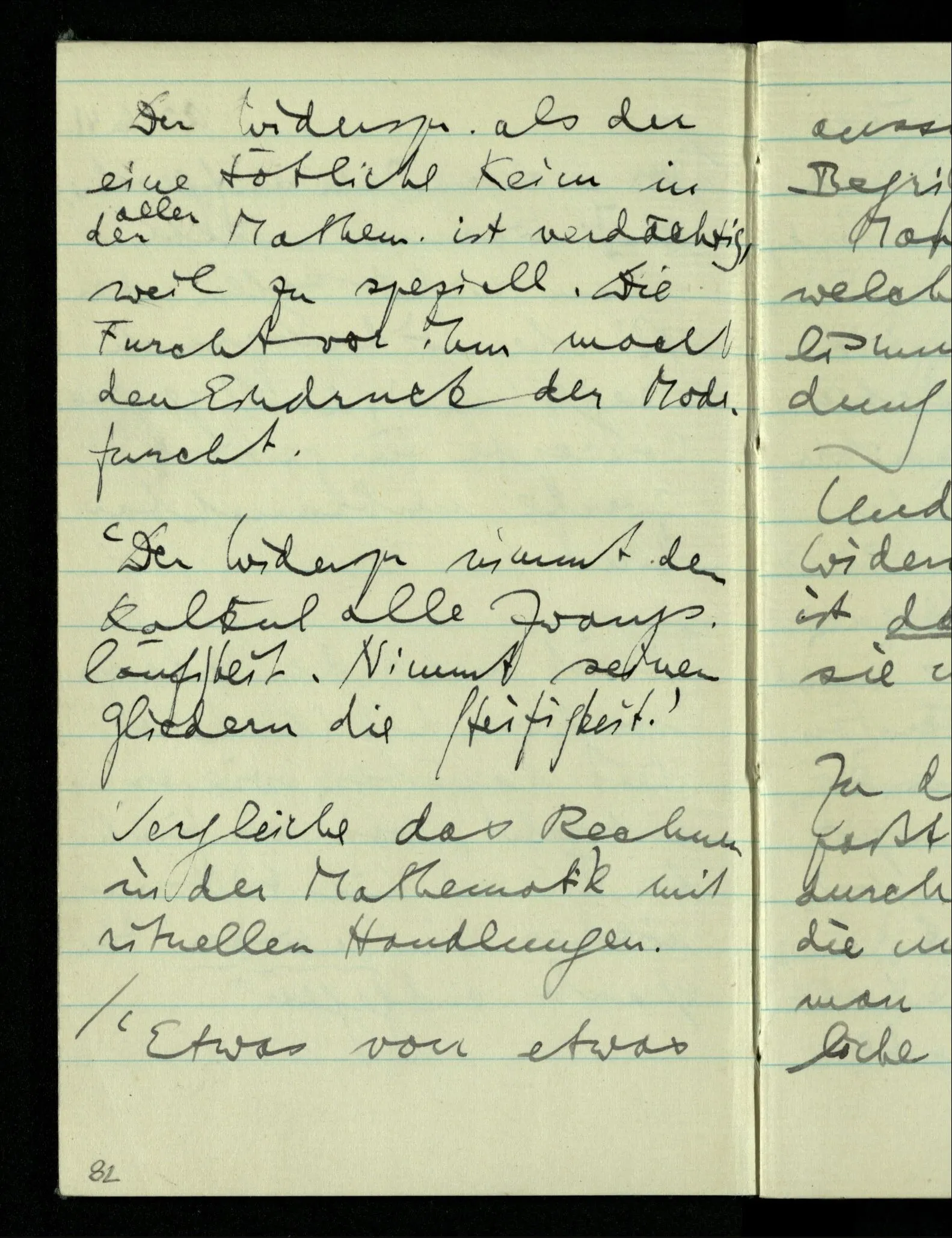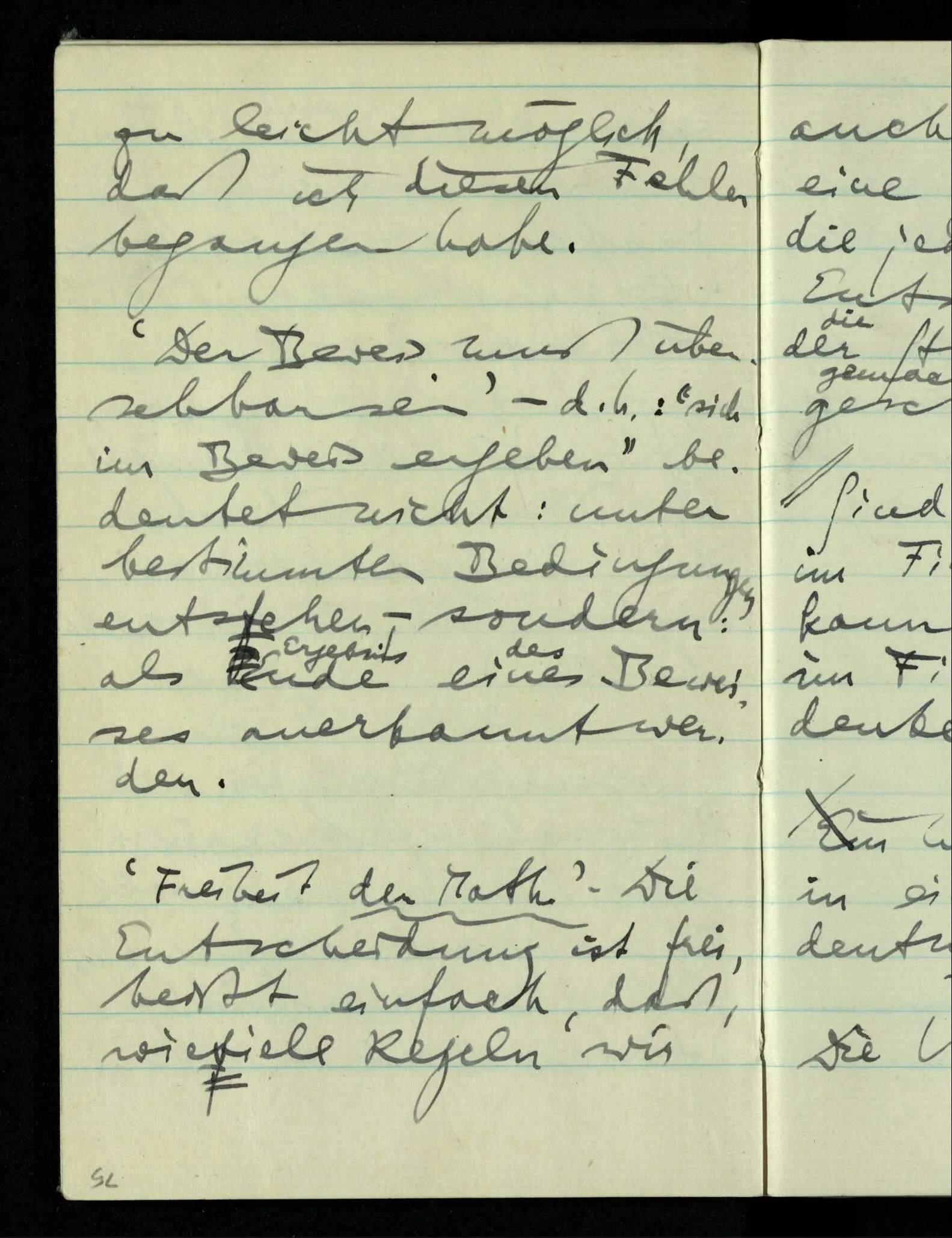 ‘Freiheit der Math.’ – Die Entscheidung ist frei, heißt einfach, daß, wieviele Regeln wir auch geben, wir noch eine geben könnten, die jede beliebige Entscheidung mit der Stufe auf der sie geschieht, erklärt.
