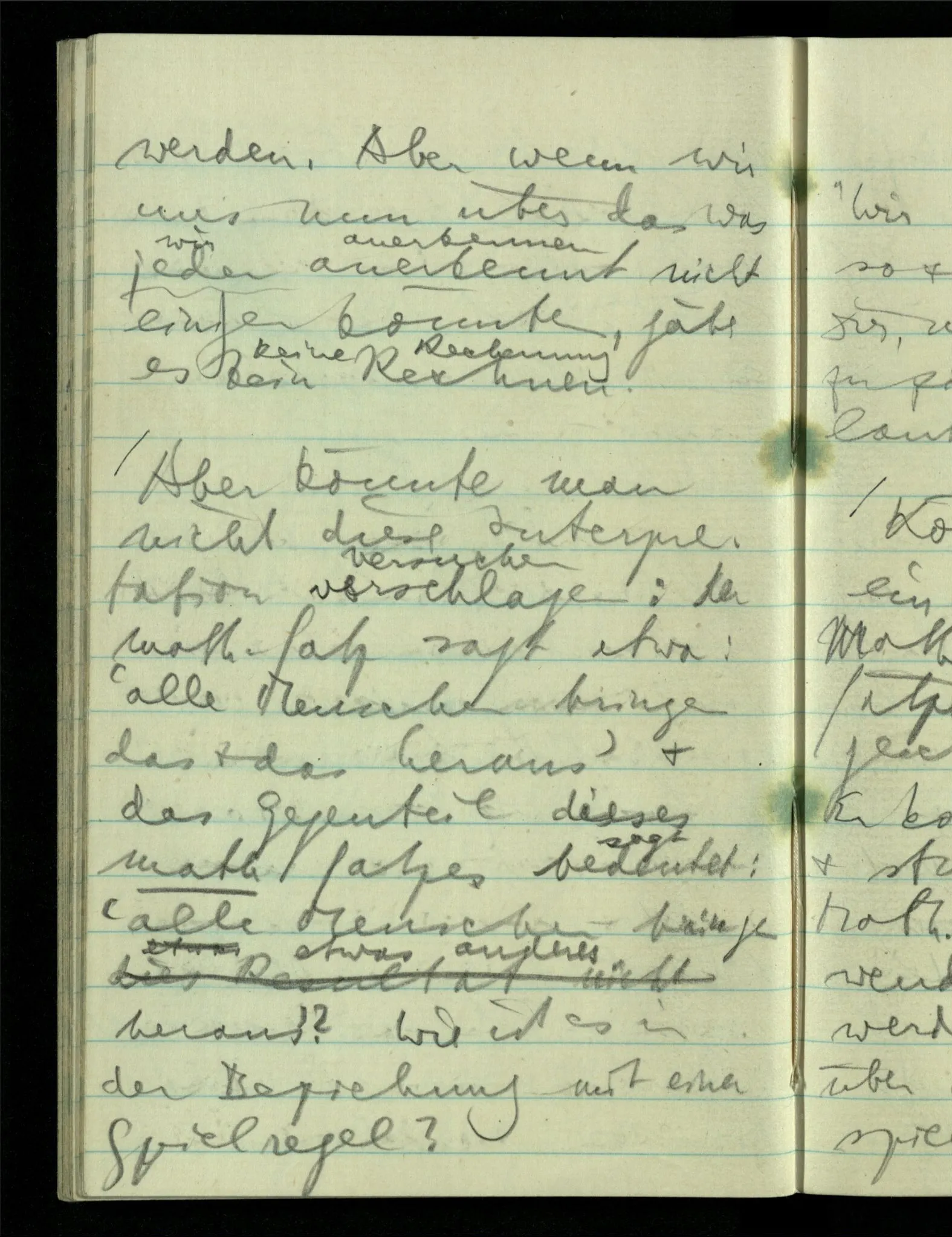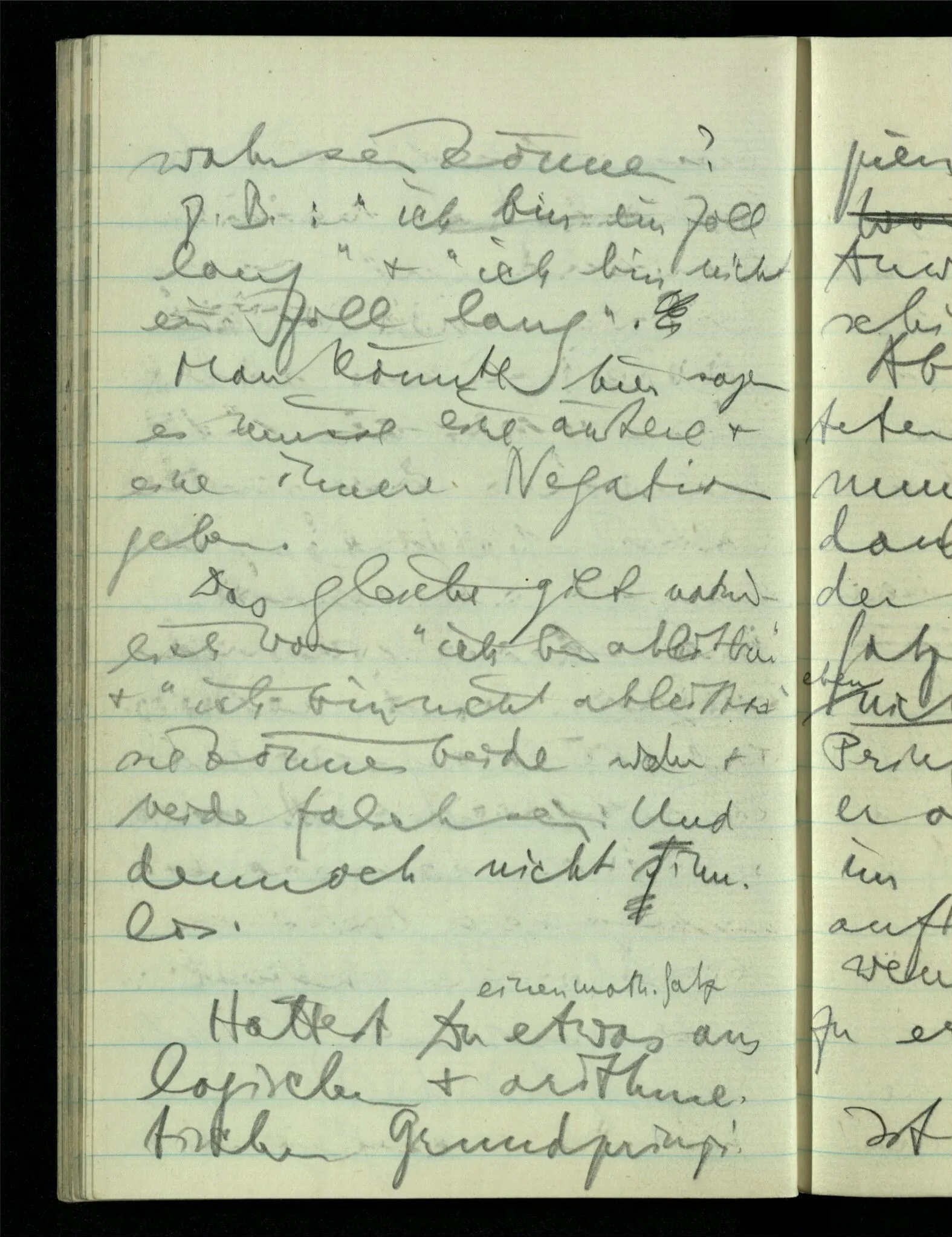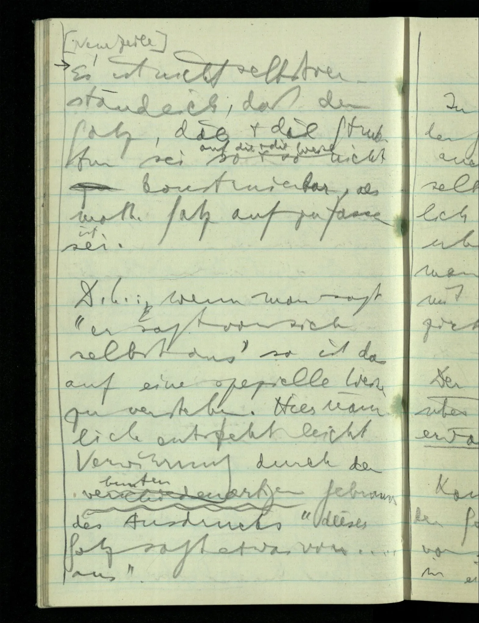 Ein Fehler ist zu vermeiden: Man denkt der Widerspruch muß sinnlos sein: d.h., wenn man z.B. die Zeichen ‘p’, ‘~’, ‘ ∙ ’ konsequent benützt, so kann p ∙ ~p nichts sagen. – Aber denke, was heißt, den & den Gebrauch ‘konsequent fortsetzen’? (‘Diese Kurve konsequent fortsetzen’.)