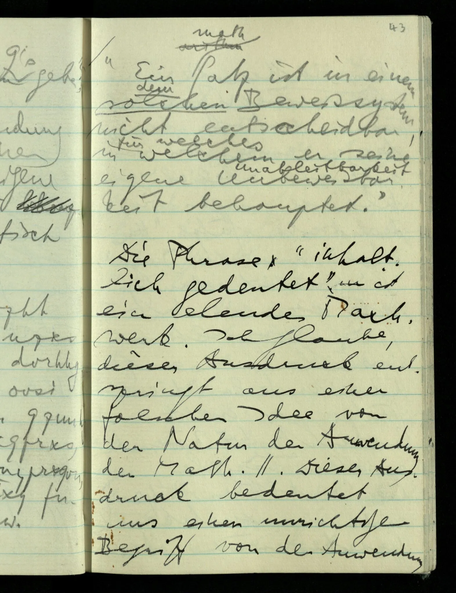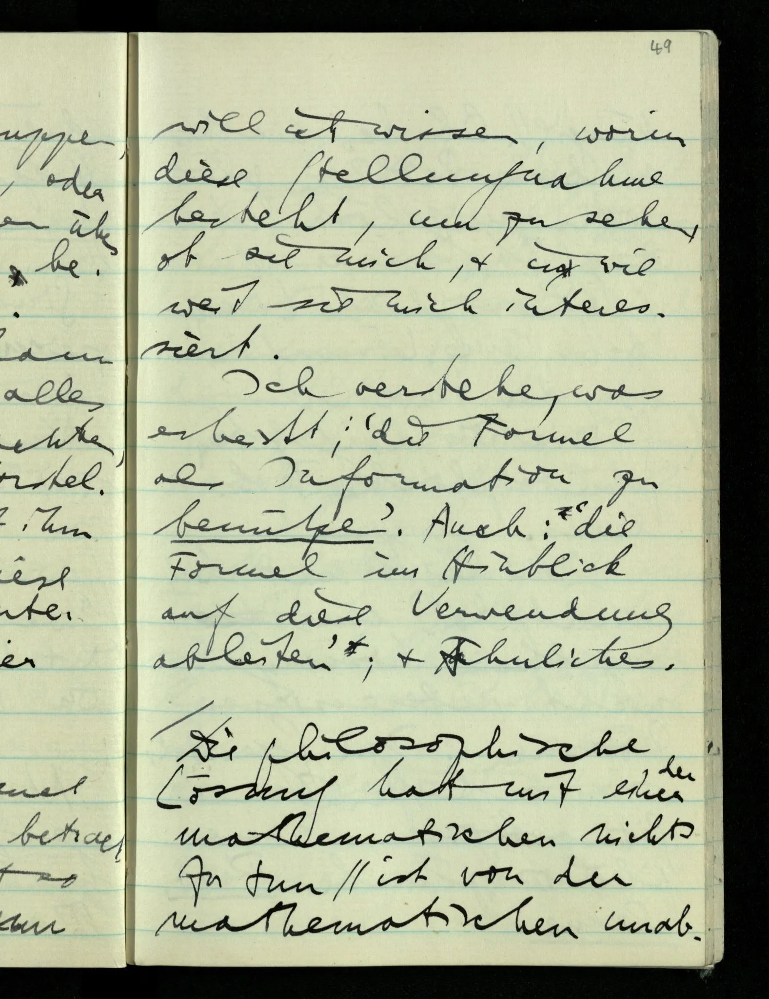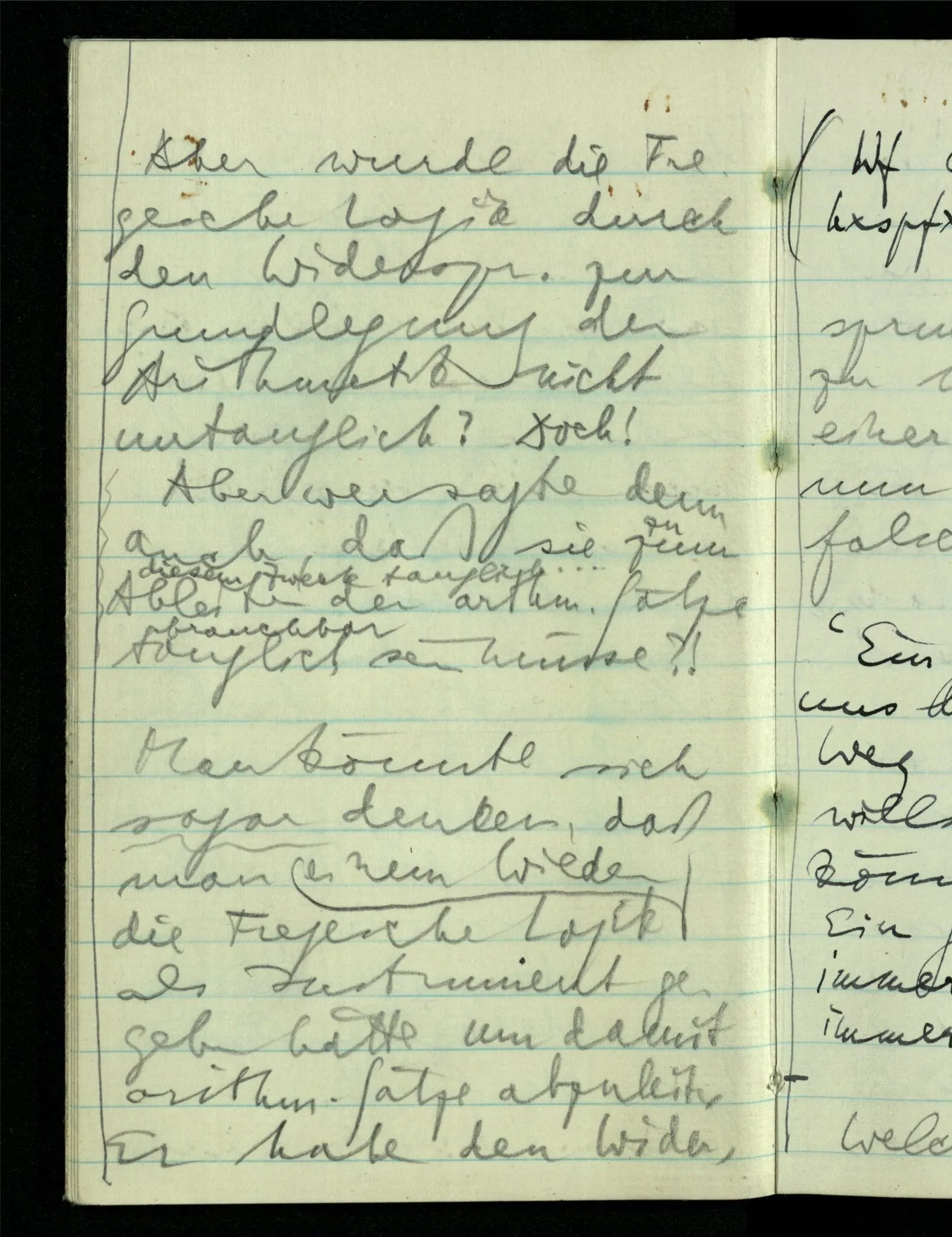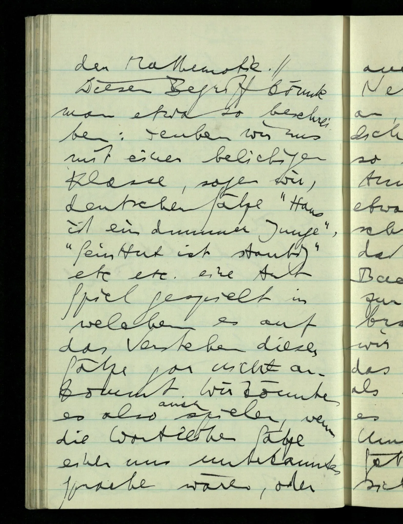Man könnte sich sogar denken, daß man die Fregesche Logik einem Wilden als Instrument gegeben hätte um damit arithm. Sätze abzuleiten. Er habe den Widerspruch abgeleitet, ohne zu merken, daß es einer sei, & aus ihm nun alle möglichen richtigen & falschen Sätze.