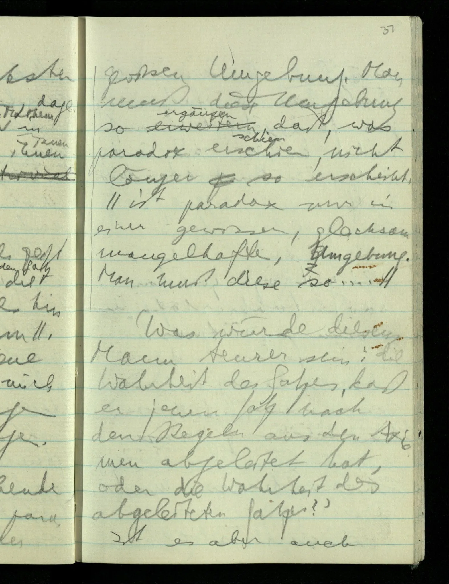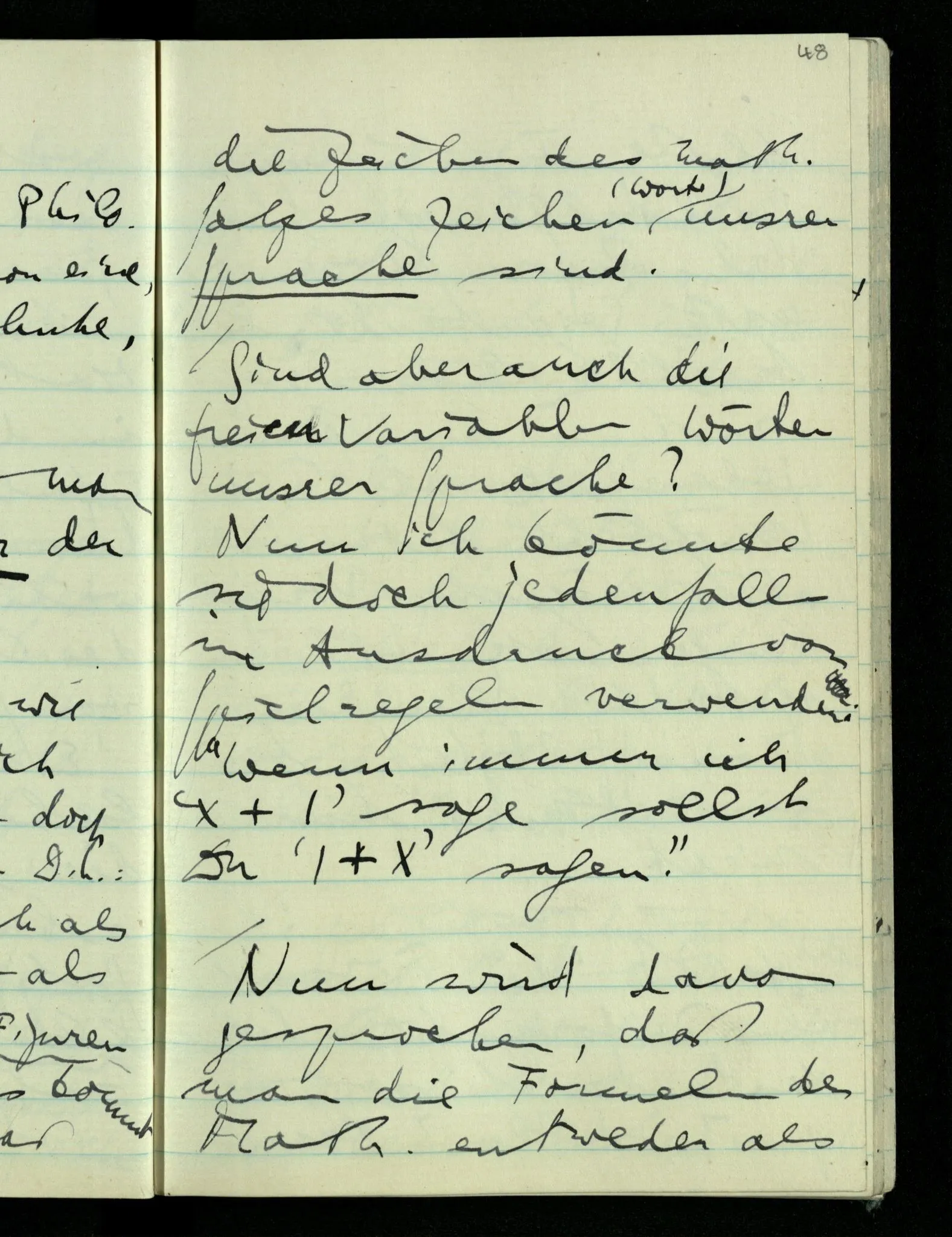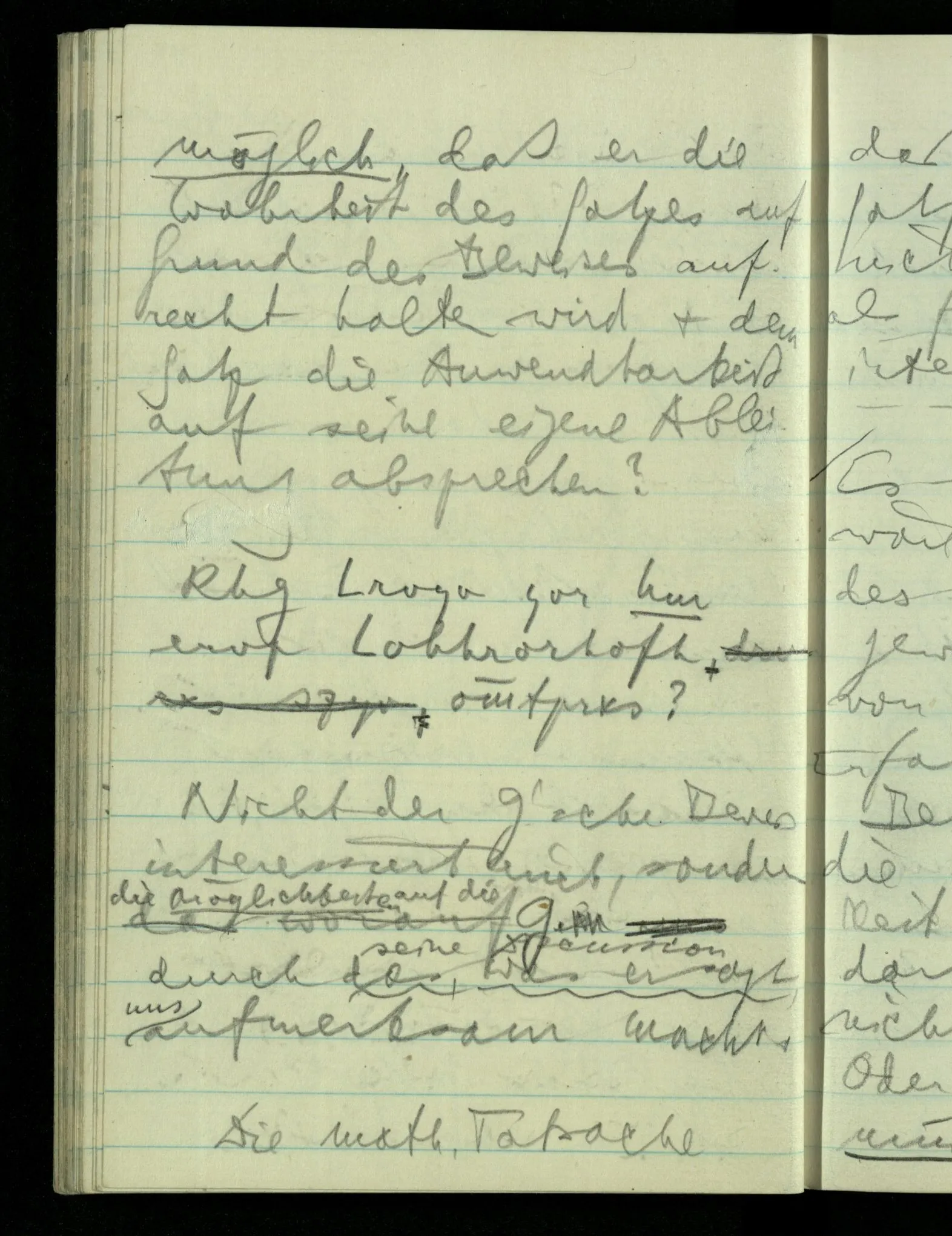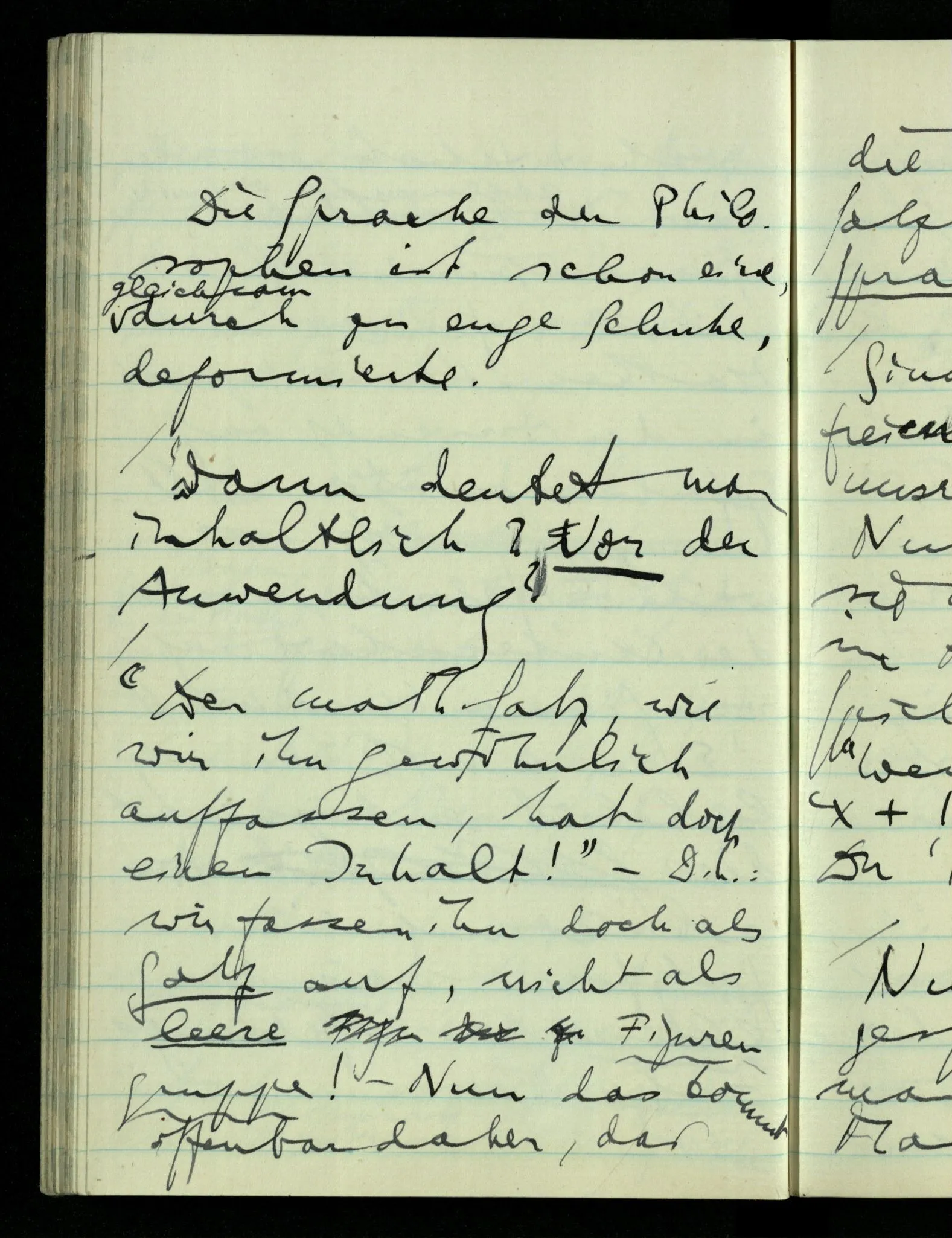 Man könnte sich sogar denken, daß man die Fregesche Logik einem Wilden als Instrument gegeben hätte um damit arithm. Sätze abzuleiten. Er habe den Widerspruch abgeleitet, ohne zu merken, daß es einer sei, & aus ihm nun alle möglichen richtigen & falschen Sätze.