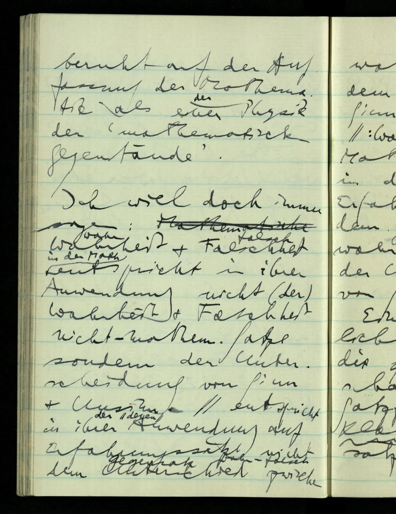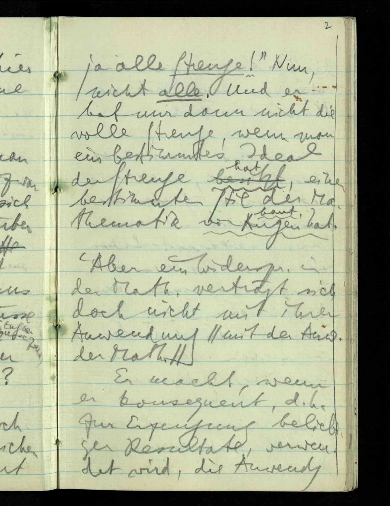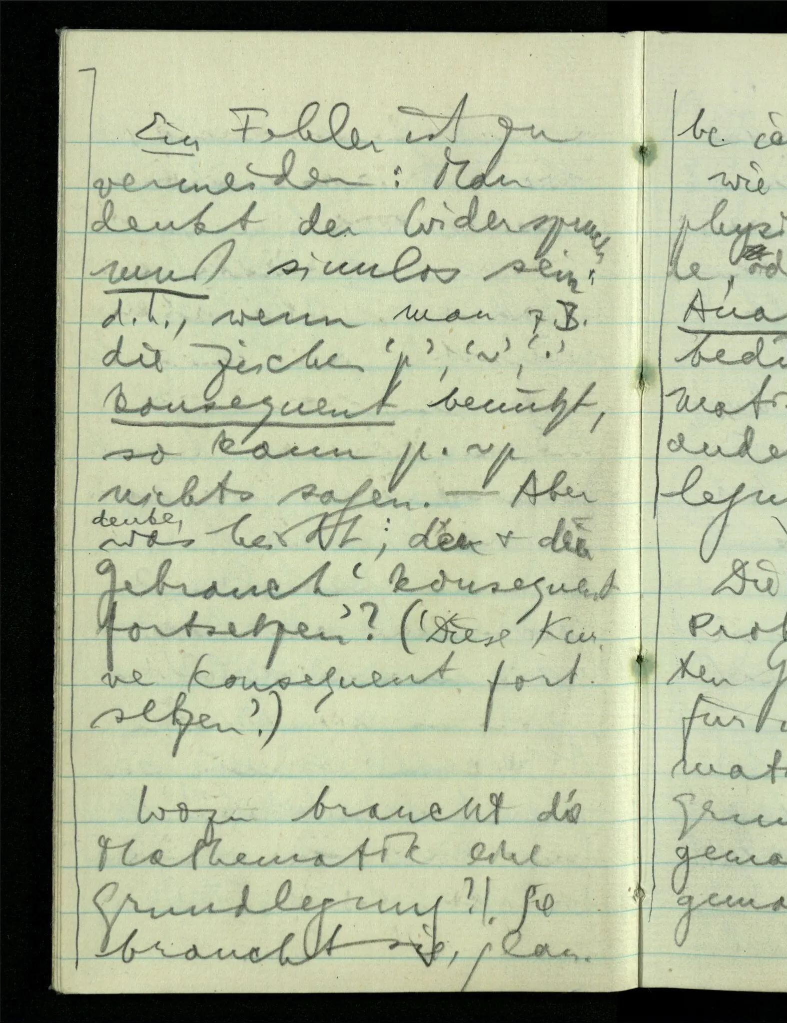 ‘Aber ein Widerspruch in der Math. verträgt sich doch nicht mit ihrer Anwendung. Er macht, wenn er konsequent, d.h. zur Erzeugung beliebiger Resultate, verwendet wird, die Anwendung der Math. zu einer Farce oder zu einer Art überflüssiger Zeremonie.
