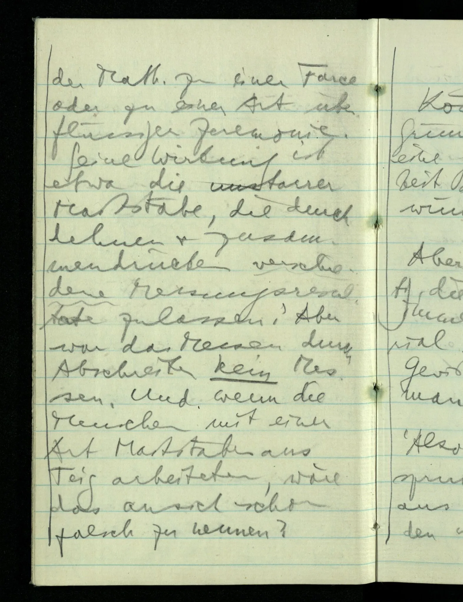 Seine Wirkung ist etwa die unstarrer Maßstäbe, die durch Dehnen & Zusammendrücken verschiedene Messungsresultate zulassen.’ Aber war das Messen durch Abschreiten kein Messen. Und wenn die Menschen mit einer Art Maßstäben aus Teig arbeiteten, wäre das an sich schon falsch zu nennen?