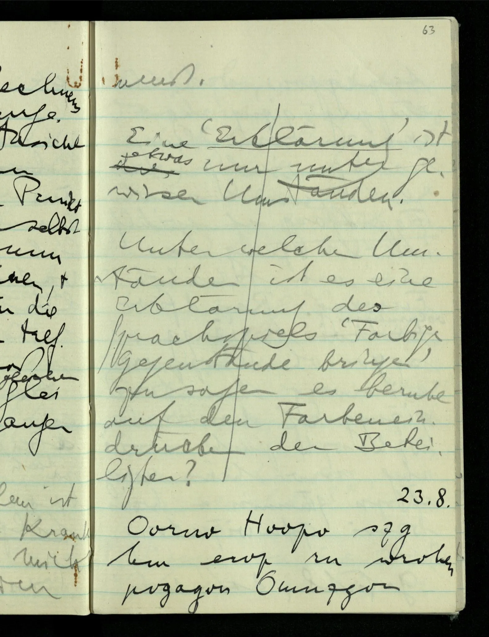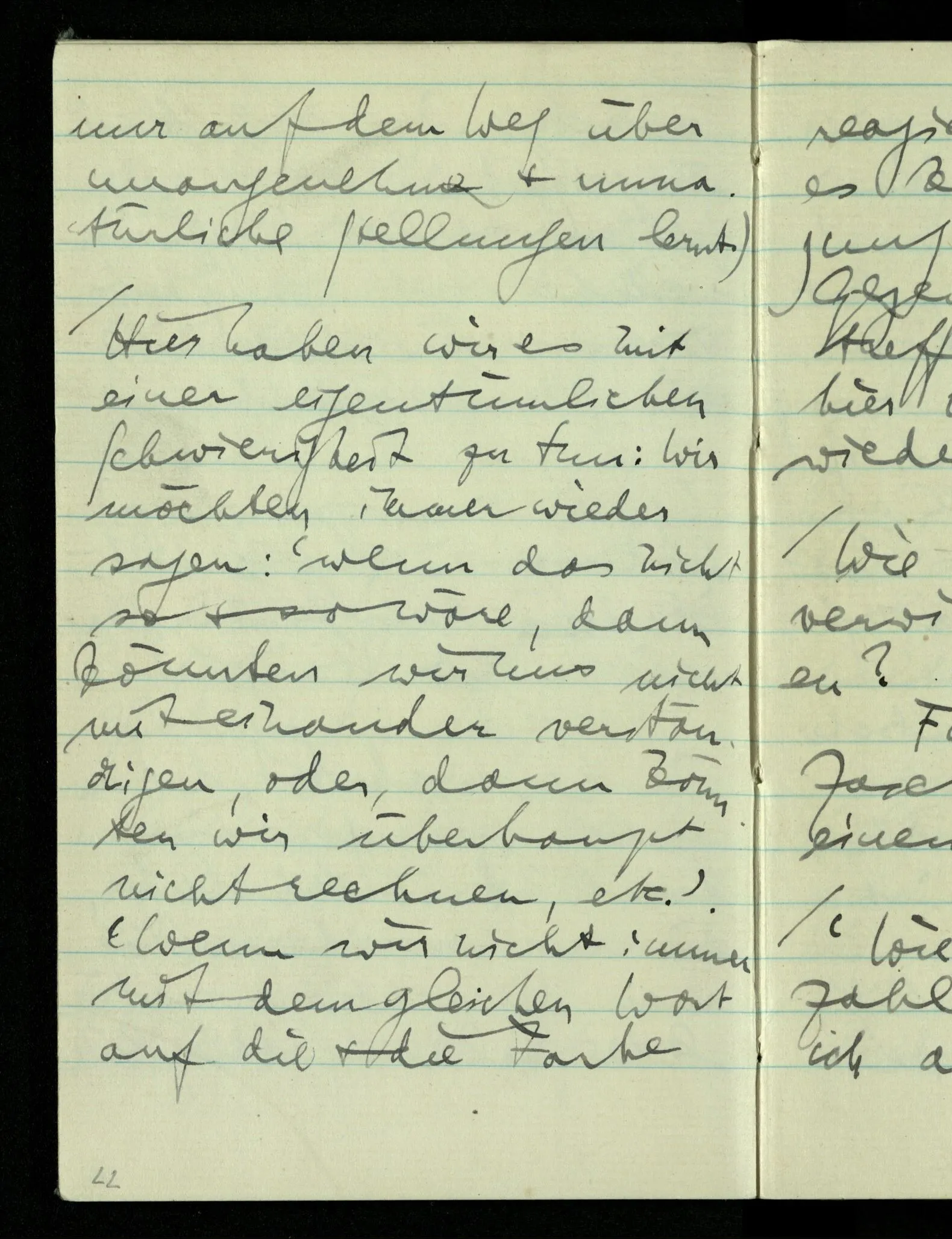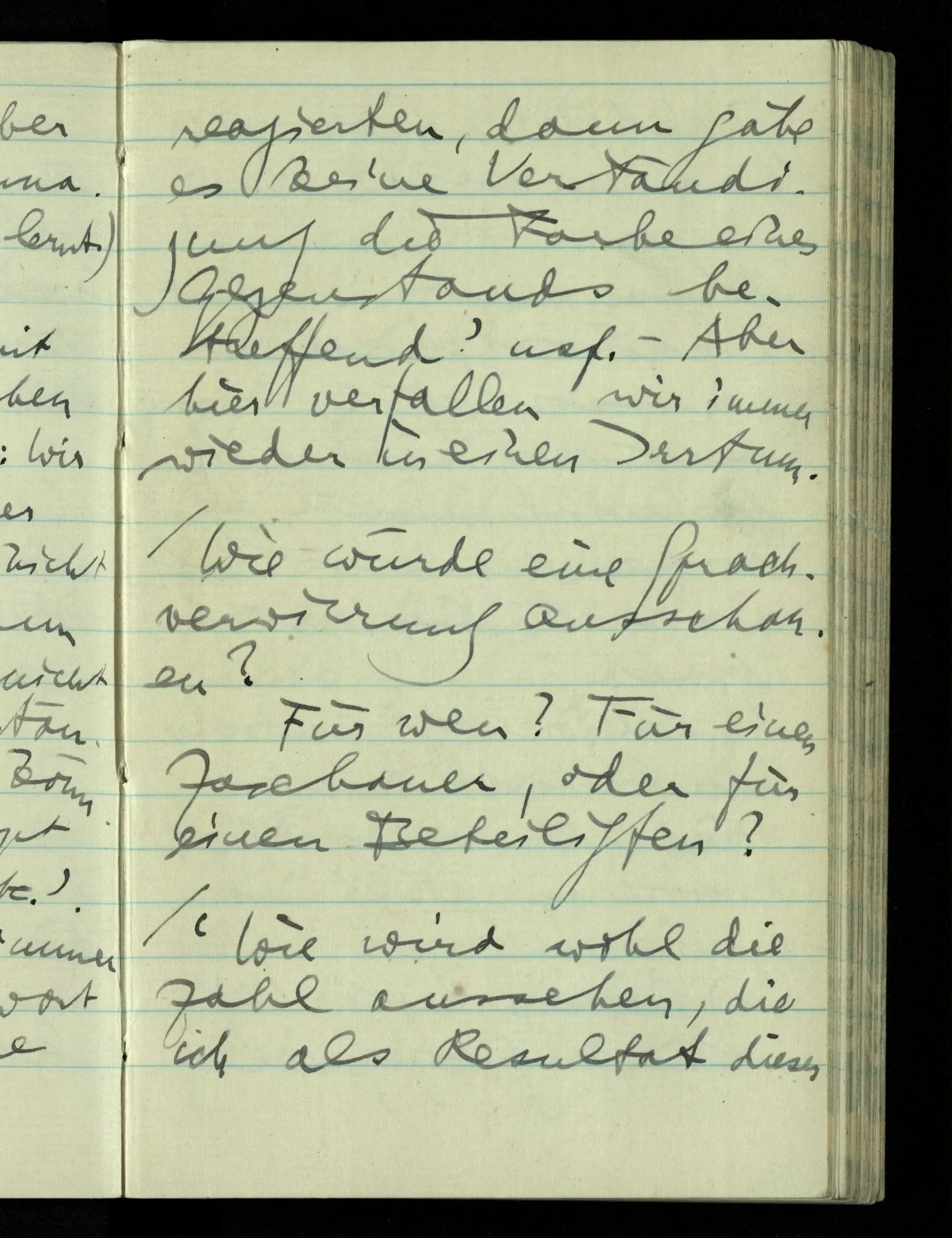 Hier haben wir es mit einer eigentümlichen Schwierigkeit zu tun: Wir möchten immer wieder sagen: ‘wenn das nicht so & so wäre, dann könnten wir uns nicht mit einander verständigen, oder, dann könnten wir überhaupt nicht rechnen, etc.’. ‘Wenn wir nicht immer mit dem gleichen Wort auf die & die Farbe reagierten, dann gäbe es keine Verständigung die Farbe eines Gegenstands betreffend’ u.s.f. – Aber hier verfallen wir immer wieder in einen Irrtum.