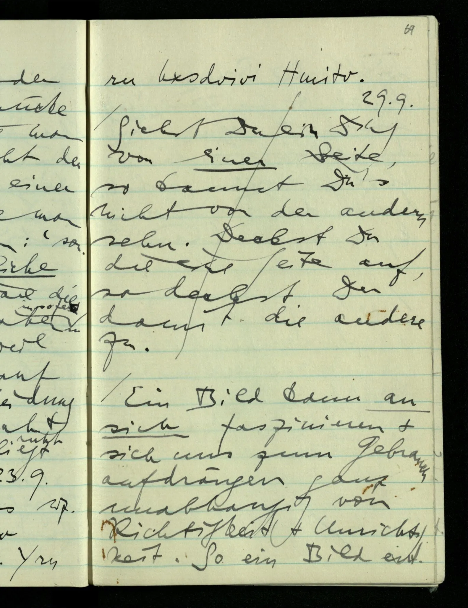 29.09.1941 Siehst Du ein Ding von einer Seite, so kannst Du’s nicht von der andern sehn. Deckst Du die eine Seite auf, so deckst Du damit die andere zu.