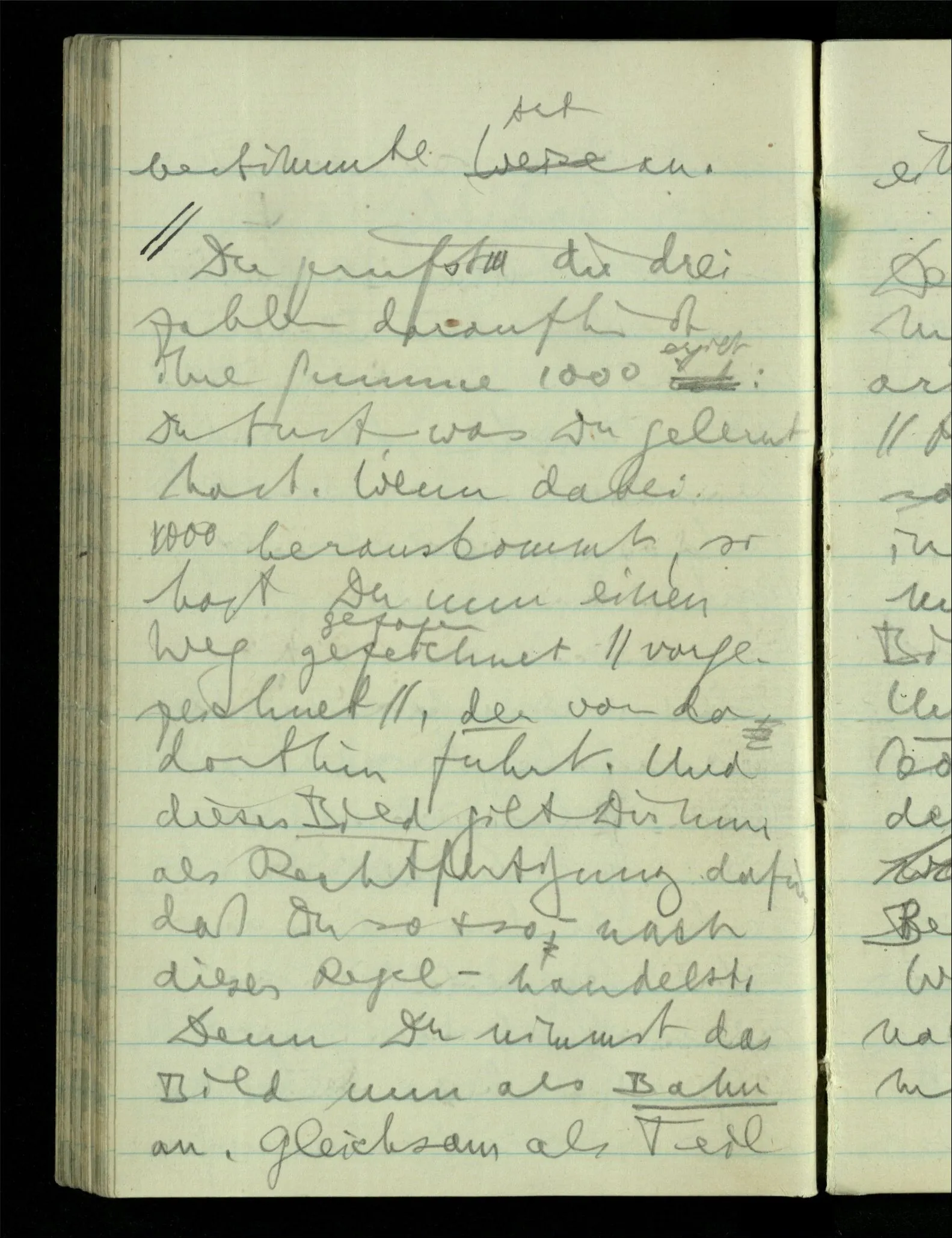Du prüfst die drei Zahlen daraufhin ob ihre Summe 1000 ergibt: Du tust was Du gelernt hast. Wenn dabei 1000 herauskommt, so hast Du nun einen Weg gezeichnet, der von da dorthin führt. Und dieses Bild gilt Dir nun als Rechtfertigung dafür daß Du so & so – nach dieser Regel – handelst. Denn Du nimmst das Bild nun als Bahn an. Gleichsam als Teil eines Eisenbahnnetzes.