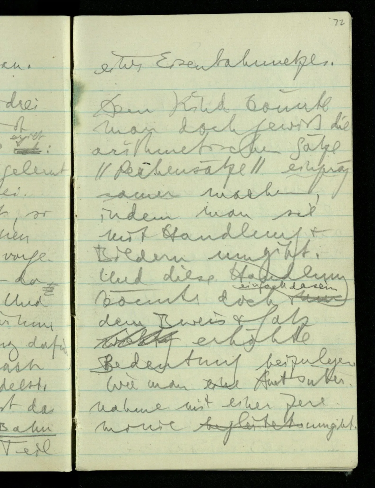 Dem Kind könnte man doch gewiß die arithmetischen Sätze einprägsamer machen, indem man sie mit Handlung & Bildern umgibt. Und diese Handlung könnte doch einfach dasein dem Beweis & Satz erhöhte Bedeutung beizulegen. Wie man eine Amtsübernahme mit einer Zeremonie umgibt.