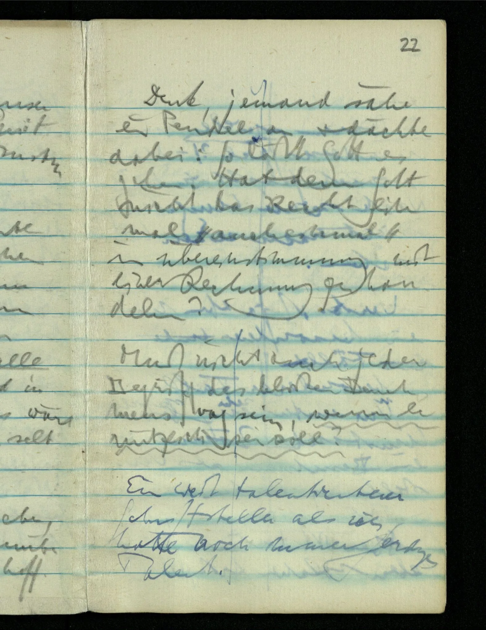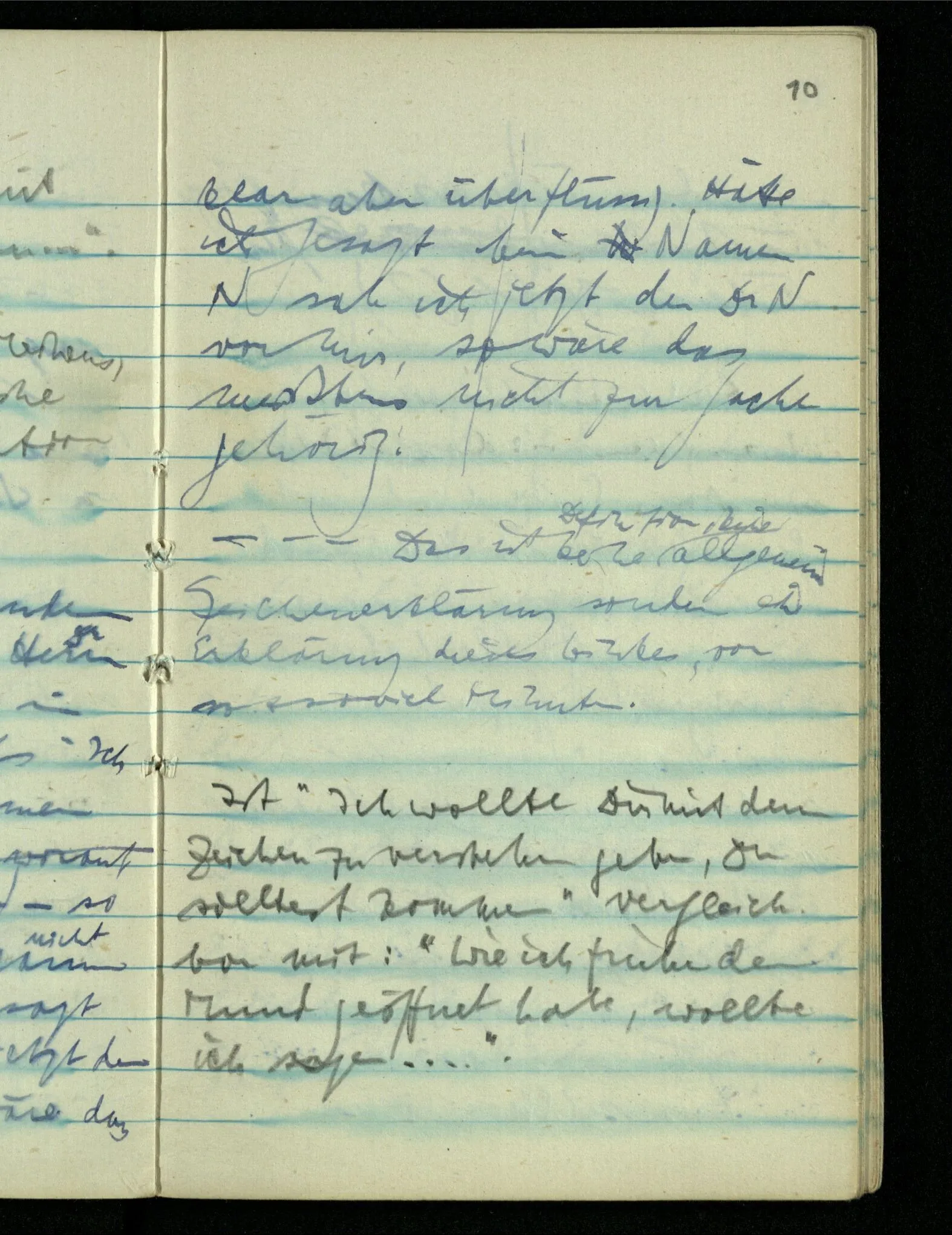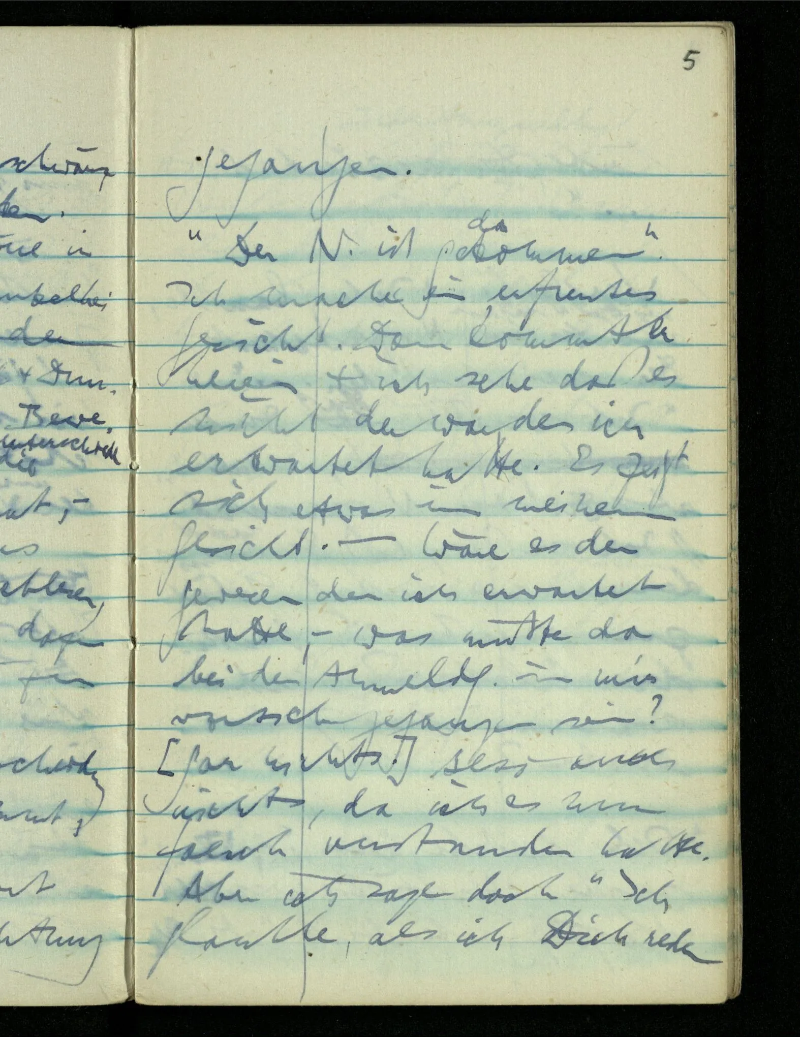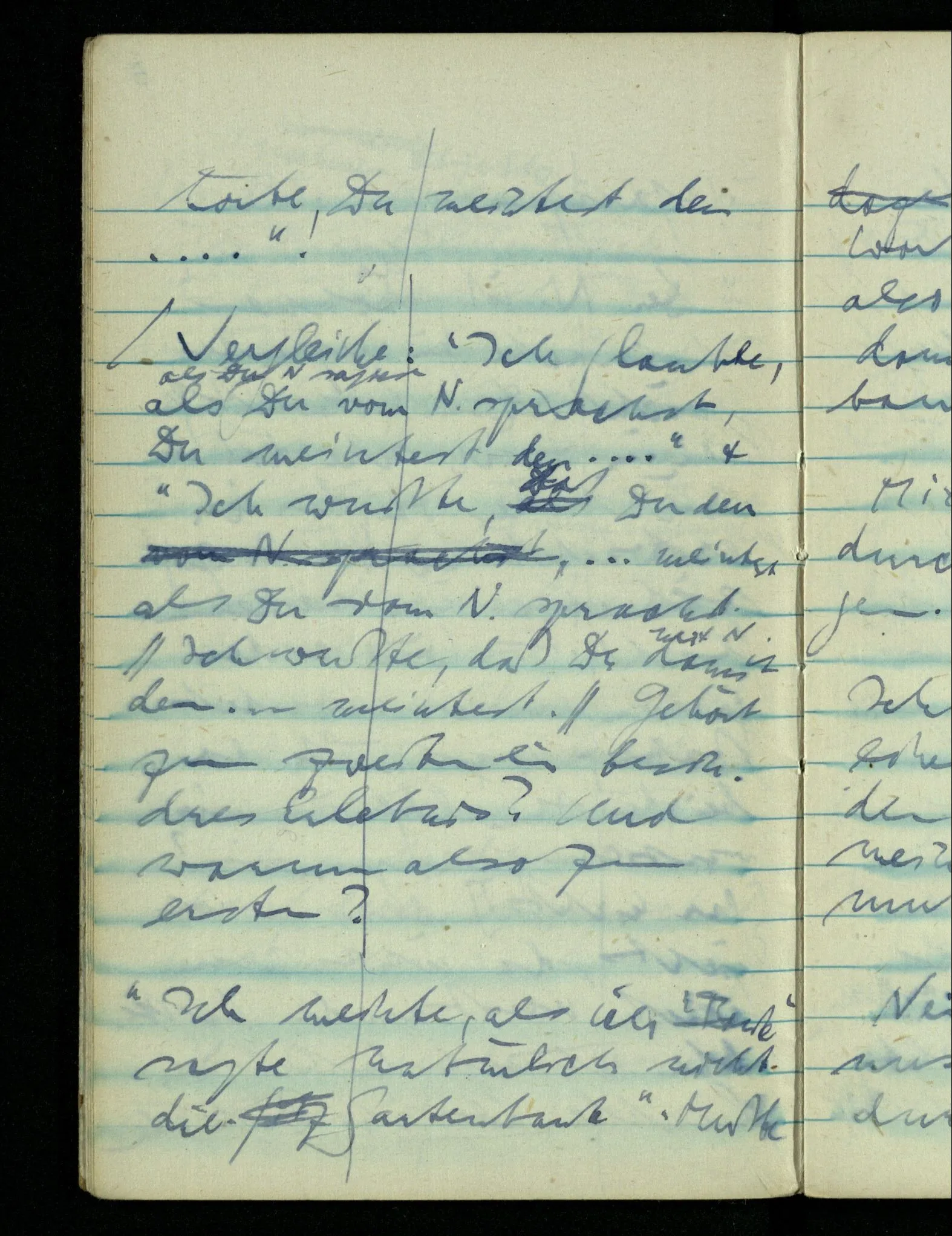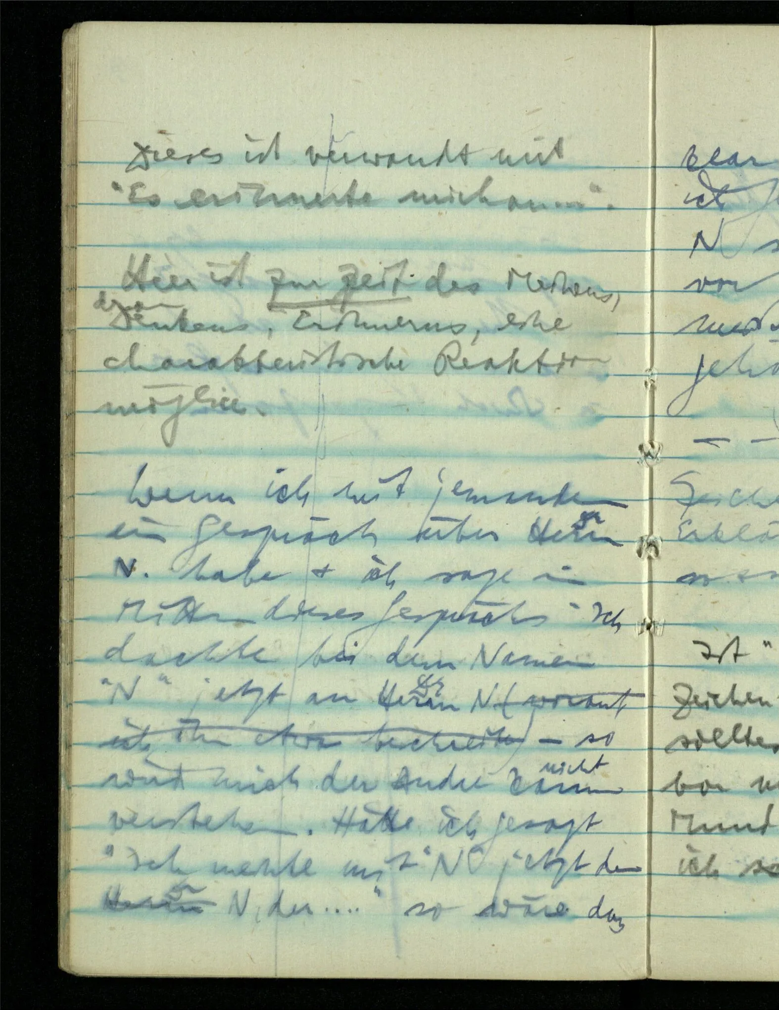“Der N. ist gekommen”. Ich mache ein erfreutes Gesicht. Dann kommt er herein & ich sehe daß es nicht den war den ich erwartet hätte. Es zeigt sich etwas in meinem Gesicht. – Wäre es den gewesen den ich erwartet hatte, – was müßte da bei der Anmeldung in mir vor sich gegangen sein? [Gar nichts.] Also auch nichts, da ich es nun falsch verstanden hatte. Aber ich sage doch “Ich glaubte, als ich Dich reden hörte, Du meintest dein …”!