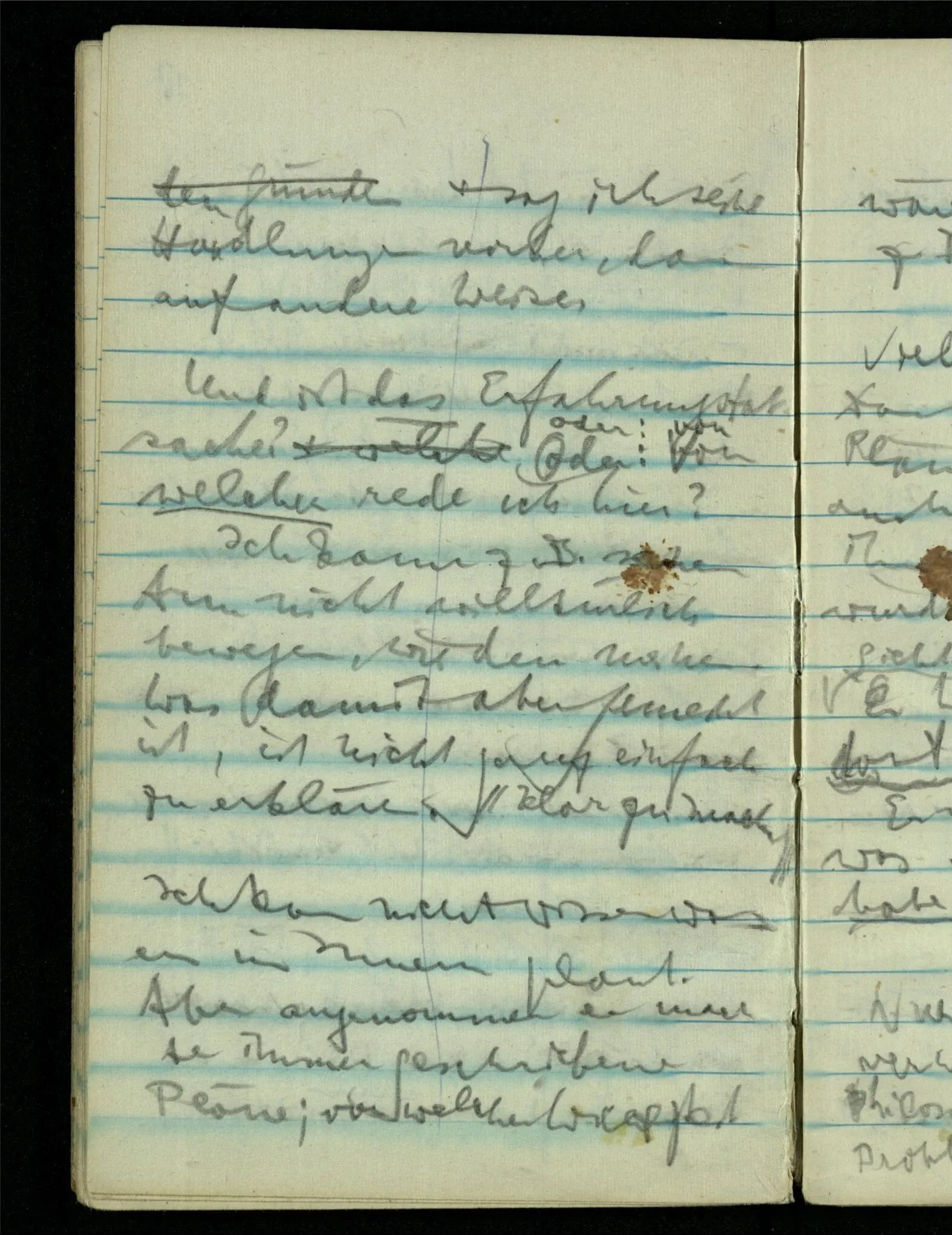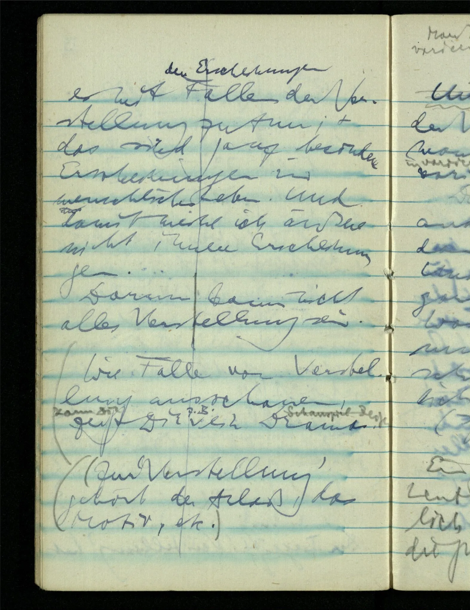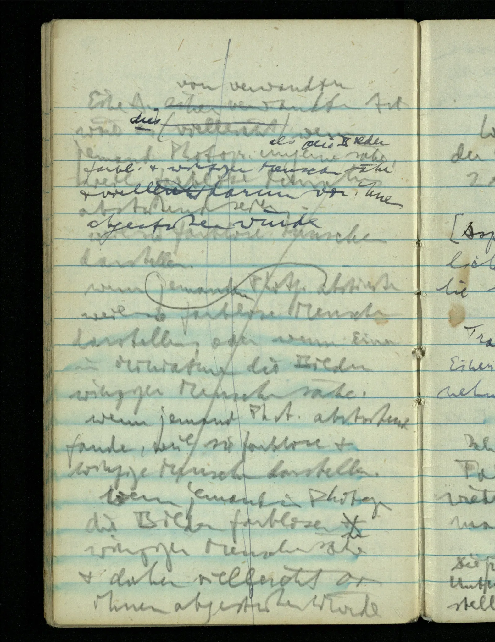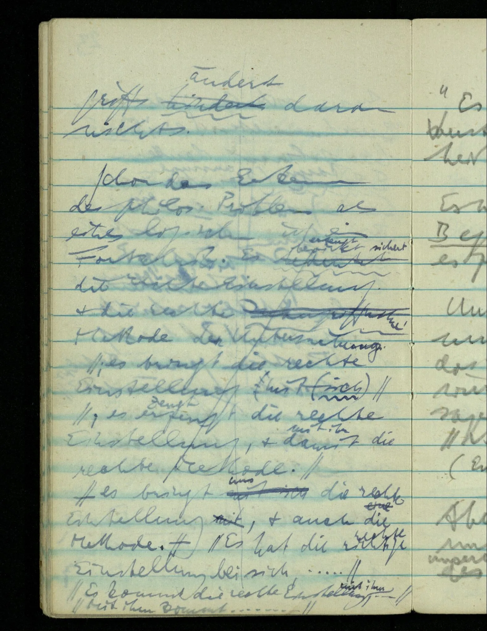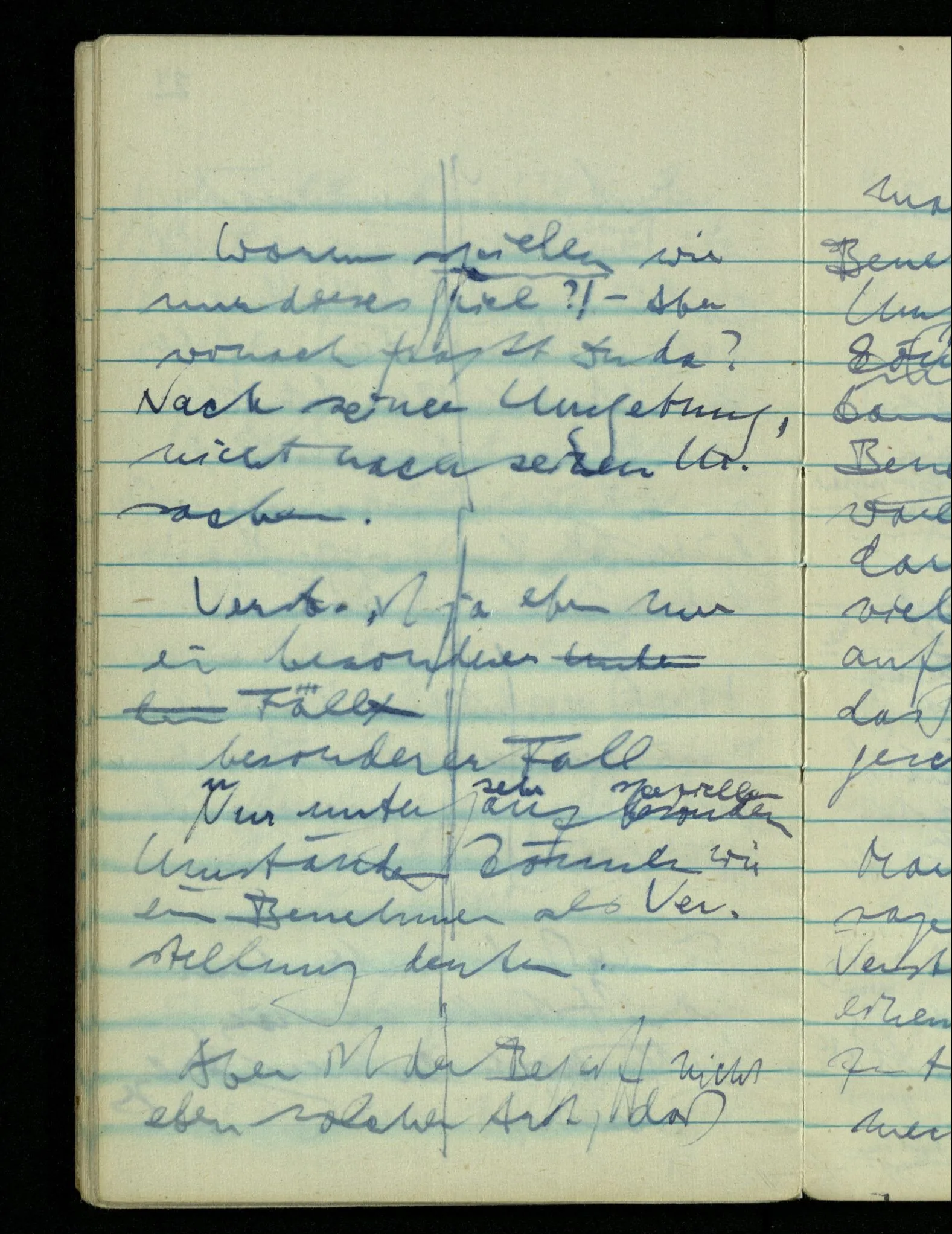 “Der N. ist gekommen”. Ich mache ein erfreutes Gesicht. Dann kommt er herein & ich sehe daß es nicht den war den ich erwartet hätte. Es zeigt sich etwas in meinem Gesicht. – Wäre es den gewesen den ich erwartet hatte, – was müßte da bei der Anmeldung in mir vor sich gegangen sein? [Gar nichts.] Also auch nichts, da ich es nun falsch verstanden hatte. Aber ich sage doch “Ich glaubte, als ich Dich reden hörte, Du meintest dein …”!