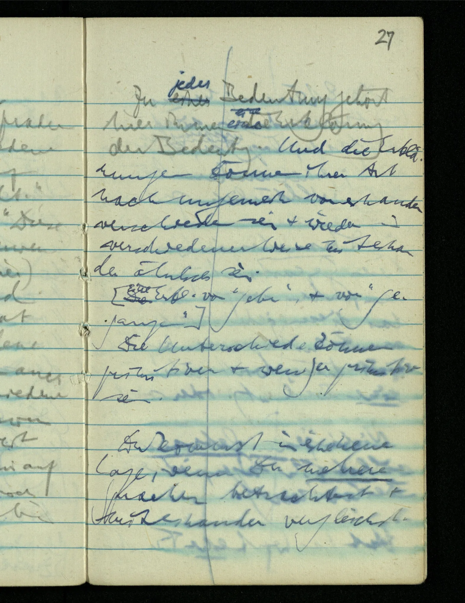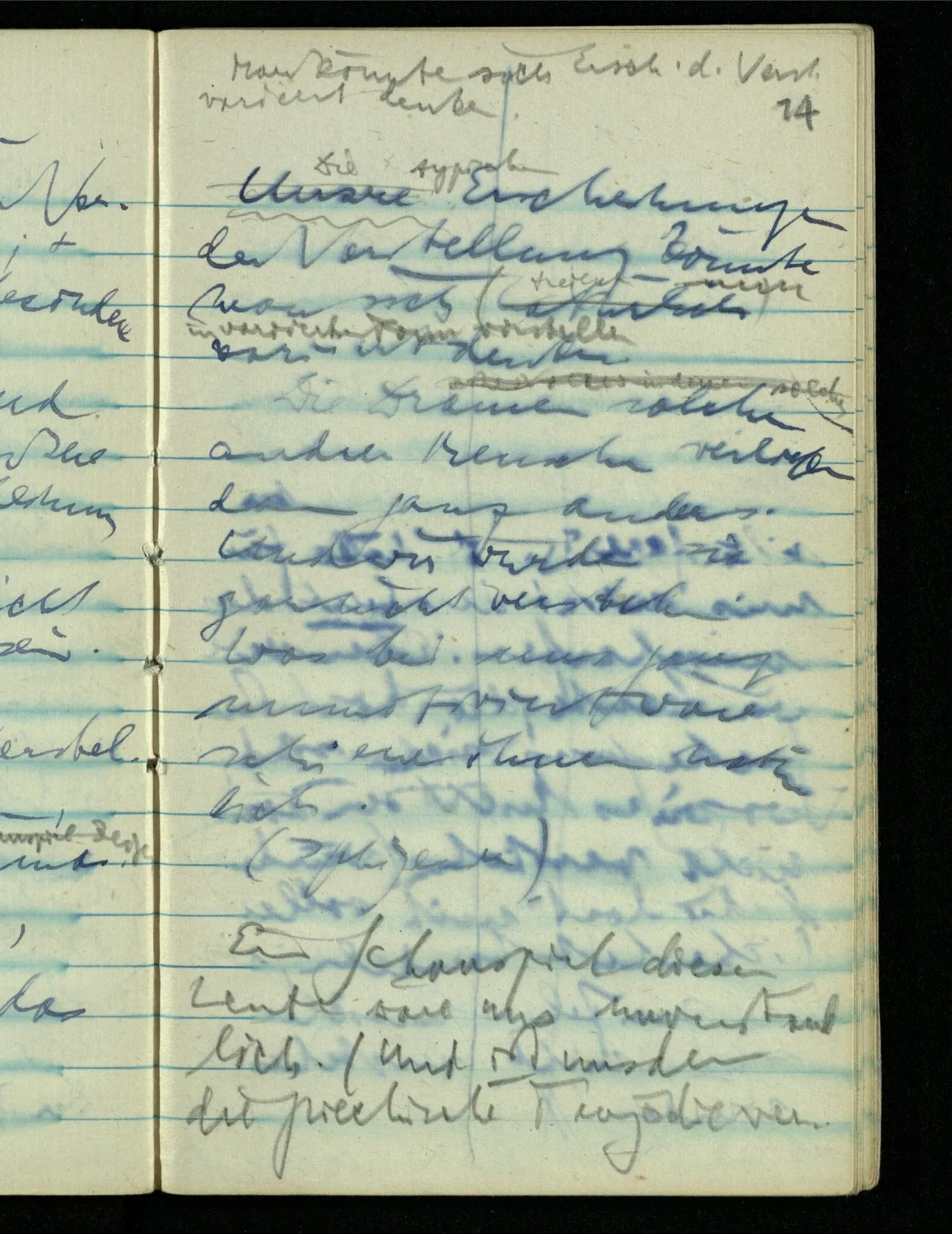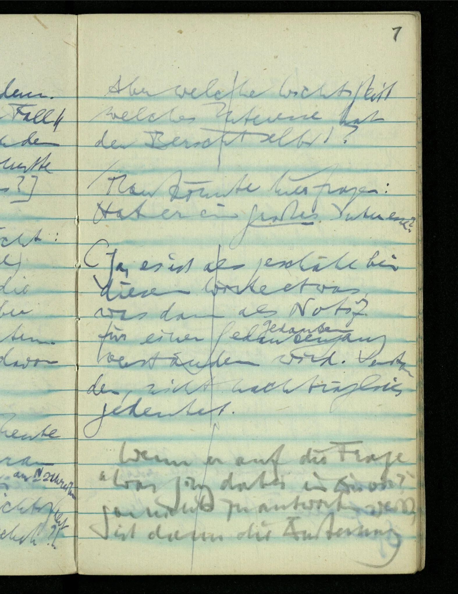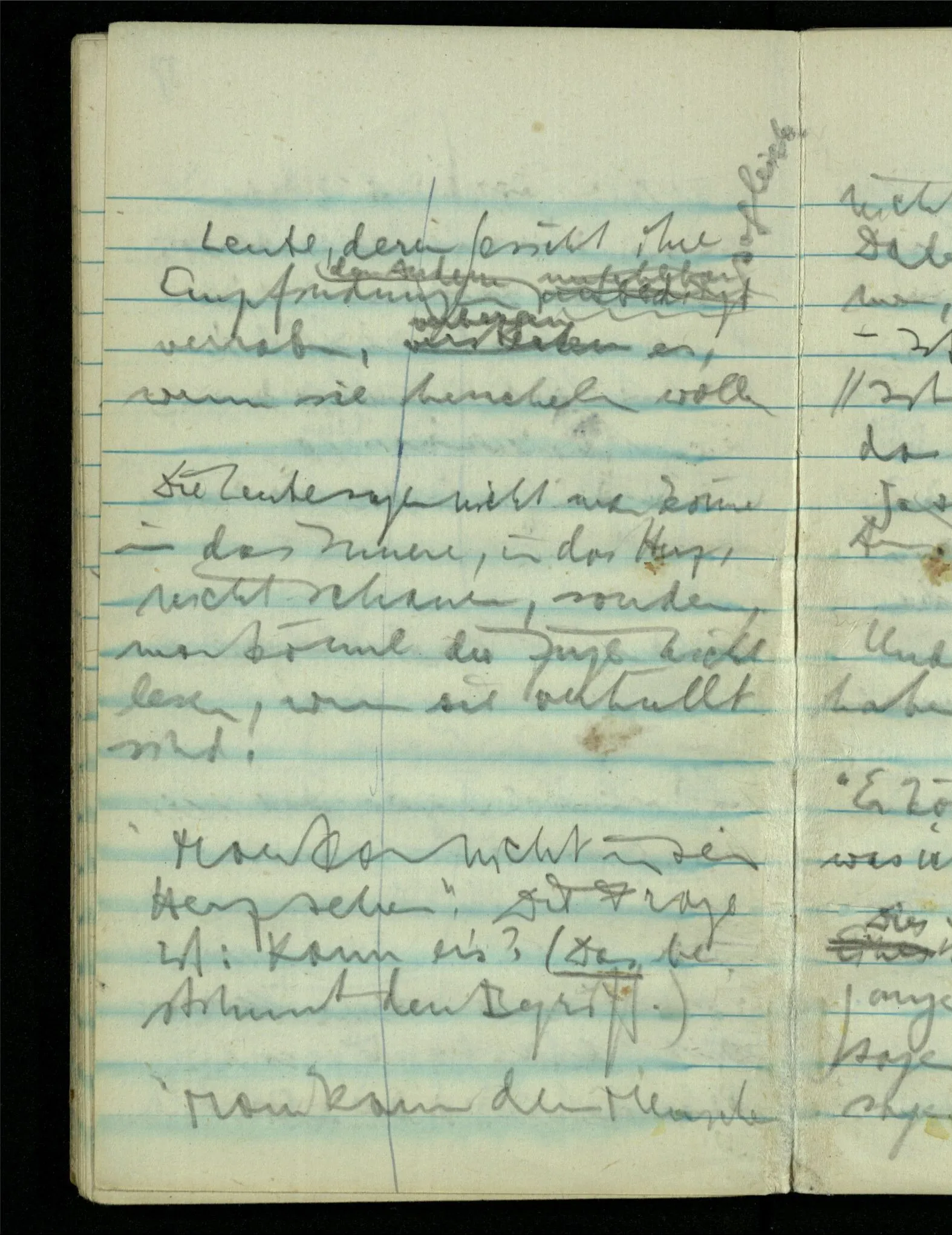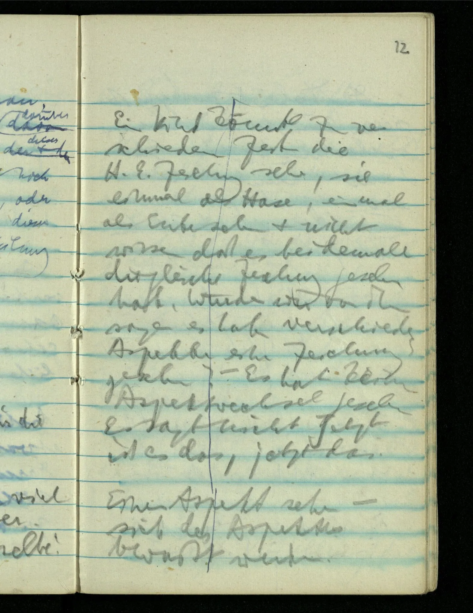 “Der N. ist gekommen”. Ich mache ein erfreutes Gesicht. Dann kommt er herein & ich sehe daß es nicht den war den ich erwartet hätte. Es zeigt sich etwas in meinem Gesicht. – Wäre es den gewesen den ich erwartet hatte, – was müßte da bei der Anmeldung in mir vor sich gegangen sein? [Gar nichts.] Also auch nichts, da ich es nun falsch verstanden hatte. Aber ich sage doch “Ich glaubte, als ich Dich reden hörte, Du meintest dein …”!
