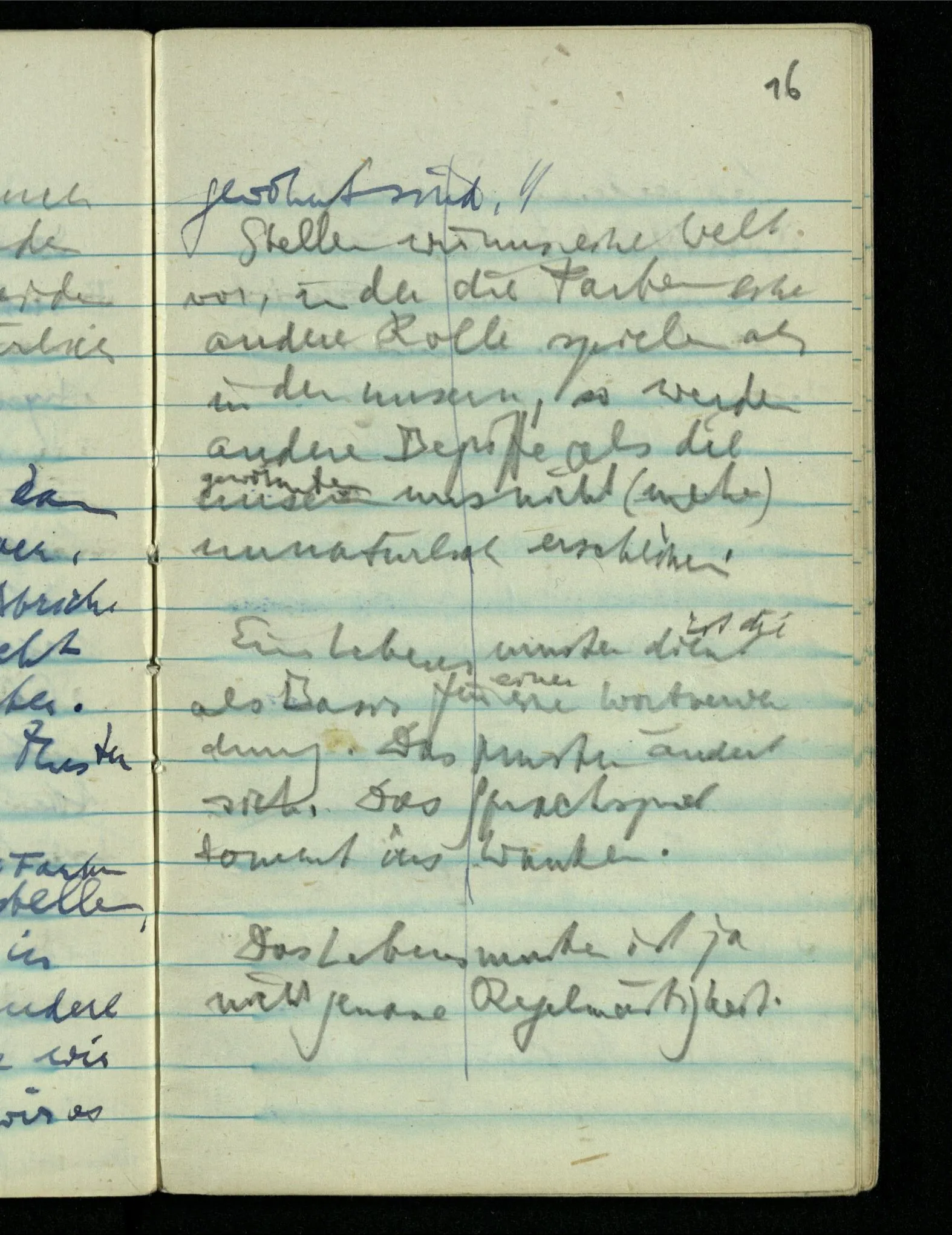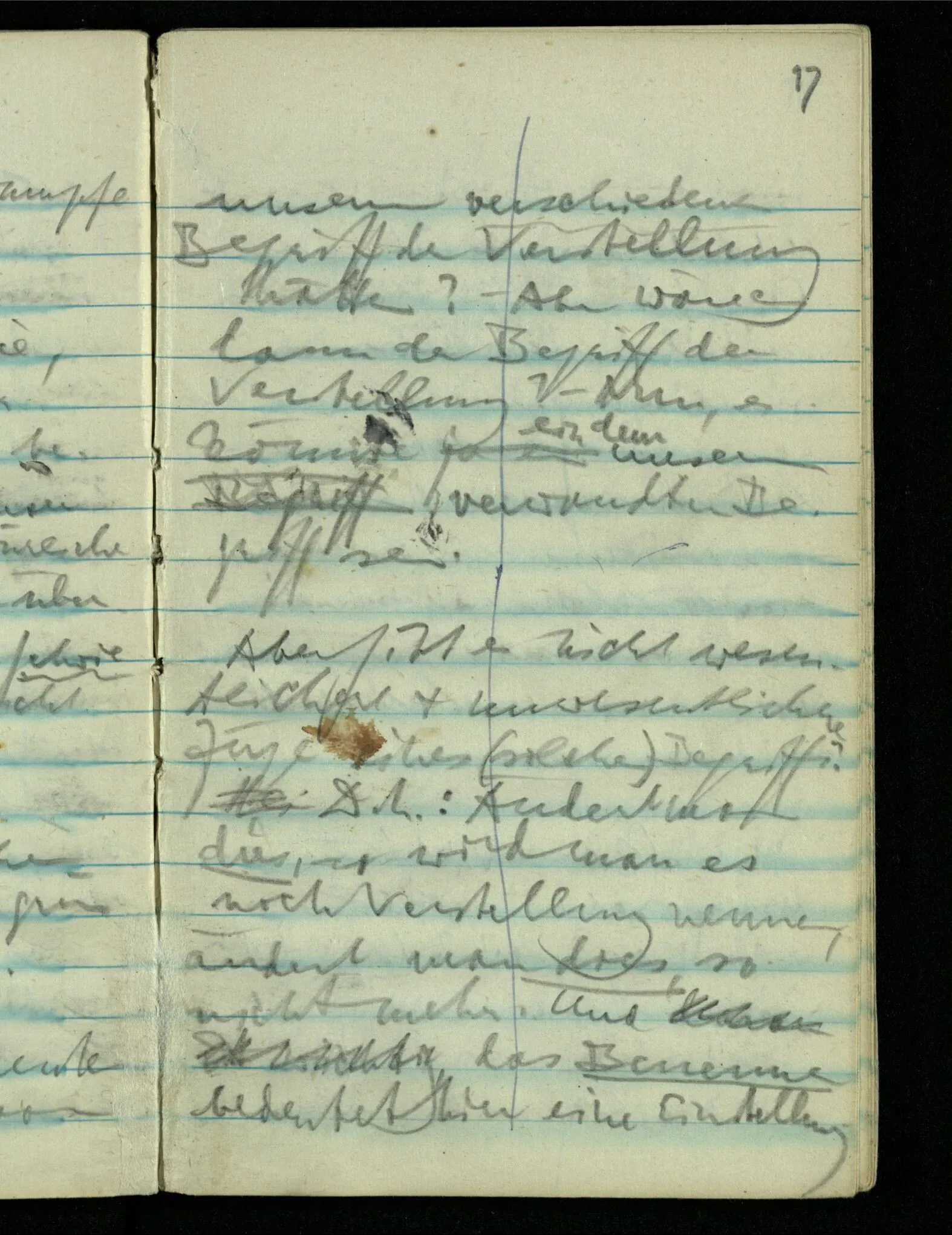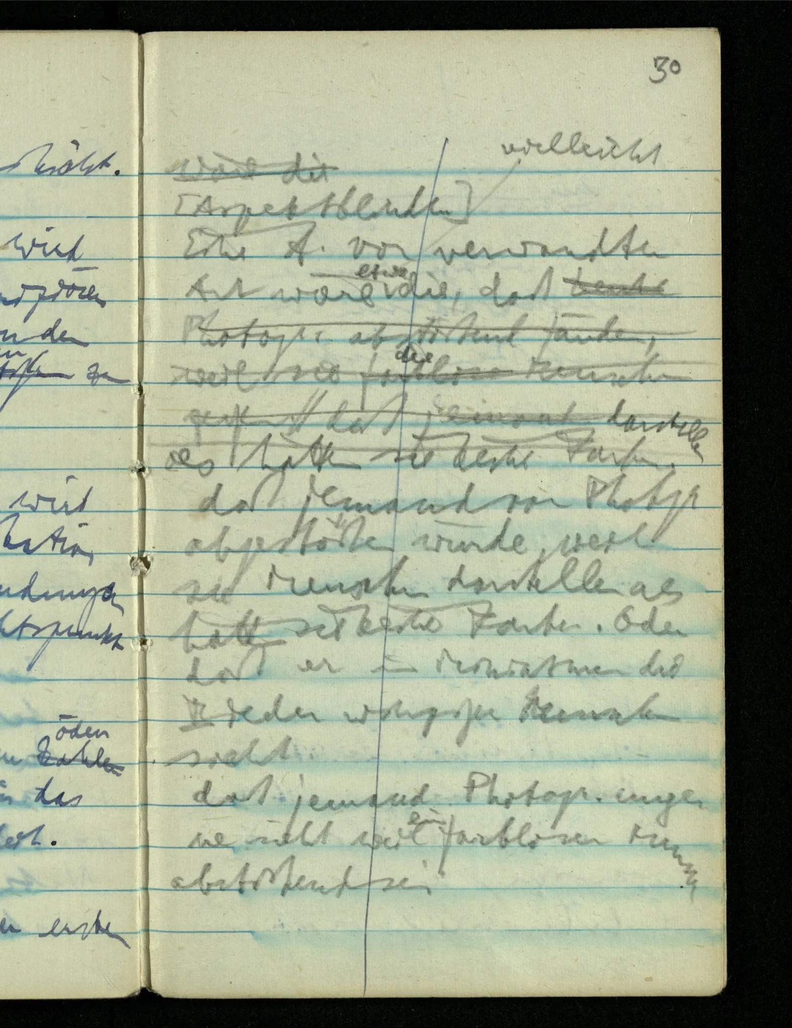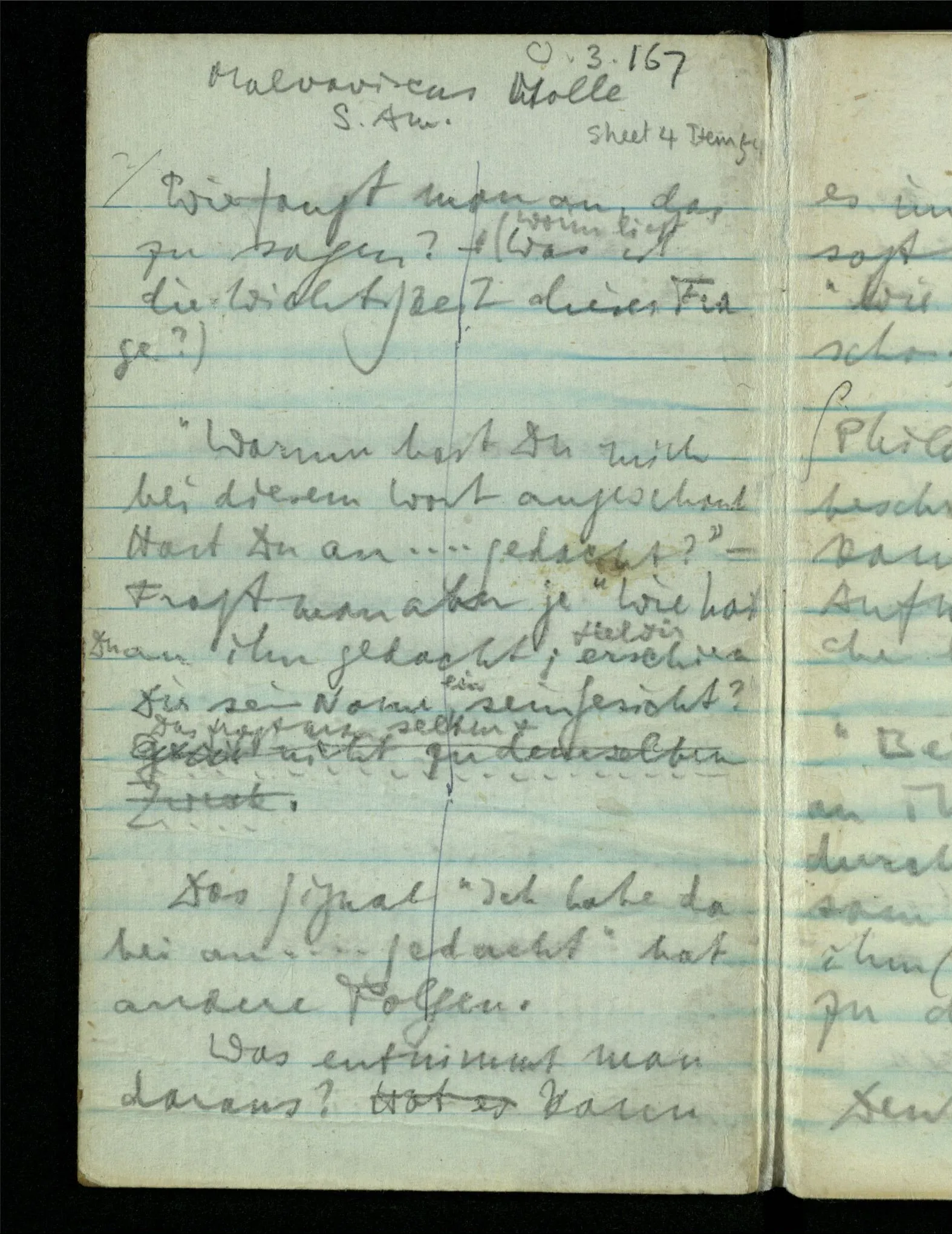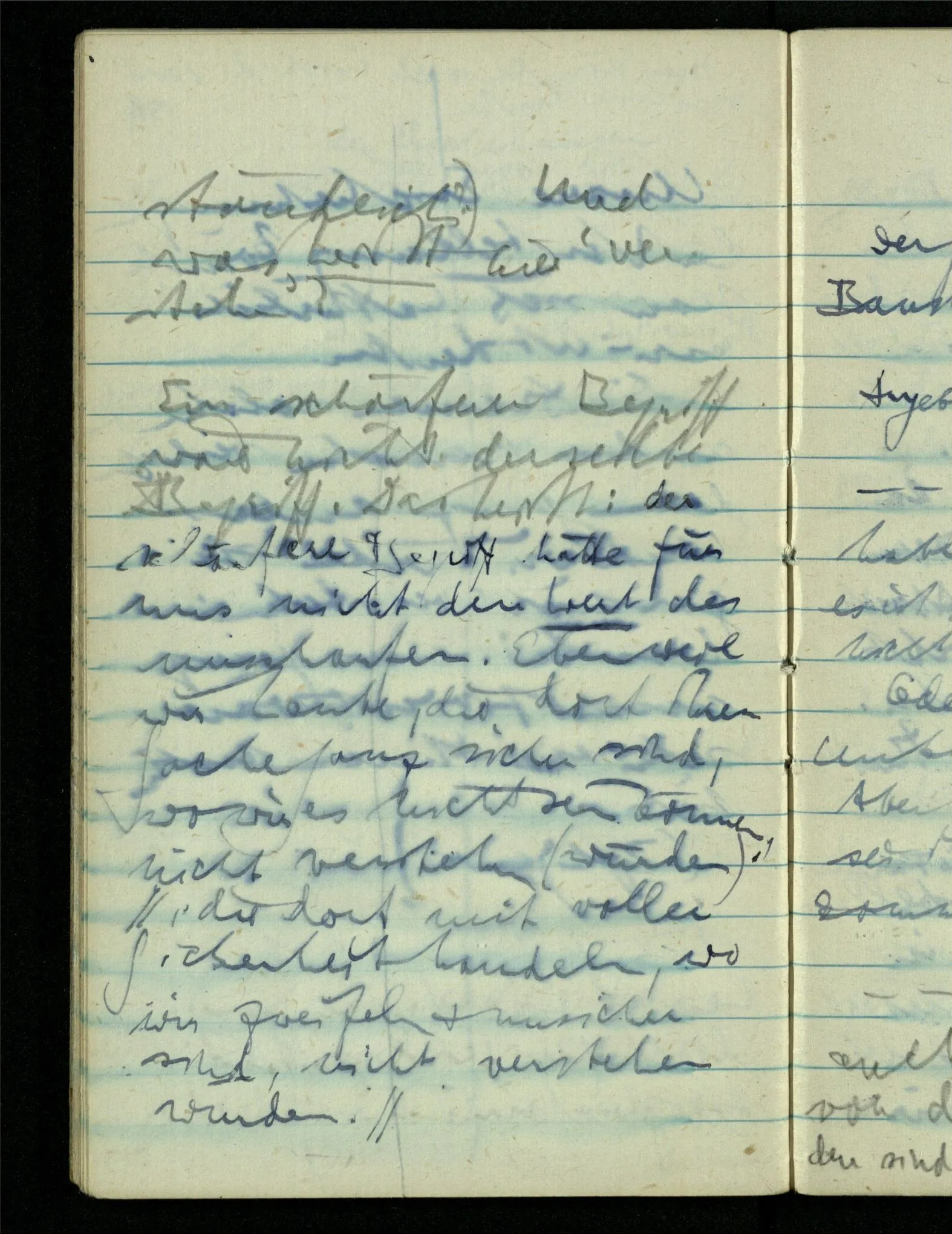 “Der N. ist gekommen”. Ich mache ein erfreutes Gesicht. Dann kommt er herein & ich sehe daß es nicht den war den ich erwartet hätte. Es zeigt sich etwas in meinem Gesicht. – Wäre es den gewesen den ich erwartet hatte, – was müßte da bei der Anmeldung in mir vor sich gegangen sein? [Gar nichts.] Also auch nichts, da ich es nun falsch verstanden hatte. Aber ich sage doch “Ich glaubte, als ich Dich reden hörte, Du meintest dein …”!