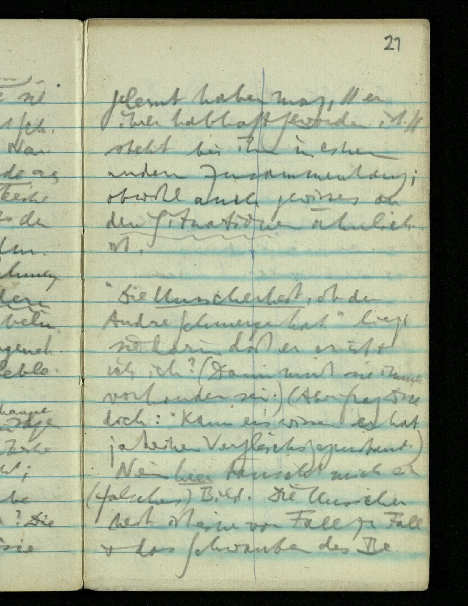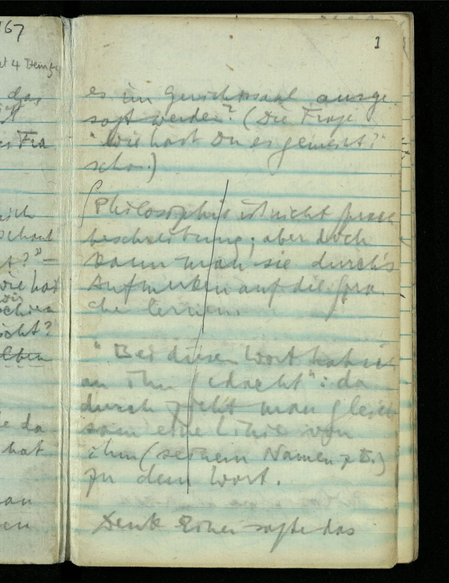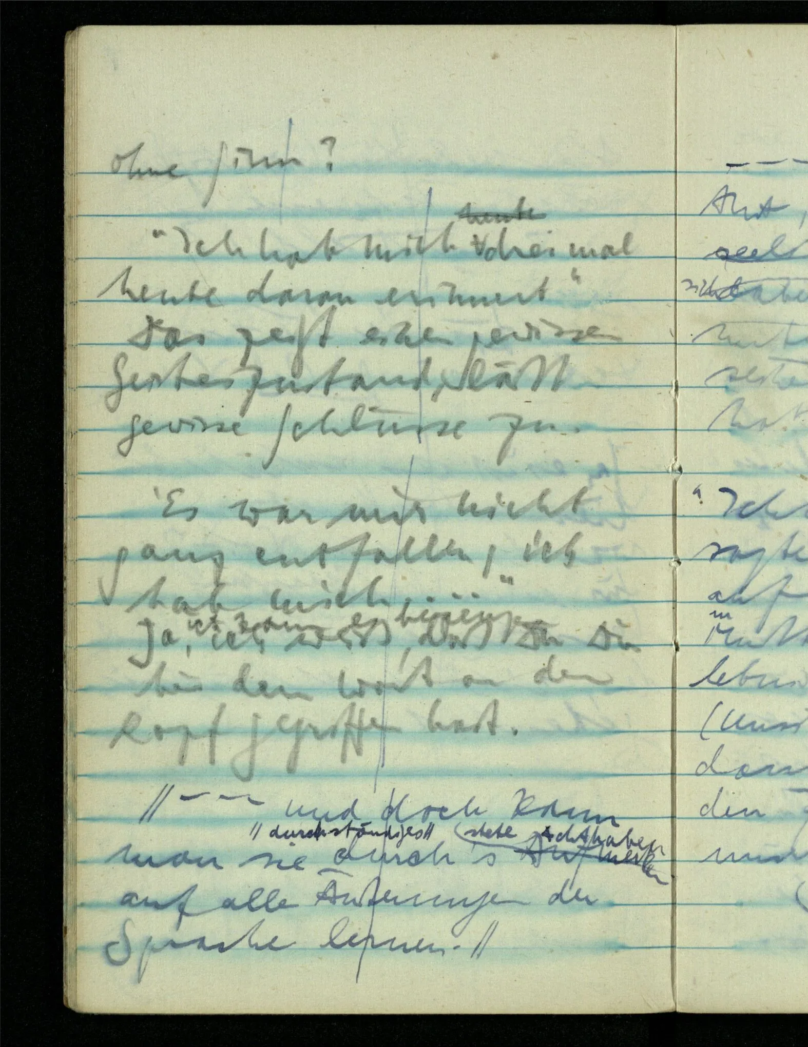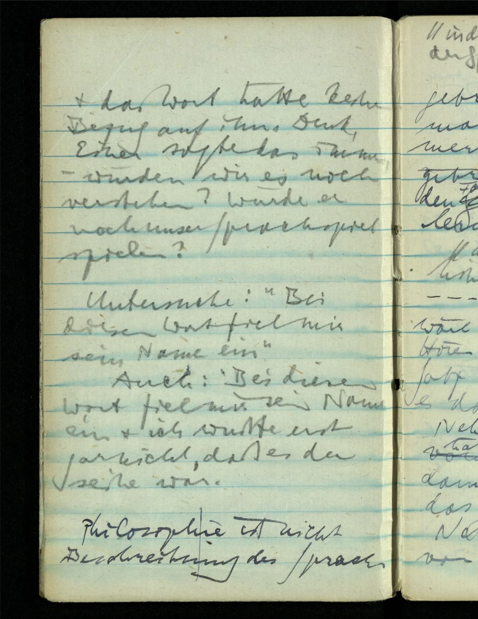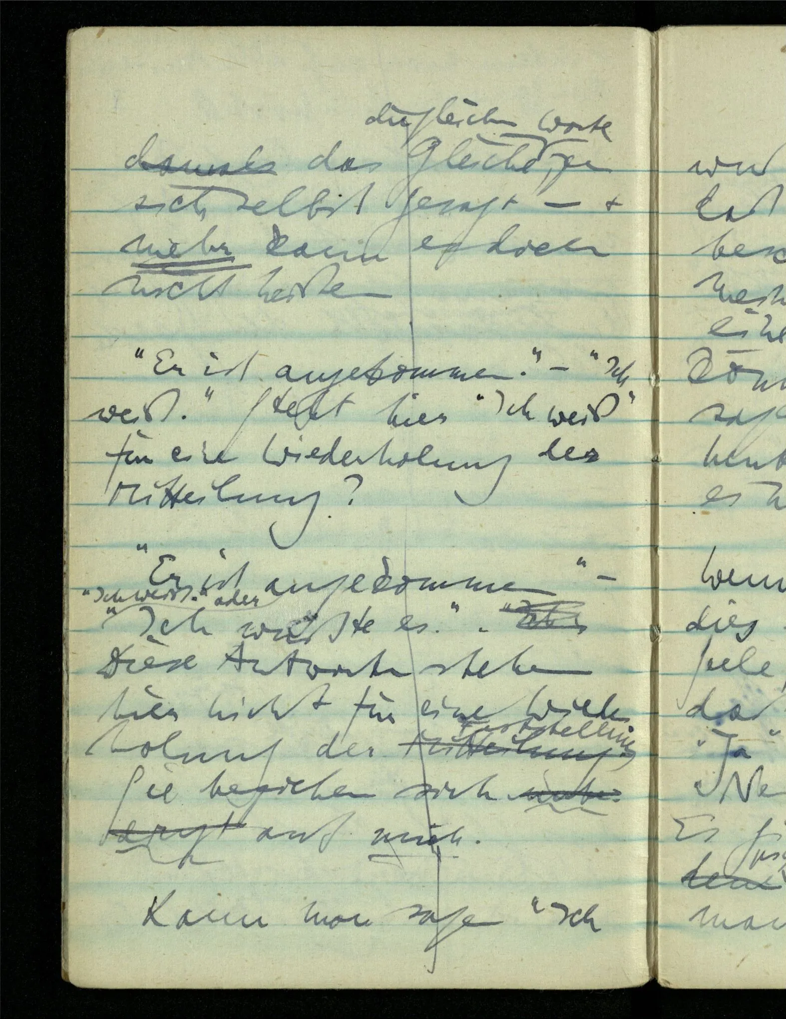 – – – Wenn es nun geschehen wäre daß Beide beim Hören dieses Wortes denselben Satz sagen – & mehr kann es doch nicht heißen. Nehmen wir an wir hätten uns Beide damals das gleiche gesagt. Nehmen wir an, jeden von uns hätte sich dabei das Gleiche, zu sich selbst gesagt – & mehr kann es doch nicht heißen.
