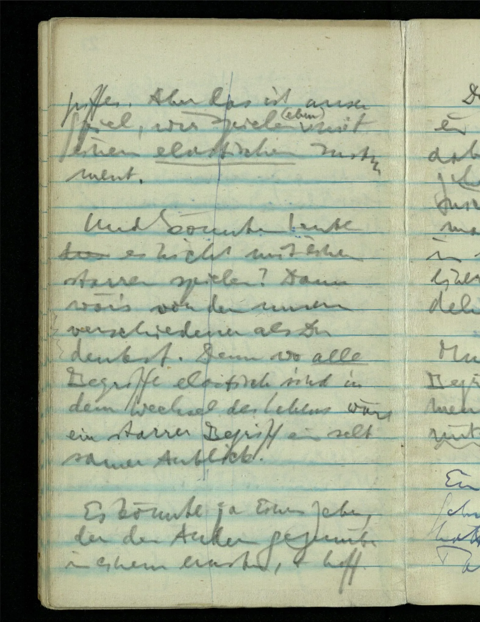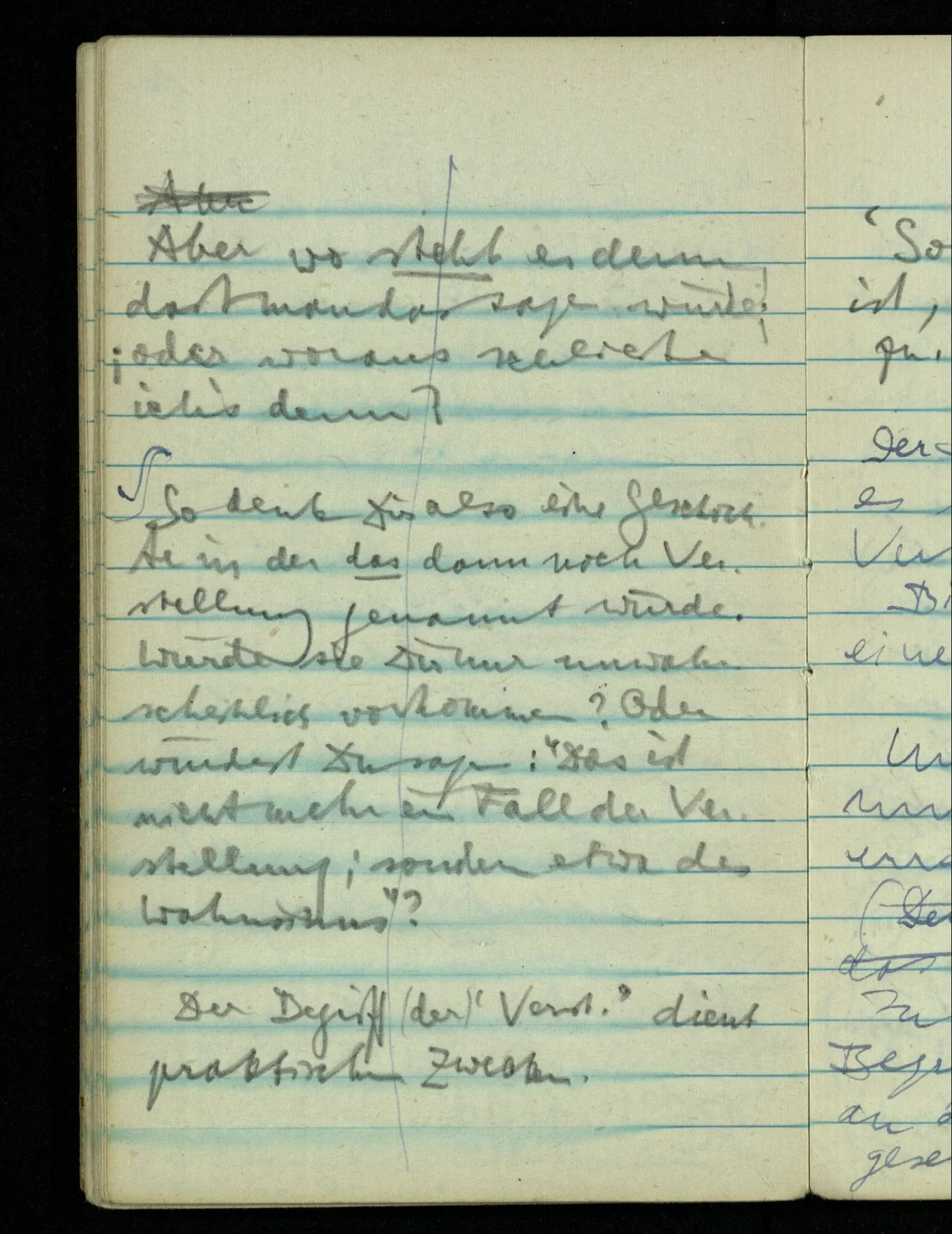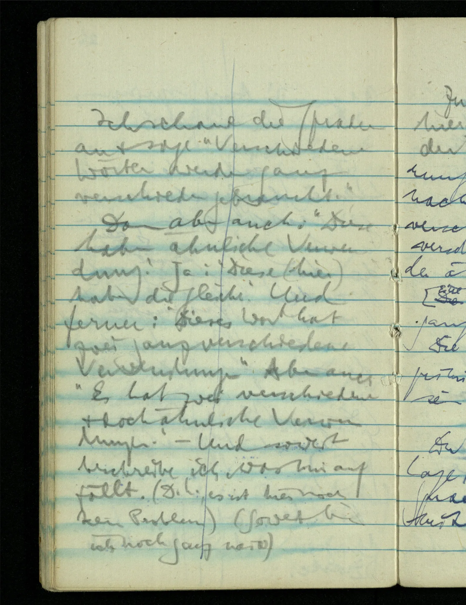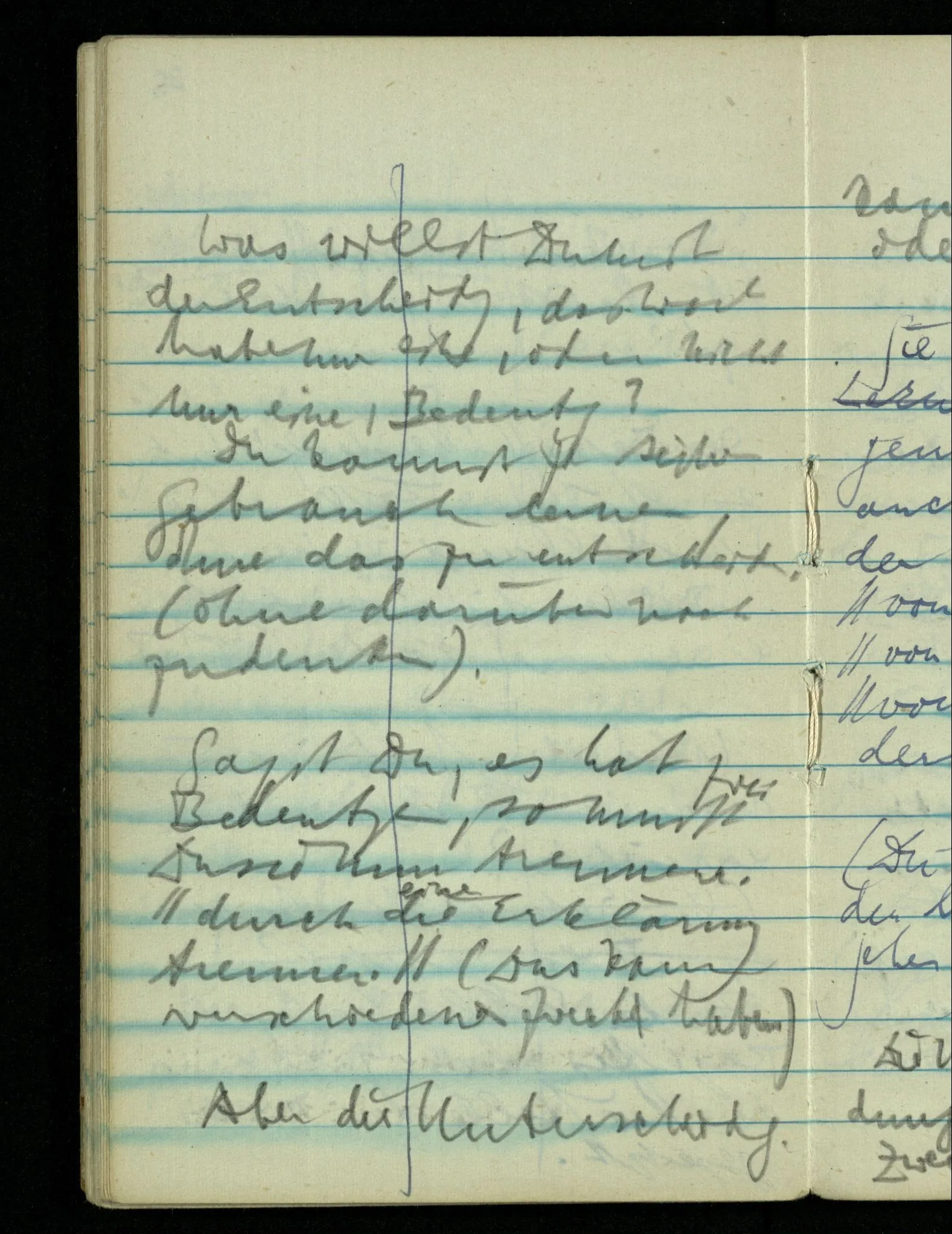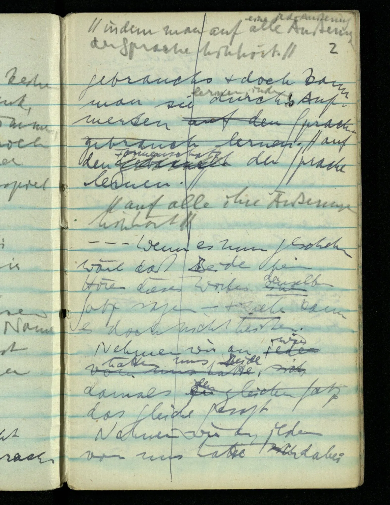 – – – Wenn es nun geschehen wäre daß Beide beim Hören dieses Wortes denselben Satz sagen – & mehr kann es doch nicht heißen. Nehmen wir an wir hätten uns Beide damals das gleiche gesagt. Nehmen wir an, jeden von uns hätte sich dabei das Gleiche, zu sich selbst gesagt – & mehr kann es doch nicht heißen.