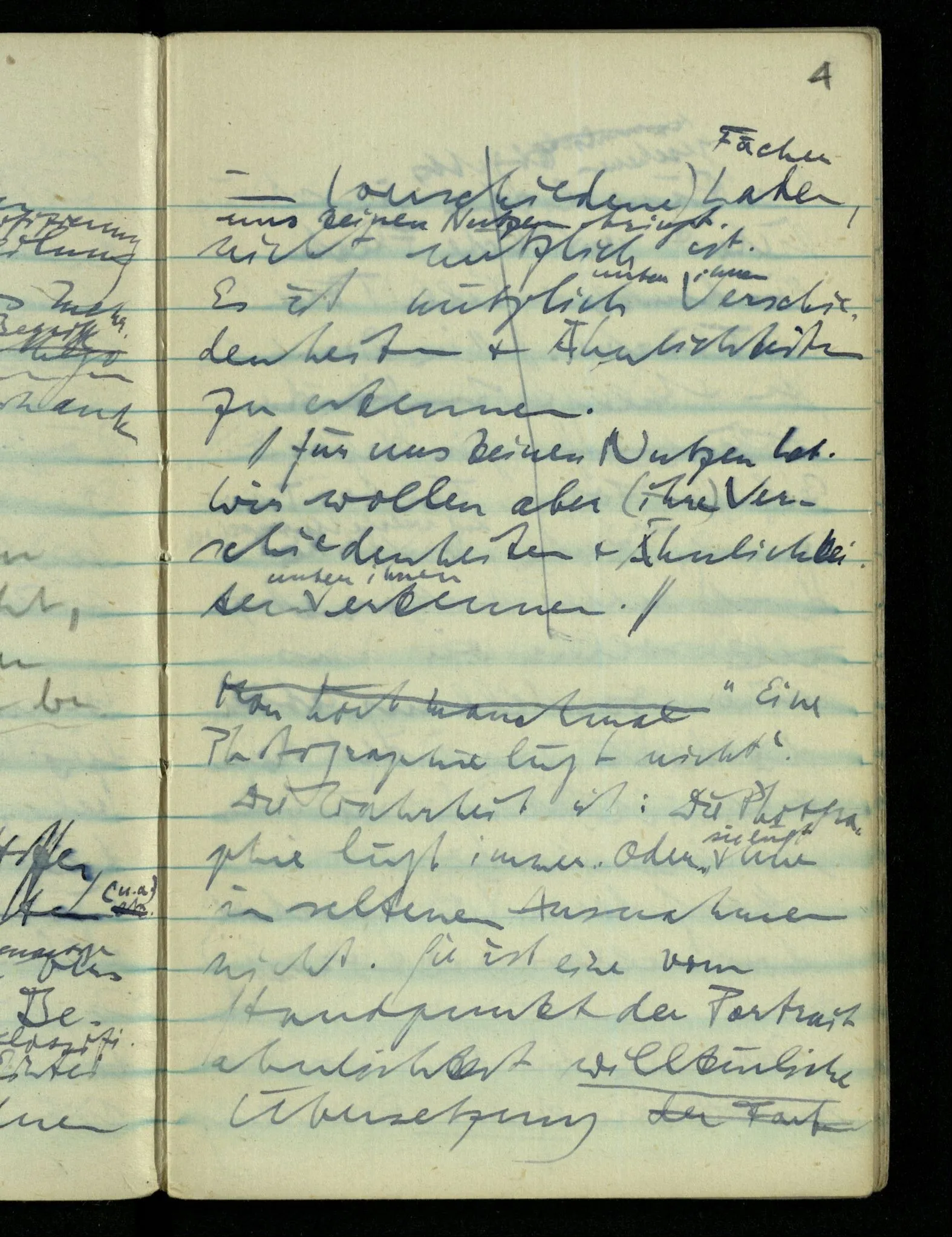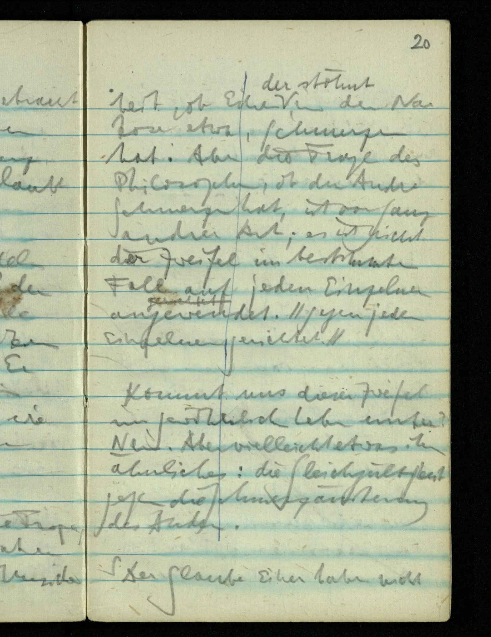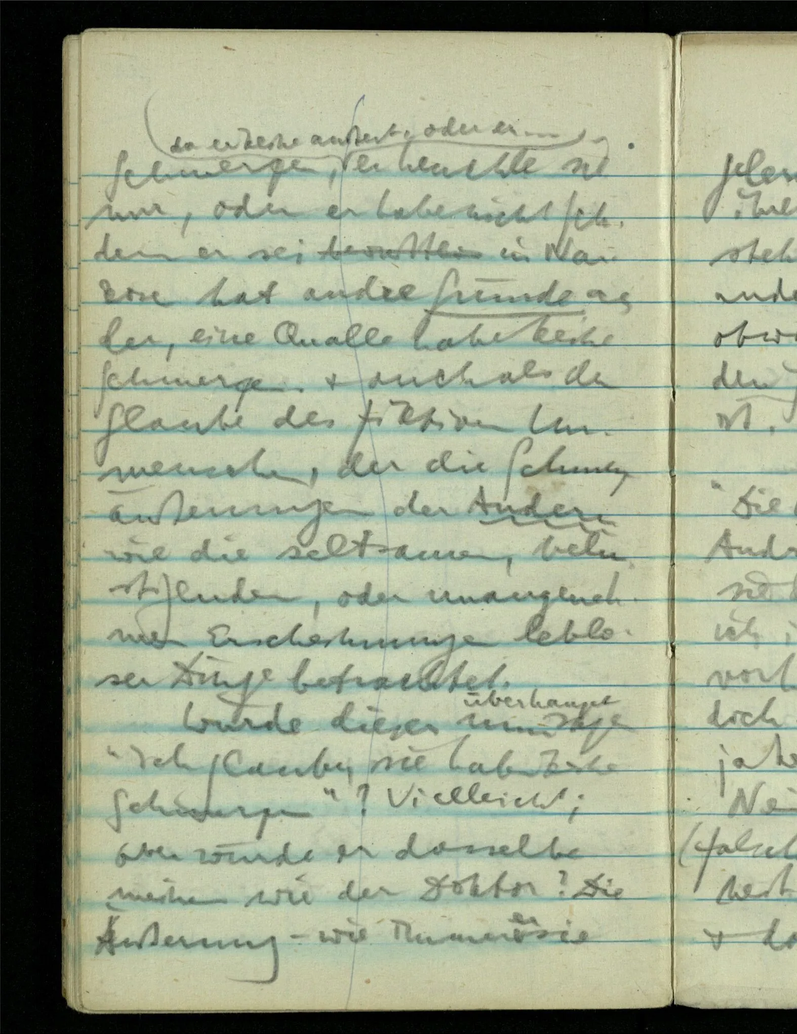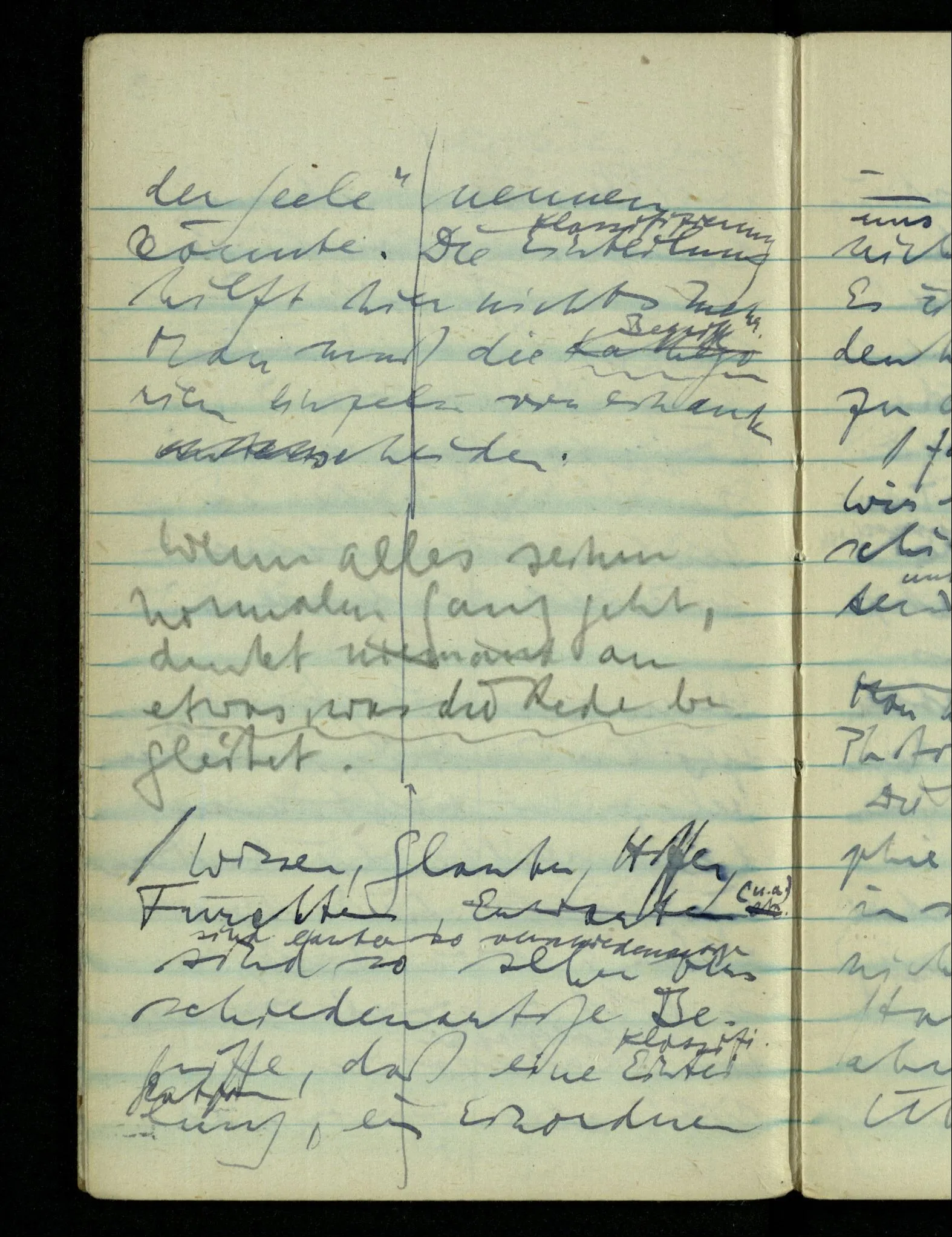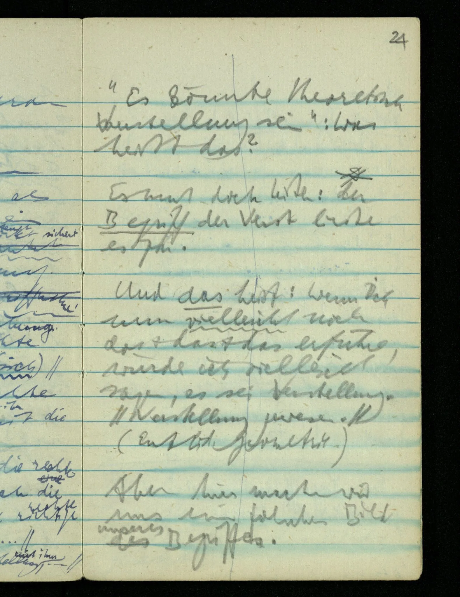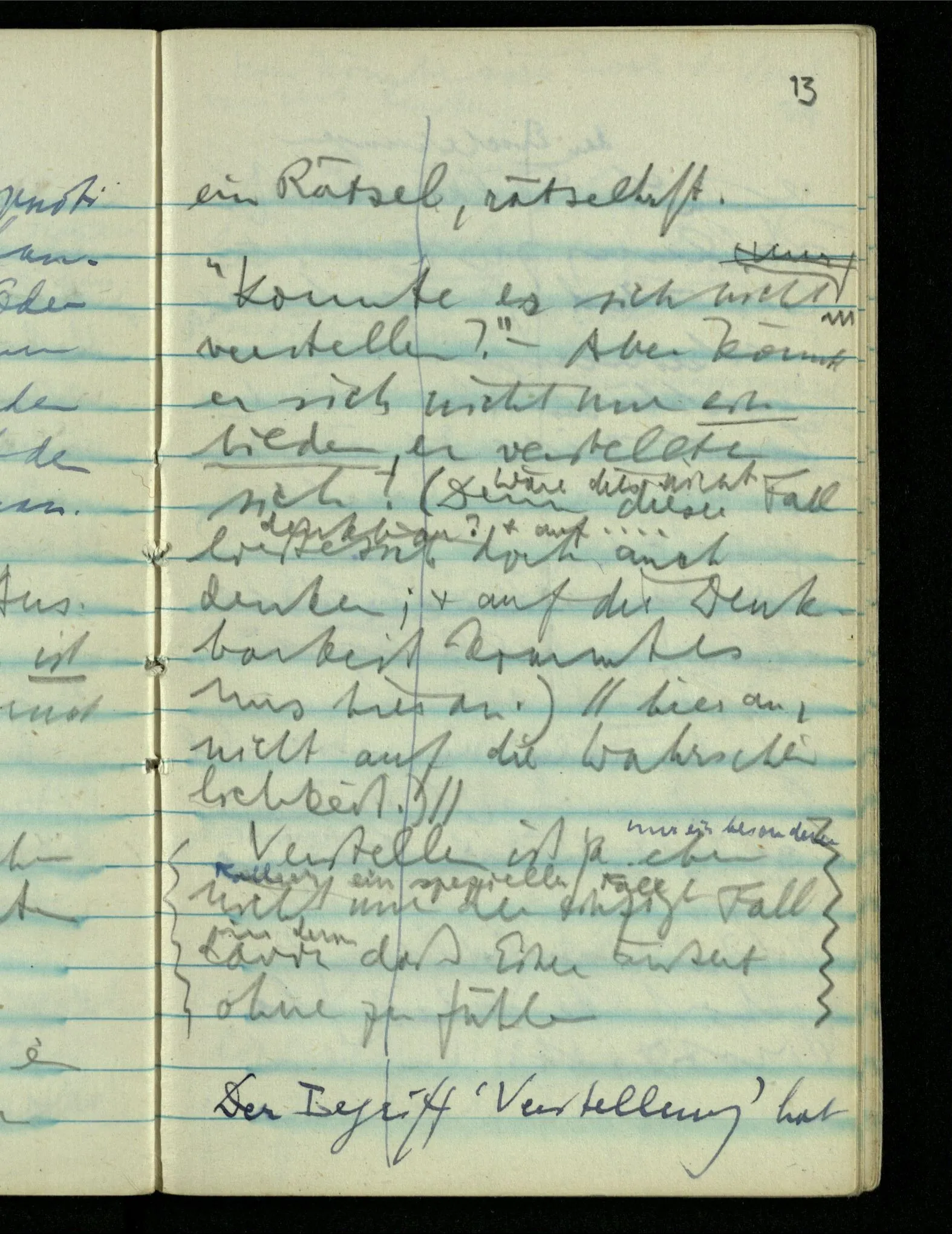 – – – Wenn es nun geschehen wäre daß Beide beim Hören dieses Wortes denselben Satz sagen – & mehr kann es doch nicht heißen. Nehmen wir an wir hätten uns Beide damals das gleiche gesagt. Nehmen wir an, jeden von uns hätte sich dabei das Gleiche, zu sich selbst gesagt – & mehr kann es doch nicht heißen.