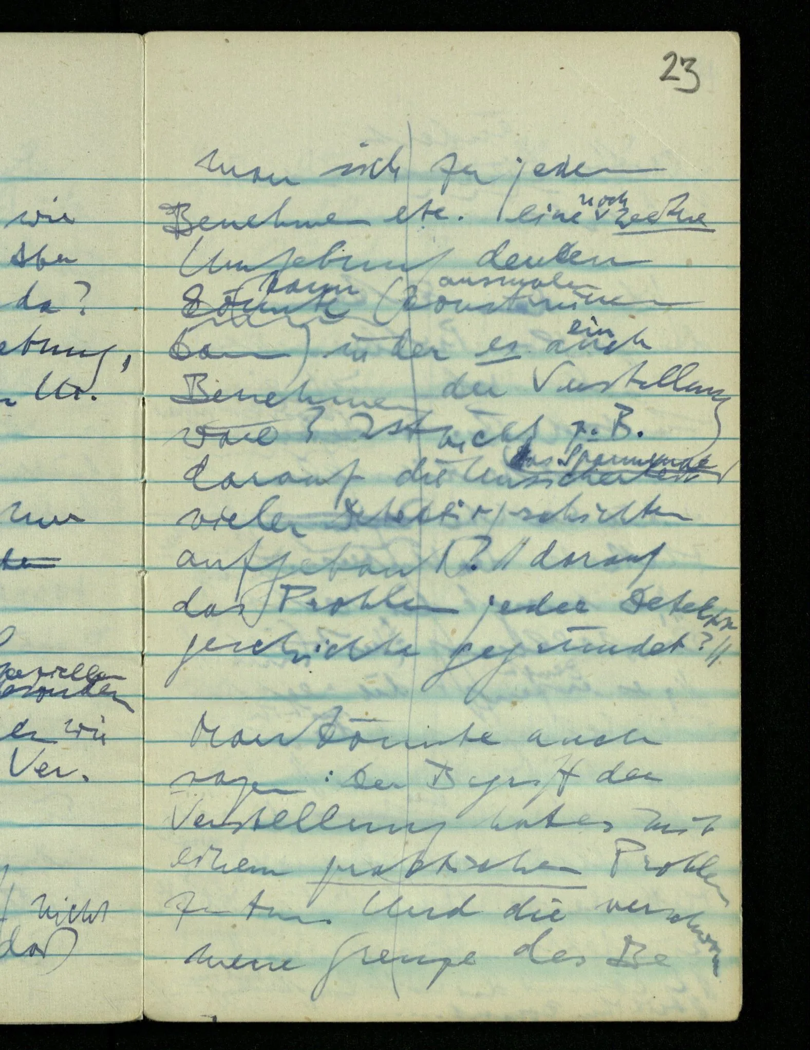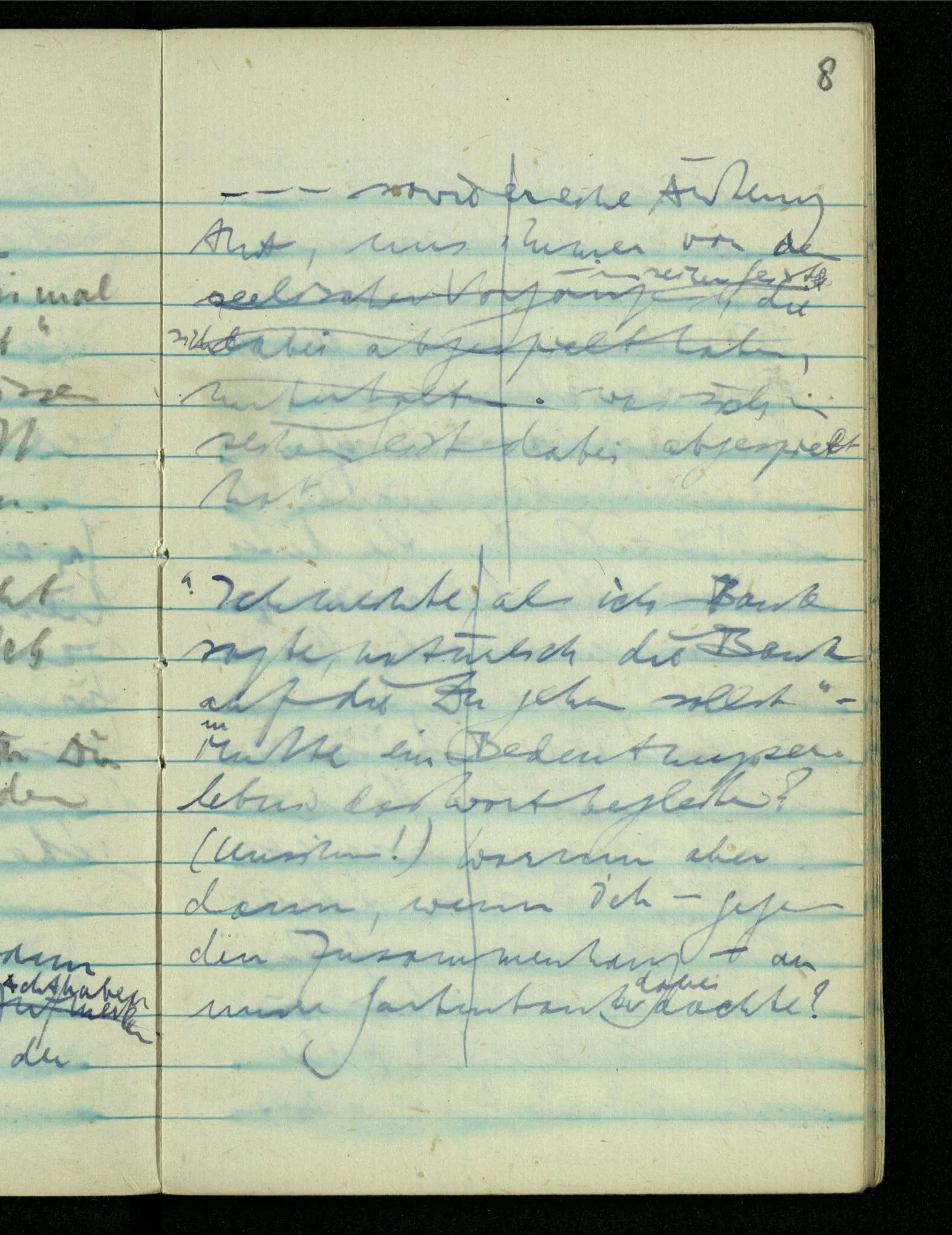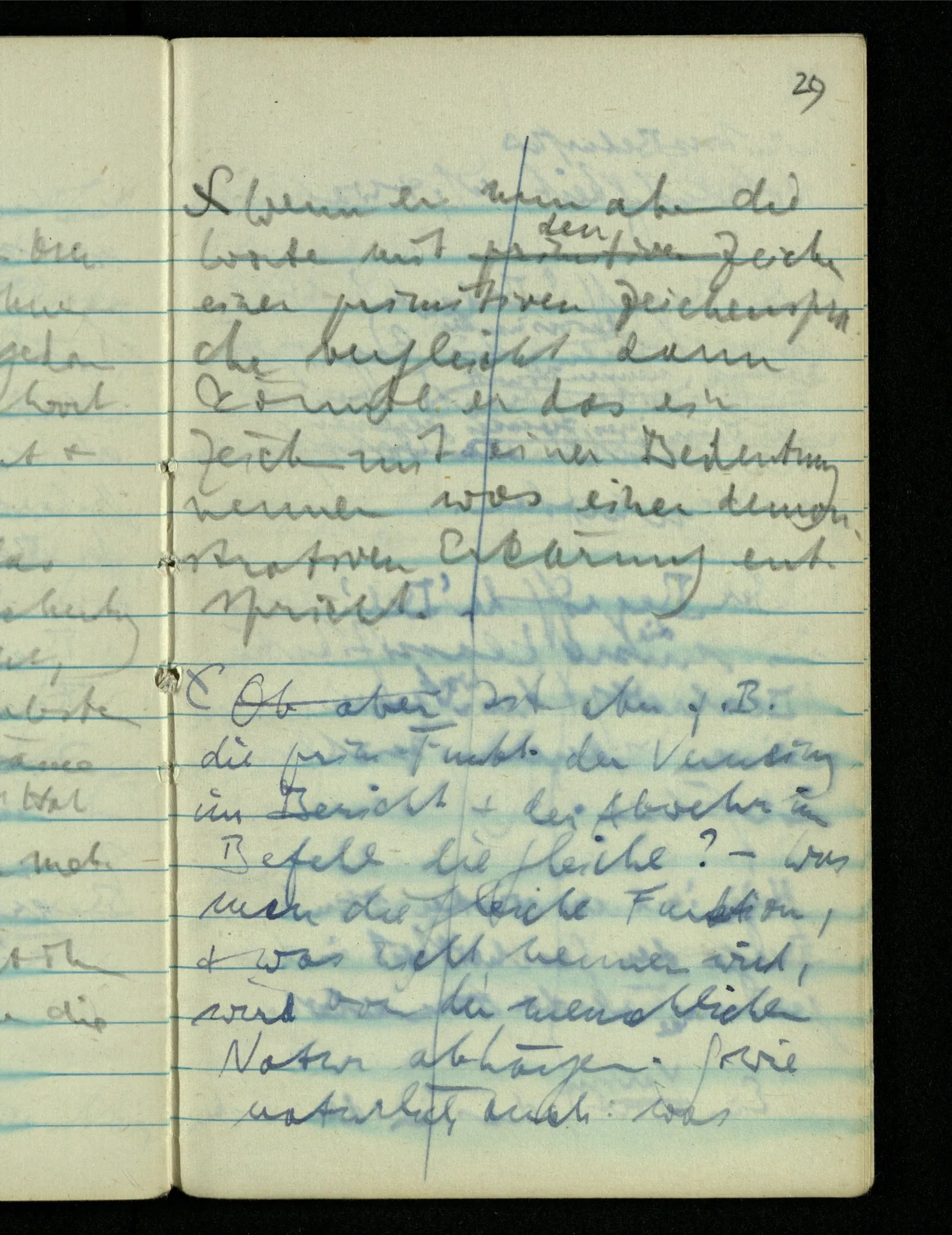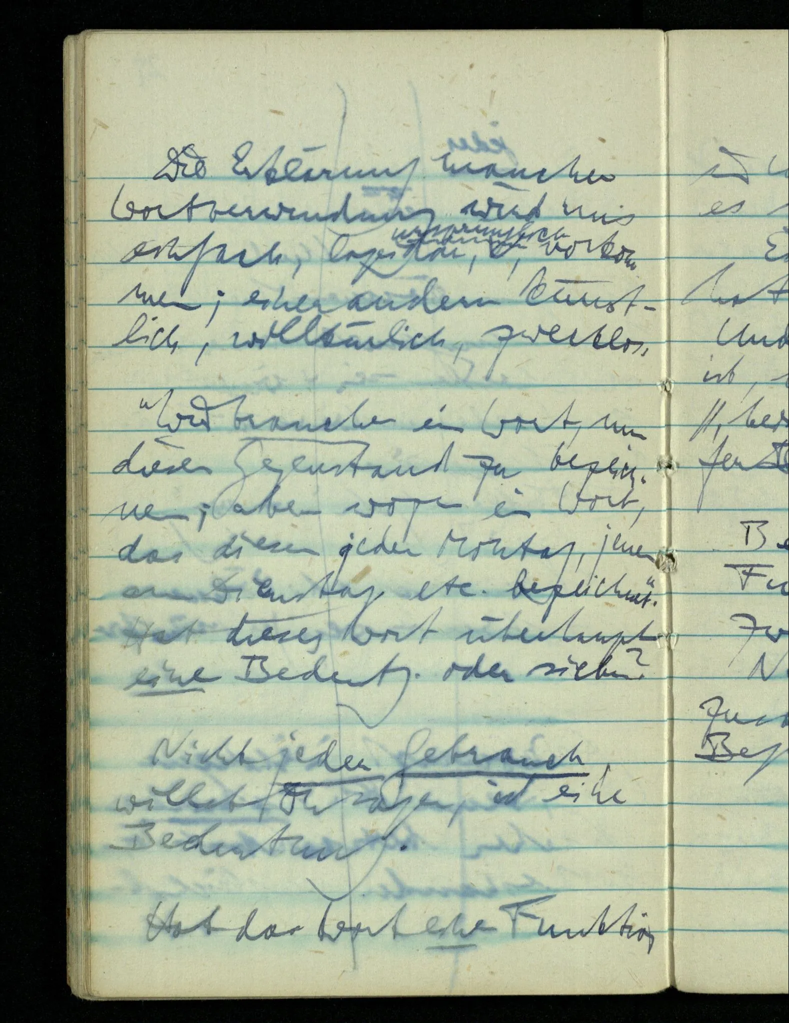 “Ich meinte, als ich Bank sagte, natürlich die Bank auf die Du gehen sollst.” – Mußte ein Bedeutungserlebnis das Wort begleiten? (Unsinn!) Warum aber dann, wenn ich – gegen den Zusammenhang – an unsre Gartenbank dabei dachte?