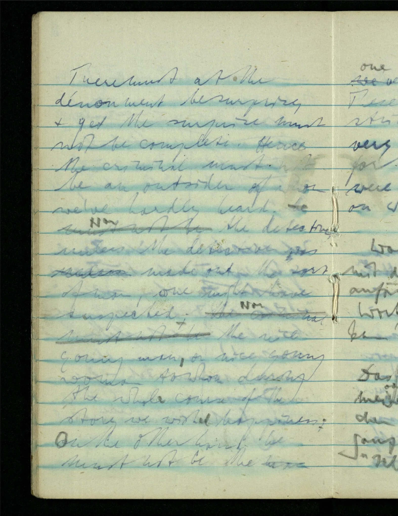 There must at the dénouement be surprise, & yet the surprise must not be complete. Hence the criminal must not be an outsider of whom we’ve hardly heard. Nor the detective, unless the detective was made out the sort of man, one might have suspected. Nor the nice young man, or nice young woman to whom during the whole course of the story we wish happiness: On the other hand he must not be the one obvious suspect. These rules are very stringent & leave only a very small margin for the writer, as it were a tiny dance floor on which to perform.