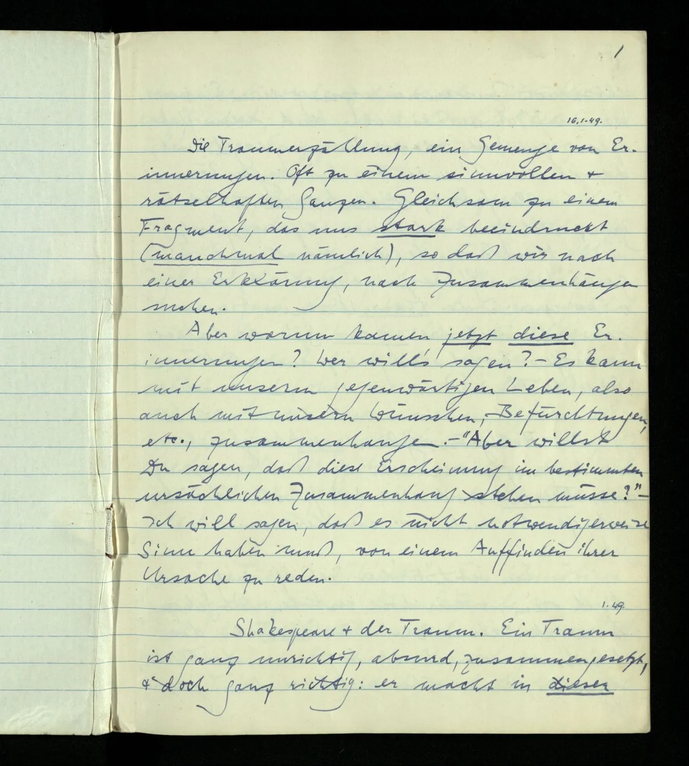 16.01.1949 Die Traumerzählung, ein Gemenge von Erinnerungen. Oft zu einem sinnvollen & rätselhaften Ganzen. Gleichsam zu einem Fragment, das uns stark beeindruckt (manchmal nämlich), so daß wir nach einer Erklärung, nach Zusammenhängen suchen. Aber warum kamen jetzt diese Erinnerungen? Wer will’s sagen? – Es kann mit unserm gegenwärtigen Leben, also auch mit unsern Wünschen, Befürchtungen, etc., zusammenhängen. – “Aber willst Du sagen, daß diese Erscheinung im bestimmten ursächlichen Zusammenhang stehen müsse?” – Ich will sagen, daß es nicht notwendigerweise Sinn haben muß, von einem Auffinden ihrer Ursache zu reden.