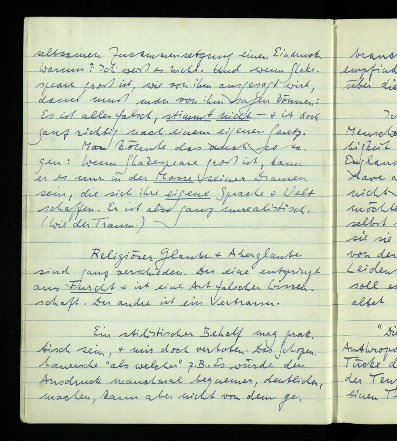 1.49. Shakespeare & der Traum. Ein Traum ist ganz unrichtig, absurd, zusammengesetzt, & doch ganz richtig: er macht in dieser seltsamen Zusammensetzung einen Eindruck. Warum? Ich weiß es nicht. Und wenn Shakespeare groß ist, wie von ihm ausgesagt wird, dann muß man von ihm sagen können: Es ist alles falsch, stimmt nicht – & ist doch ganz richtig nach einem eigenen Gesetz. Man könnte das auch so sagen: Wenn Shakespeare groß ist, kann er es nur in der Masse seiner Dramen sein, die sich ihre eigene Sprache & Welt schaffen. Er ist also ganz unrealistisch. (Wie der Traum.)