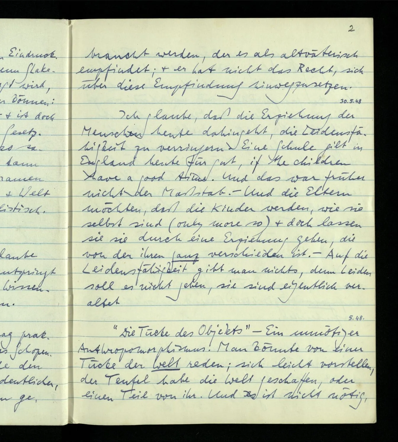 30.05.1948 Ich glaube, daß die Erziehung der Menschen heute dahingeht, die Leidensfähigkeit zu verringern. Eine Schule gilt in England heute für gut, if the children have a good time. Und das war früher nicht der Maßstab. – Und die Eltern möchten, daß die Kinder werden, wie sie selbst sind (only more so) & doch lassen sie sie durch eine Erziehung gehen, die von der ihren ganz verschieden ist. – Auf die Leidensfähigkeit gibt man nichts, denn Leiden soll es nicht geben, sie sind eigentlich veraltet.