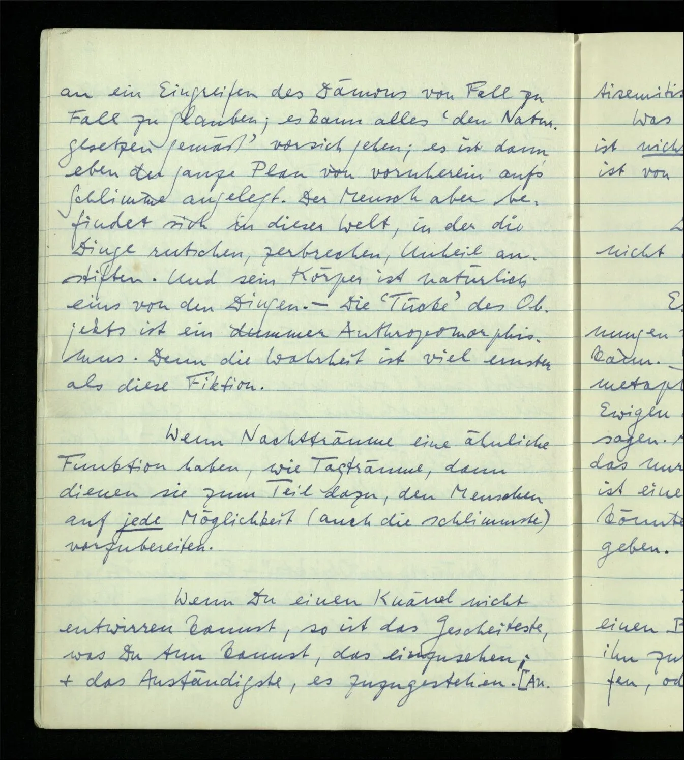 Wenn Du einen Knäuel nicht entwirren kannst, so ist das Gescheiteste, was Du tun kannst, das einzusehen; & das Anständigste, es zuzugestehen. [Antisemitismus]. Was man tun soll, das Übel zu heilen, ist nicht klar. Was man nicht tun darf, ist von Fall zu Fall klar.
