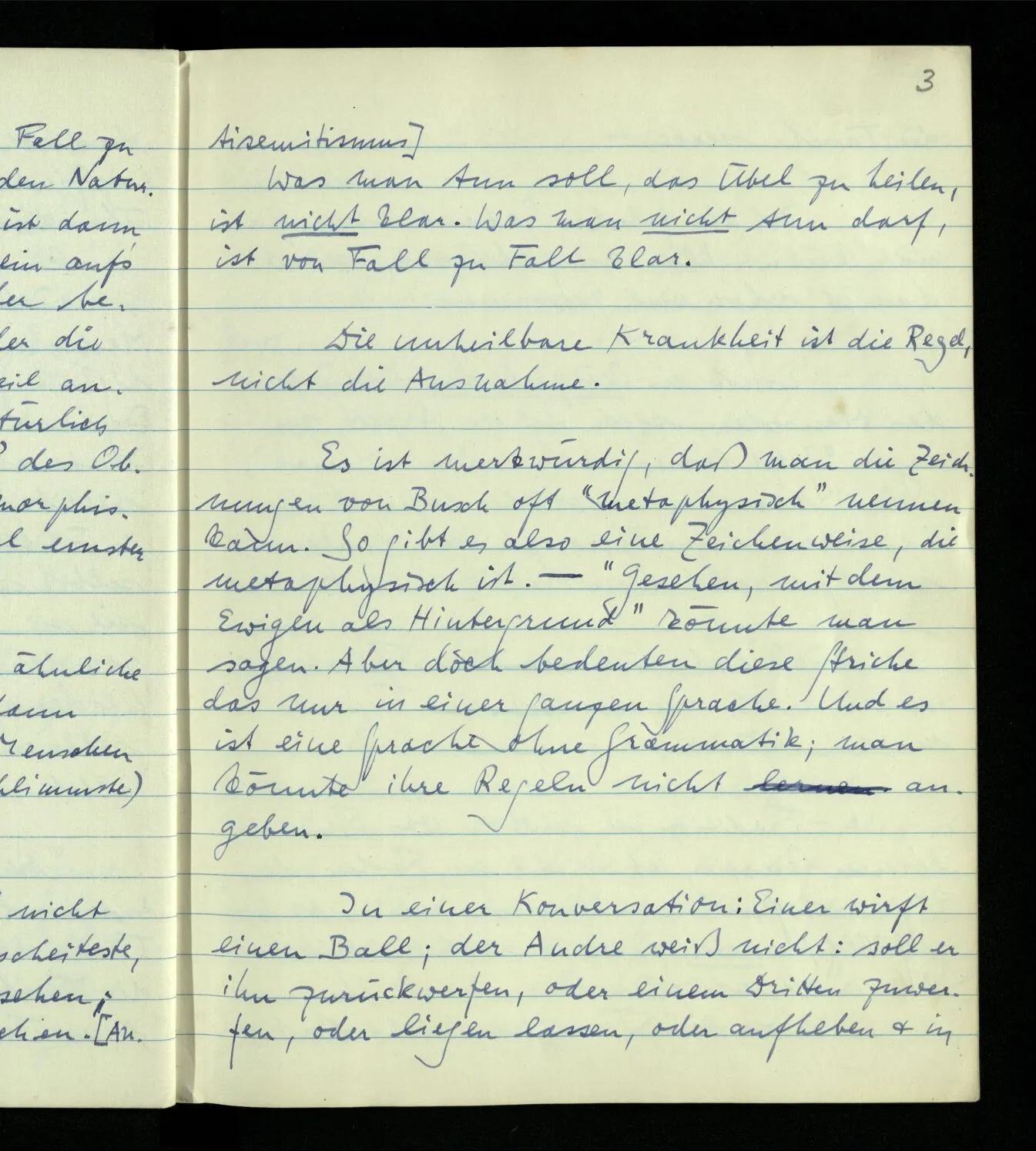 Es ist merkwürdig, daß man die Zeichnungen von Busch oft “metaphysisch” nennen kann. So gibt es also eine Zeichenweise, die metaphysisch ist. – “Gesehen, mit dem Ewigen als Hintergrund” könnte man sagen. Aber doch bedeuten diese Striche das nur in einer ganzen Sprache. Und es ist eine Sprache ohne Grammatik; man könnte ihre Regeln nicht angeben.