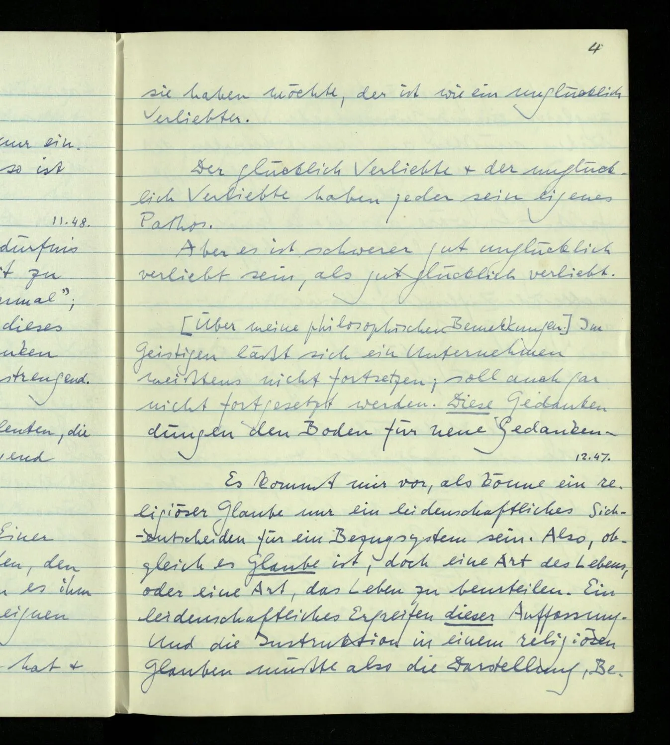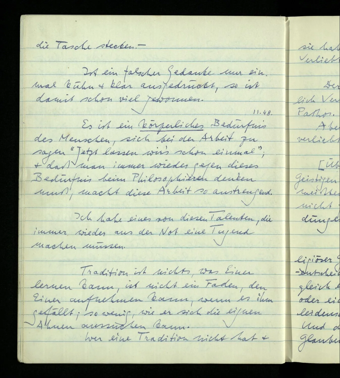 00.11.1948 Es ist ein körperliches Bedürfnis des Menschen, sich bei der Arbeit zu sagen “Jetzt lassen wir’s schon einmal”; & daß man immer wieder gegen dieses Bedürfnis beim Philosophieren denken muß, macht diese Arbeit so anstrengend.