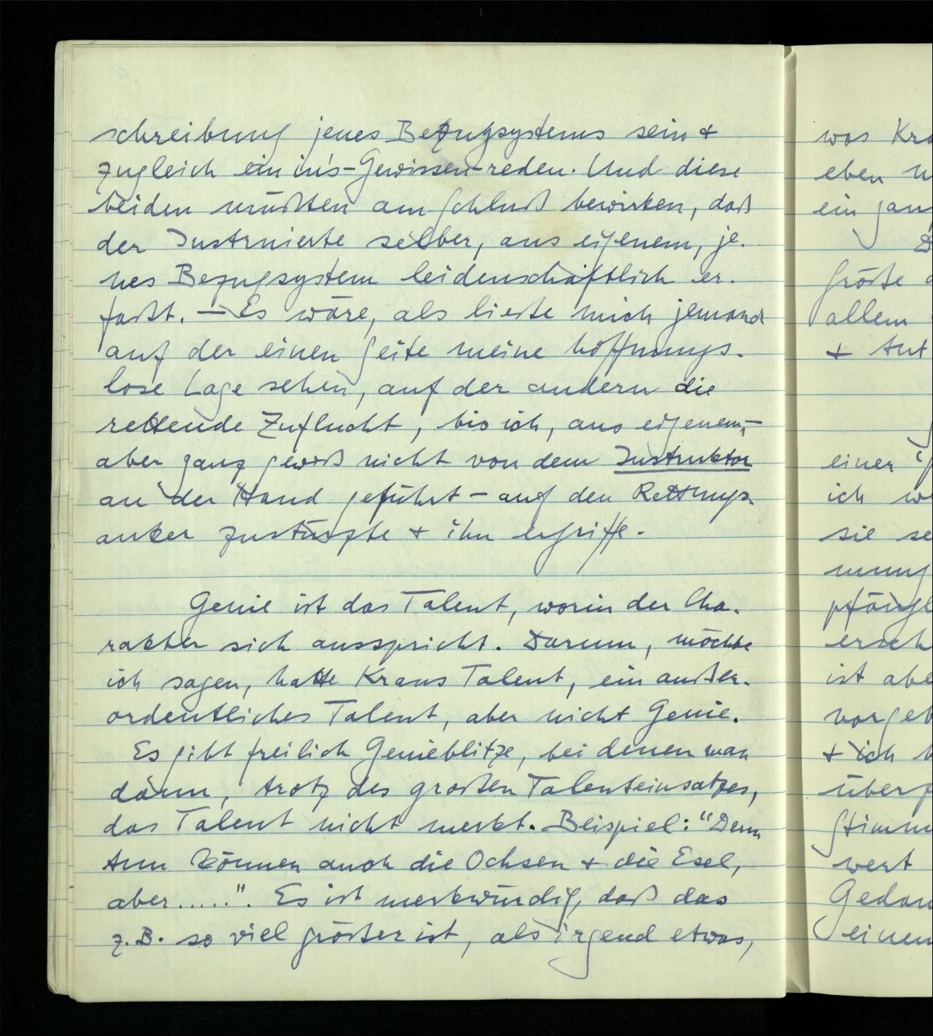 Es gibt freilich Genieblitze, bei denen man dann, trotz des großen Talenteinsatzes, das Talent nicht merkt. Beispiel: “Denn tun können auch die Ochsen & die Esel, aber ‥‥․”. Es ist merkwürdig, daß das z.B. so viel größer ist, als irgend etwas, was Kraus je geschrieben hat. Es ist hier eben nicht ein Verstandesskelett, sondern ein ganzer Mensch. Das ist auch der Grund, warum die Größe dessen, was Einer schreibt, von allem Übrigen abgehängt, was er schreibt & tut.