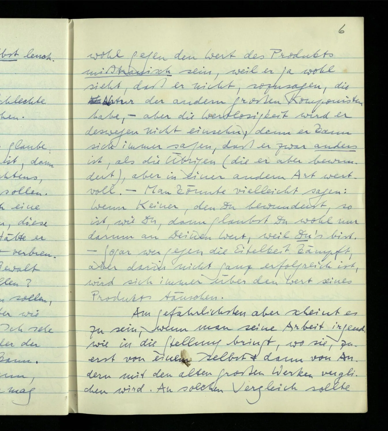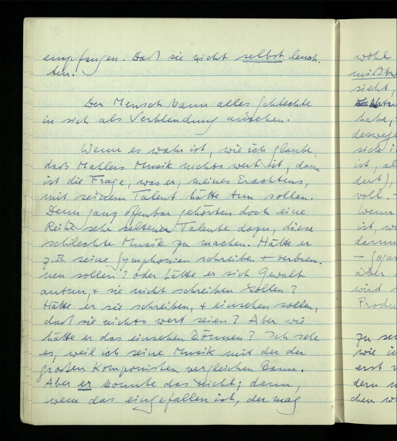 Wenn es wahr ist, wie ich glaube, daß Mahlers Musik nichts wert ist, dann ist die Frage, was er, meines Erachtens, mit seinem Talent hätte tun sollen. Denn ganz offenbar gehörten doch eine Reihe sehr seltener Talente dazu, diese schlechte Musik zu machen. Hätte er z.B. seine Symphonien schreiben & verbrennen sollen? oder hätte er sich Gewalt antun, & sie nicht schreiben sollen? Hätte er sie schreiben, & einsehen sollen, daß sie nichts wert seien? Aber wie hätte er das einsehen können? Ich sehe es, weil ich seine Musik mit der der großen Komponisten vergleichen kann. Aber er konnte das nicht; denn wem das eingefallen ist, der mag wohl gegen den Wert des Produkts mißtrauisch sein, weil er ja wohl sieht, daß er nicht, sozusagen, die Natur der andern großen Komponisten habe, – aber die Wertlosigkeit wird er deswegen nicht einsehn, denn er kann sich immer sagen, daß er zwar anders ist, als die Übrigen (die er aber bewundert), aber in einer andern Art wertvoll. – Man könnte vielleicht sagen: Wenn keiner, den Du bewunderst, so ist, wie Du, dann glaubst Du wohl nur darum an Deinen Wert, weil Du’s bist. – Sogar wer gegen die Eitelkeit kämpft, aber darin nicht ganz erfolgreich ist, wird sich immer über den Wert seines Produkts täuschen. Am gefährlichsten aber scheint es zu sein, wenn man seine Arbeit irgendwie in die Stellung bringt, wo sie, zuerst von einem selbst & dann von Andern mit den alten großen Werken verglichen wird. An einen solchen Vergleich sollte man gar nicht denken. Denn wenn die Umstände heute wirklich so anders sind, als die frühern, daß man sein Werk der Art nach nicht mit den früheren Werken vergleichen kann, dann kann man auch den Wert nicht mit dem ihren vergleichen. Ich selbst mache immer wieder den Fehler, von dem hier die Rede ist.