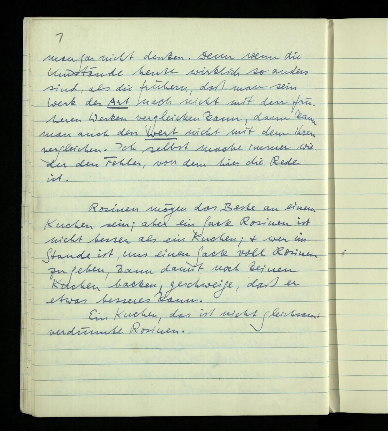 Rosinen mögen das Beste an einem Kuchen sein; aber ein Sack Rosinen ist nicht besser als ein Kuchen; & wer im Stande ist, uns einen Sack voll Rosinen zu geben, kann damit noch keinen Kuchen backen, geschweige, daß er etwas Besseres kann. Ein Kuchen, das ist nicht gleichsam: verdünnte Rosinen.