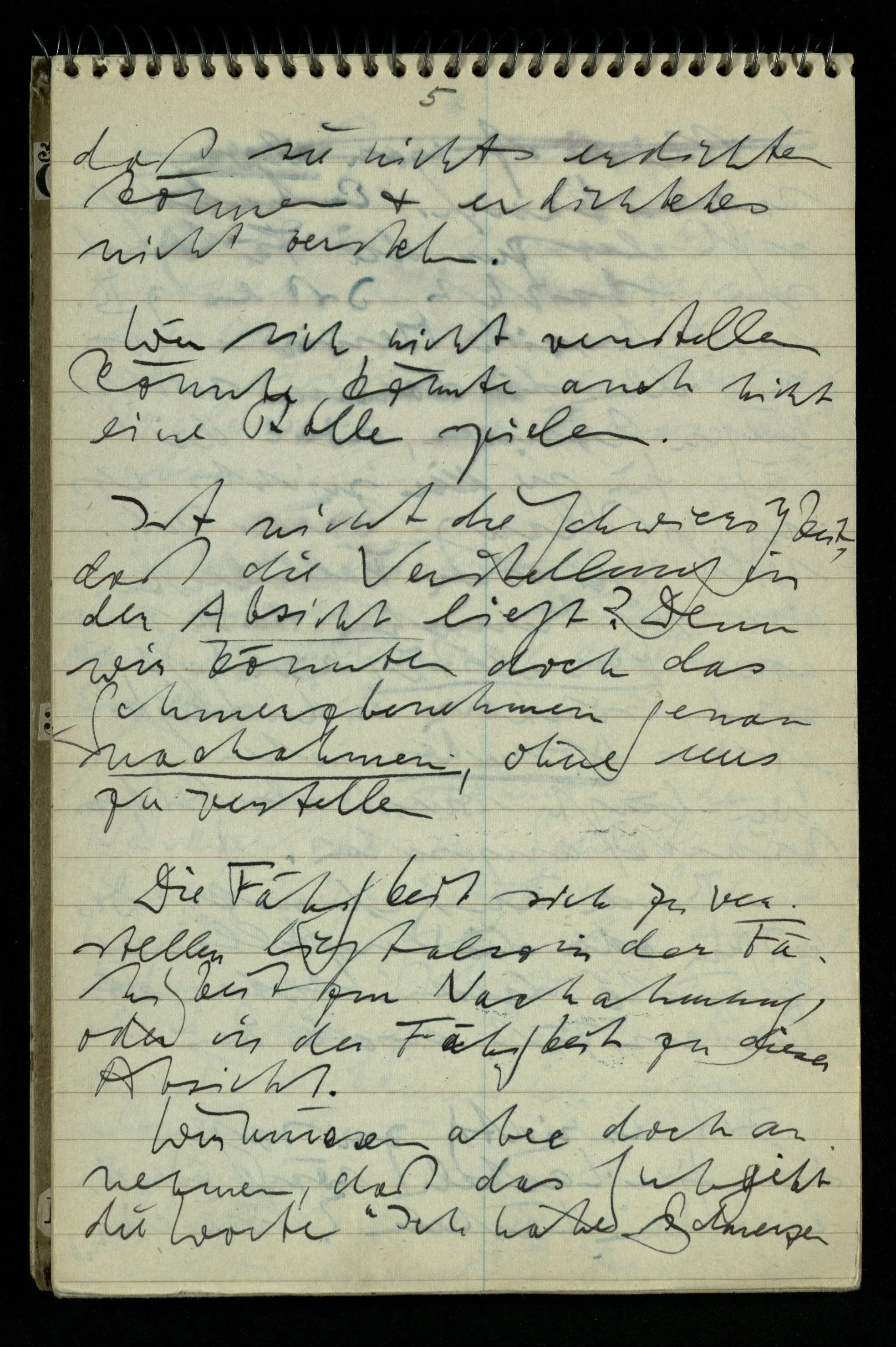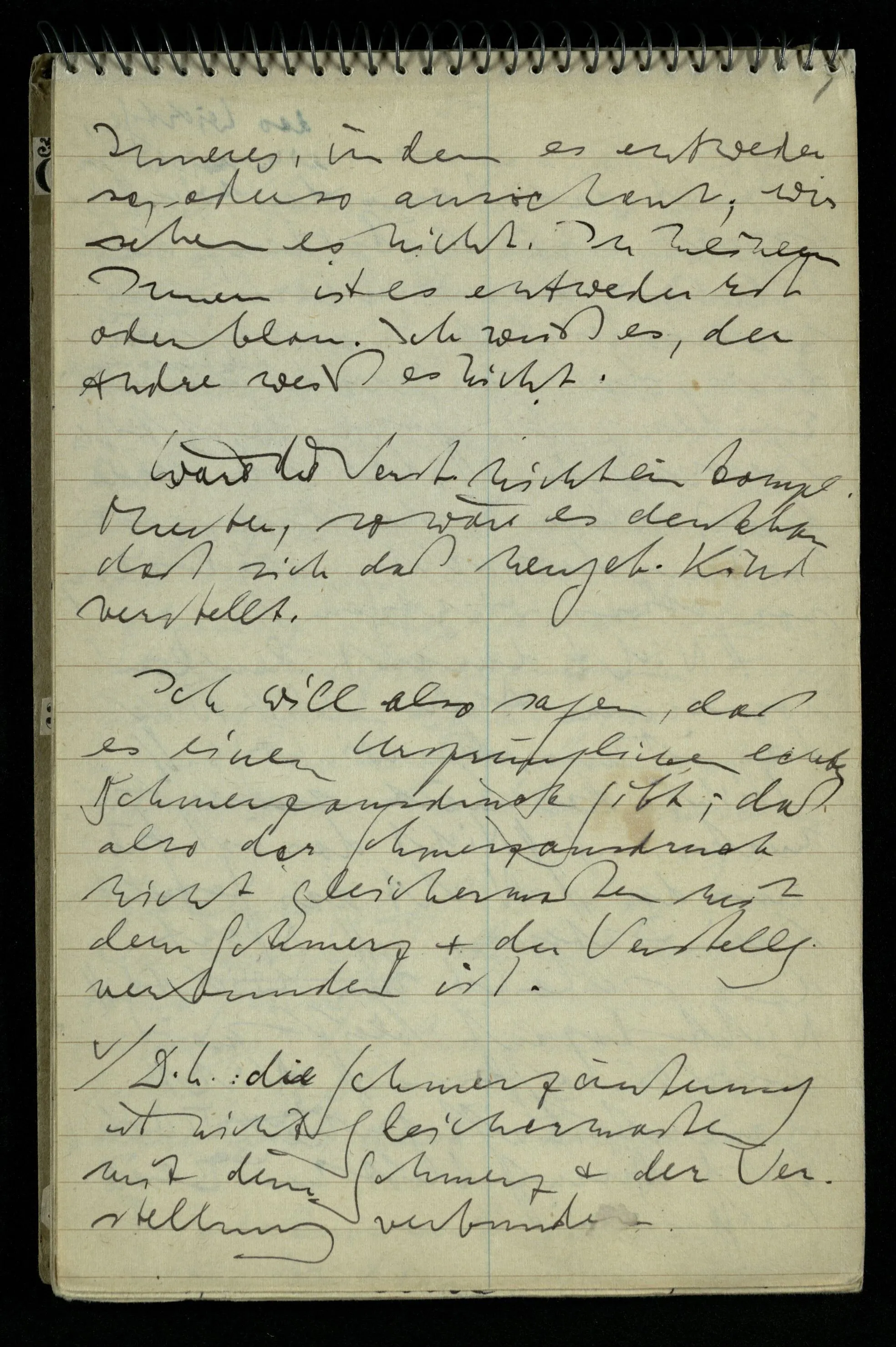 Ich will also sagen, daß es einen ursprünglichen echten Schmerzausdruck gibt; daß also der Schmerzausdruck nicht gleichermaßen mit dem Schmerz & der Verstellung verbunden ist.