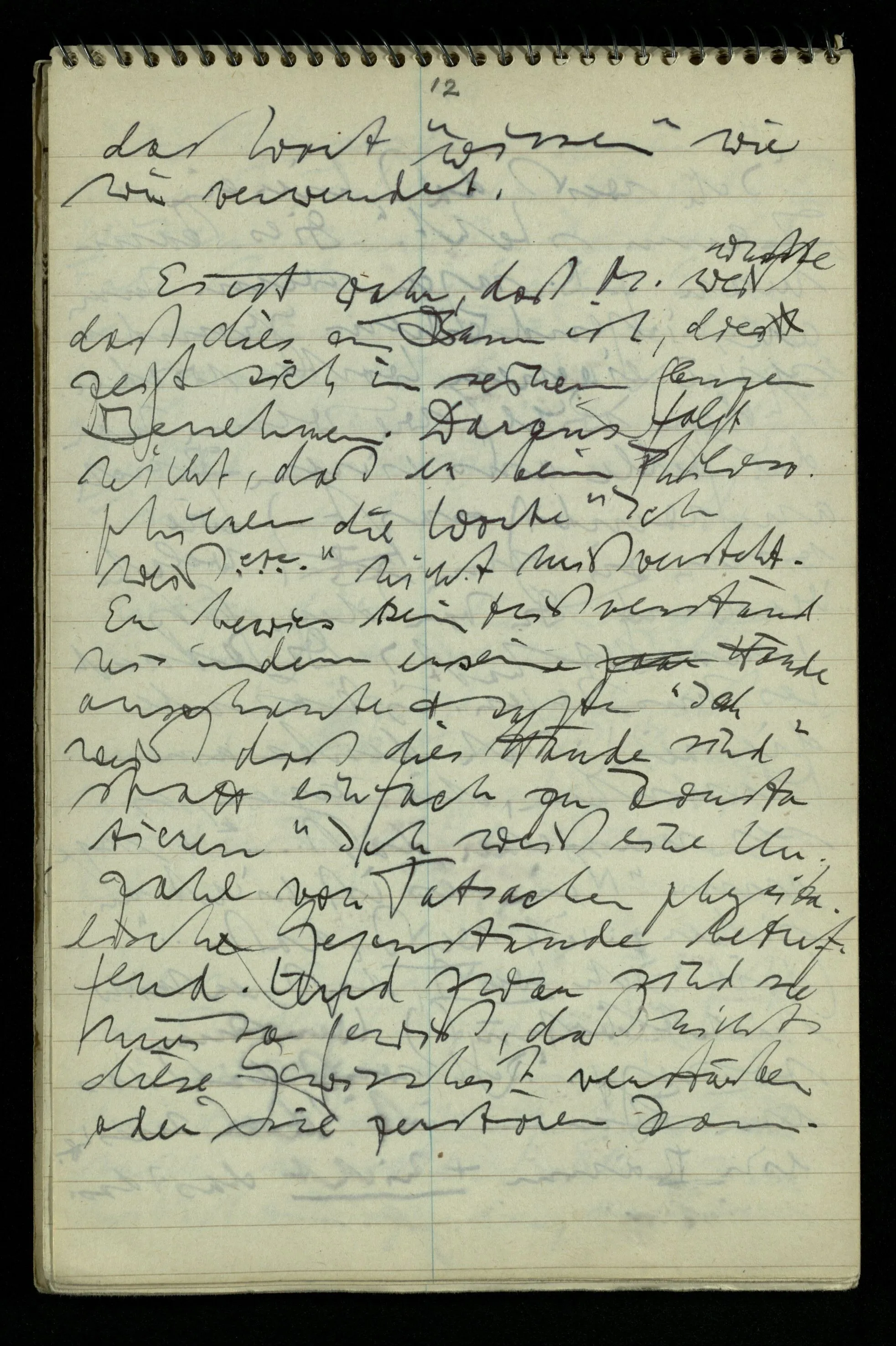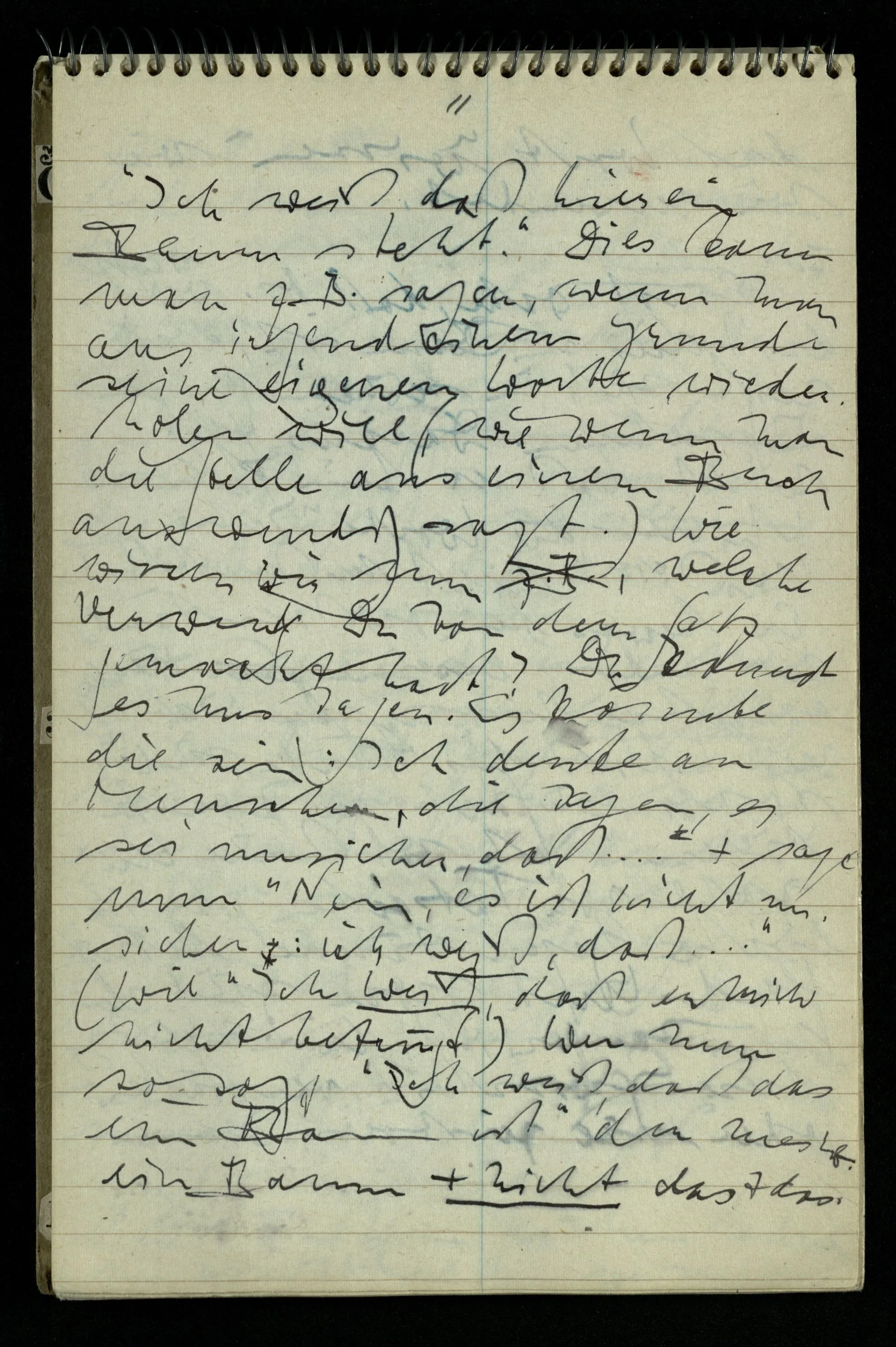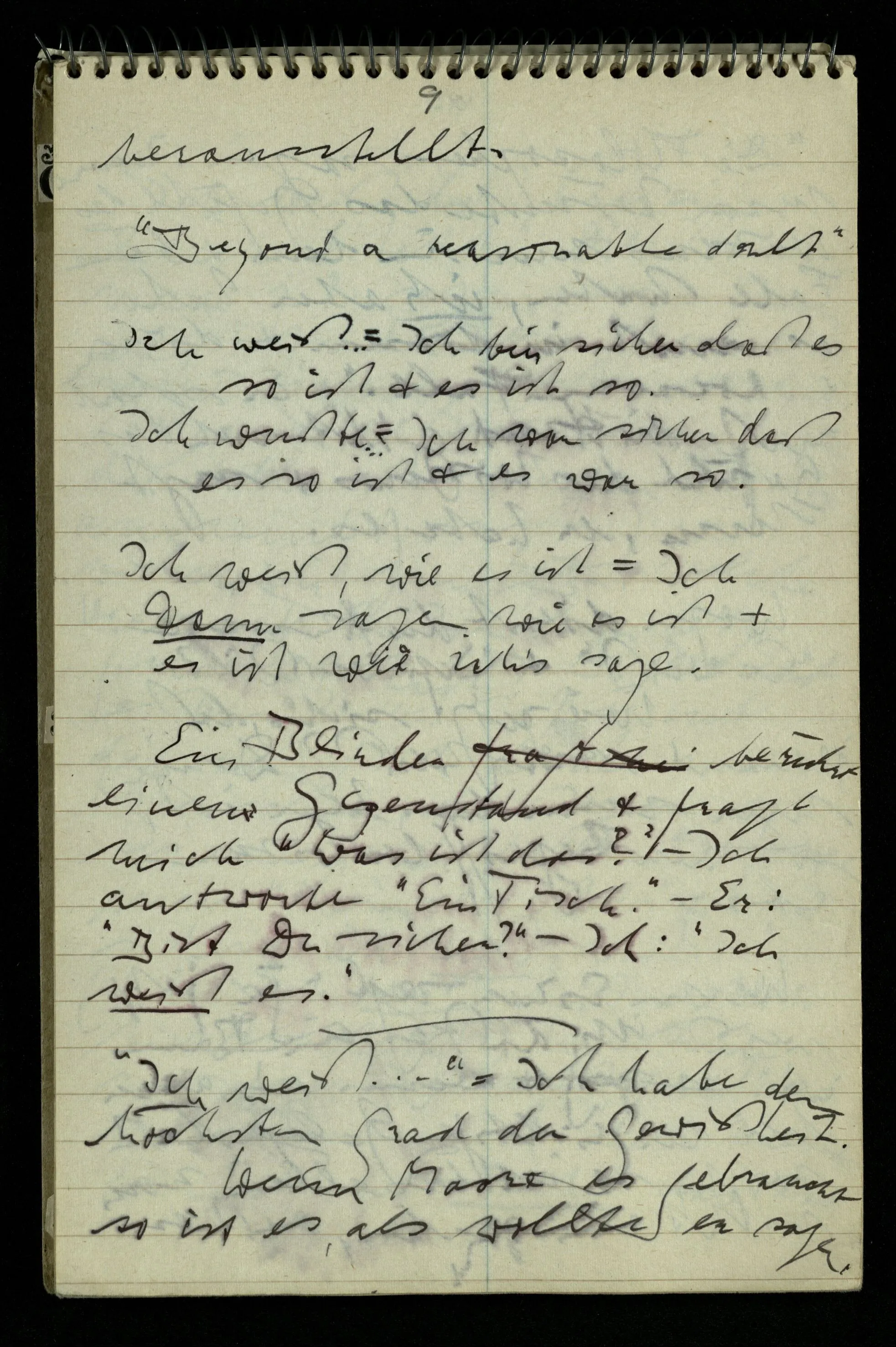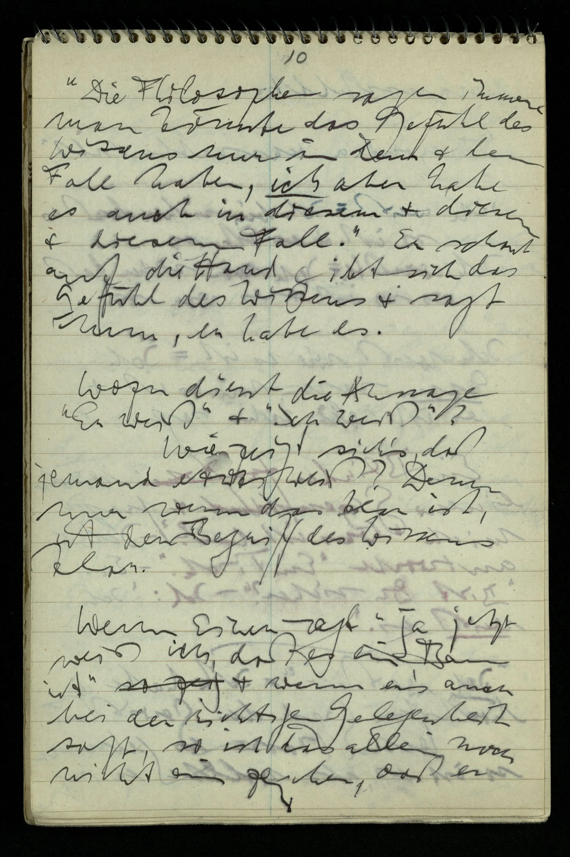 “Die Philosophen sagen immer, man könnte das Gefühl des Wissens nur in dem & dem Fall haben, ich aber habe es auch in diesem & diesem & diesem Fall.” Er schaut auf die Hand, gibt sich das Gefühl des Wissens & sagt nun, er habe es.