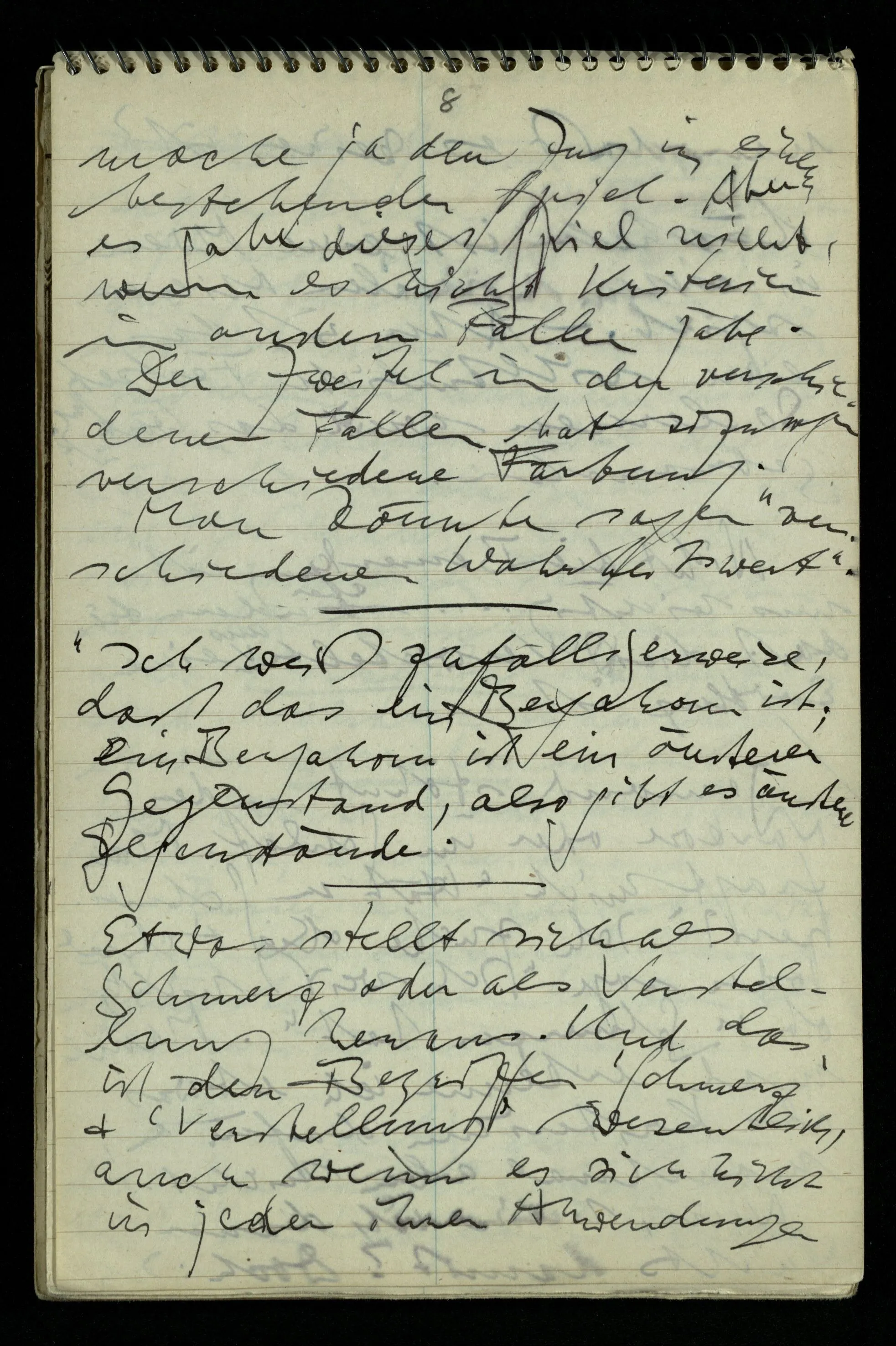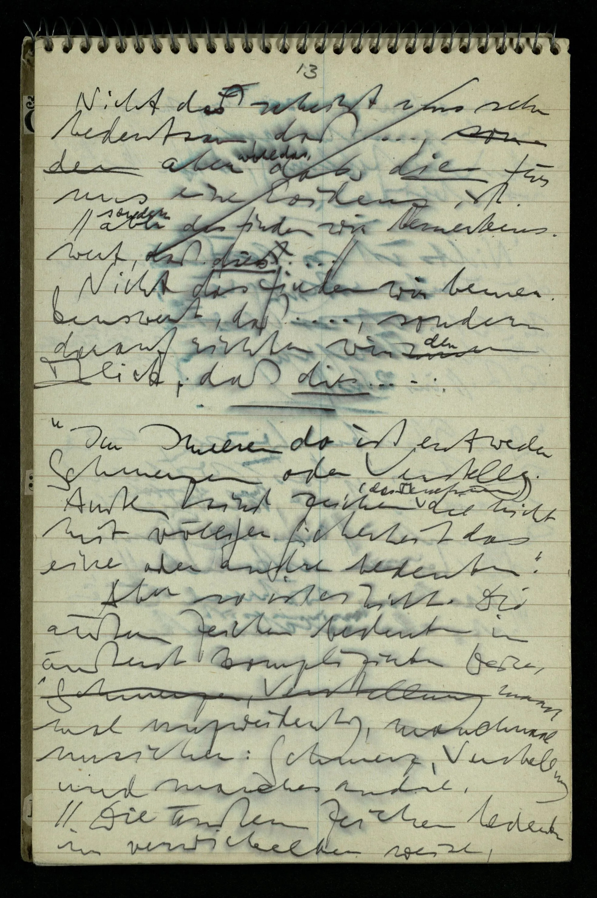 “Im Inneren da ist entweder Schmerzen oder Verstellung. Außen sind Zeichen (das Benehmen) die nicht mit völliger Sicherheit das eine oder andre bedeuten”. Aber so ist es nicht. Die äußern Zeichen bedeuten in äußerst komplizierter Weise, manchmal unzweideutig, manchmal unsicher: Schmerz, Verstellung und manches andre.