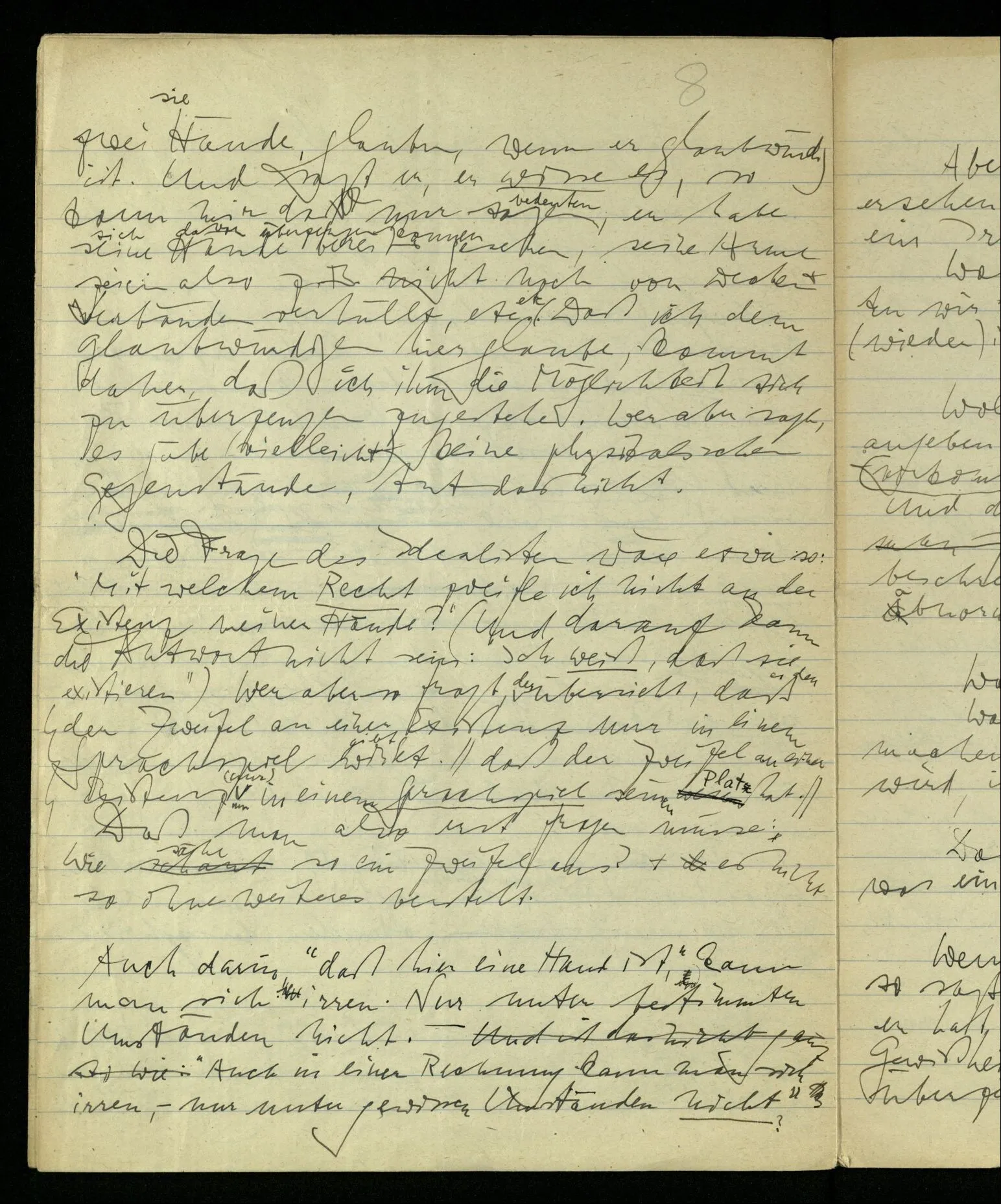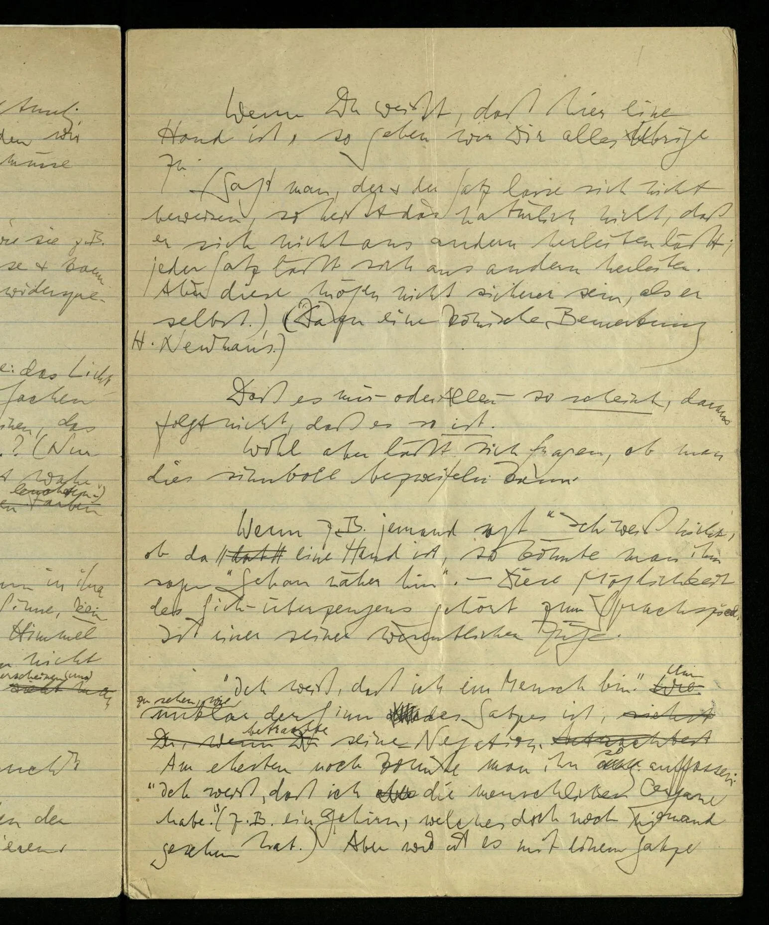 Die Aussage “Ich weiß, daß hier eine Hand ist” kann man also so fortsetzen, “es ist nämlich meine Hand, auf die ich schaue”. Dann wird ein vernünftiger Mensch nicht zweifeln, daß ich’s weiß. – Auch der Idealist nicht; sondern er wird sagen, um den praktischen Zweifel, der beseitigt ist, habe es sich ihm nicht gehandelt, es gebe aber noch einen Zweifel hinter diesem. – Daß dies eine Täuschung ist muß auf andre Weise gezeigt werden.