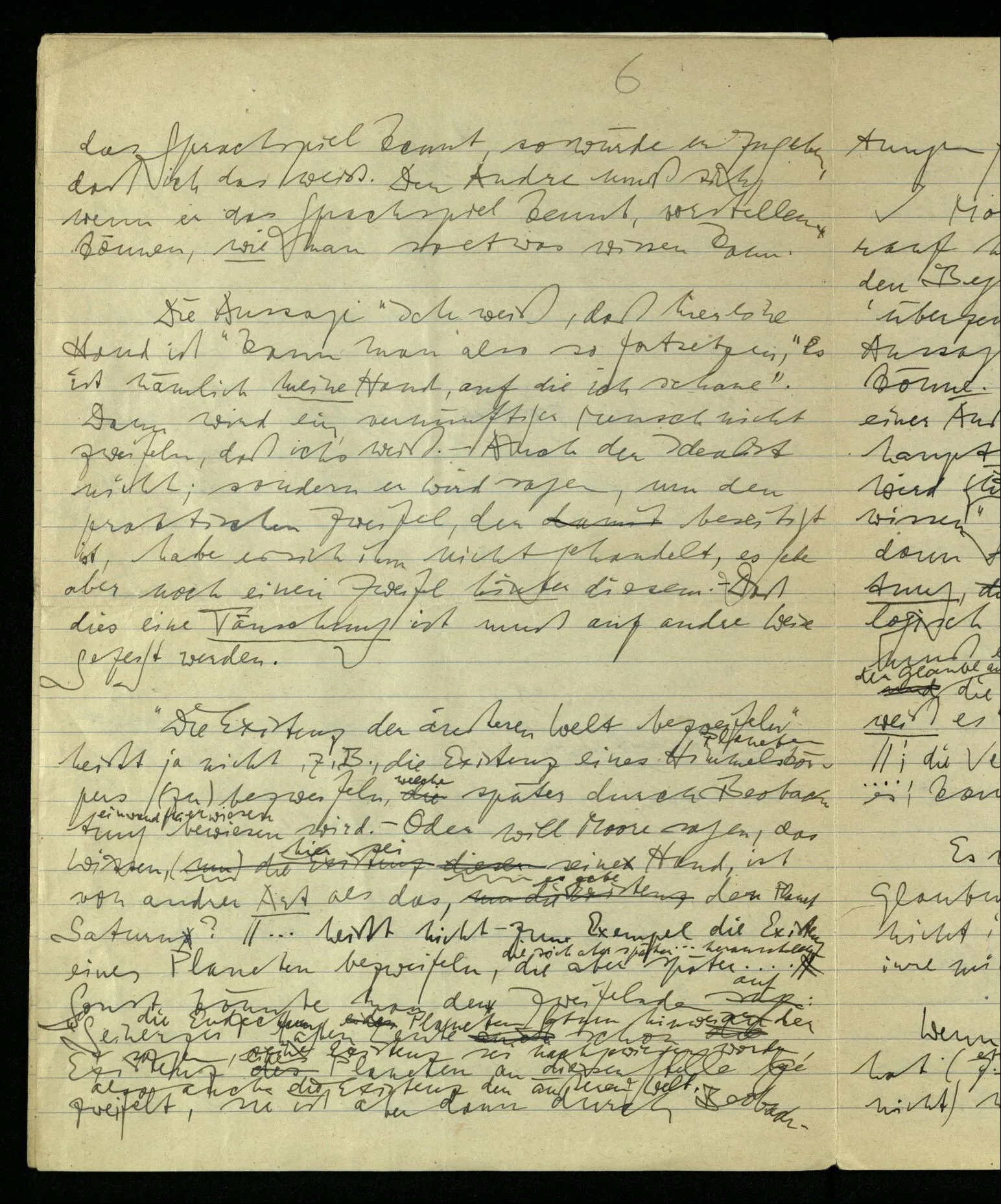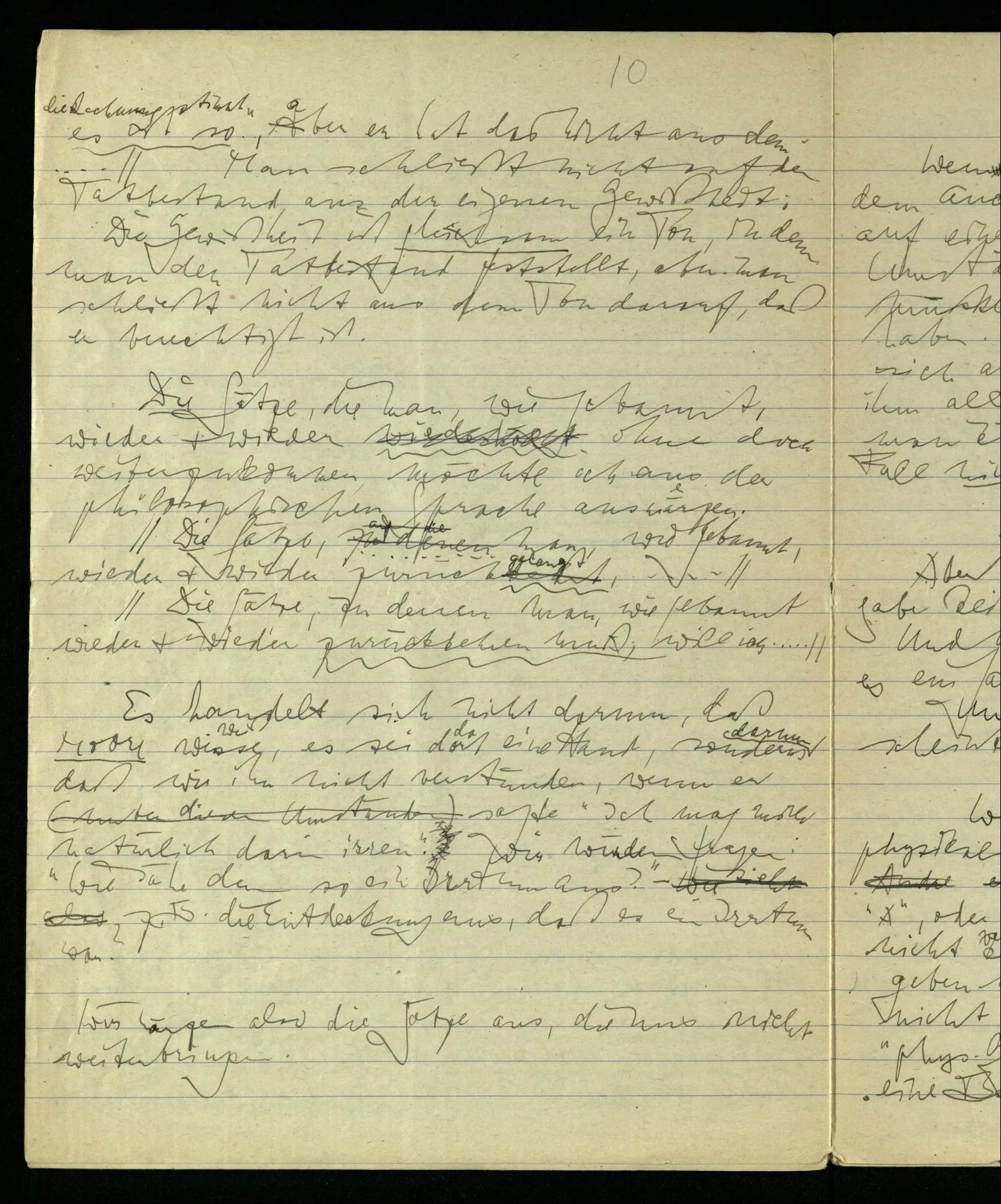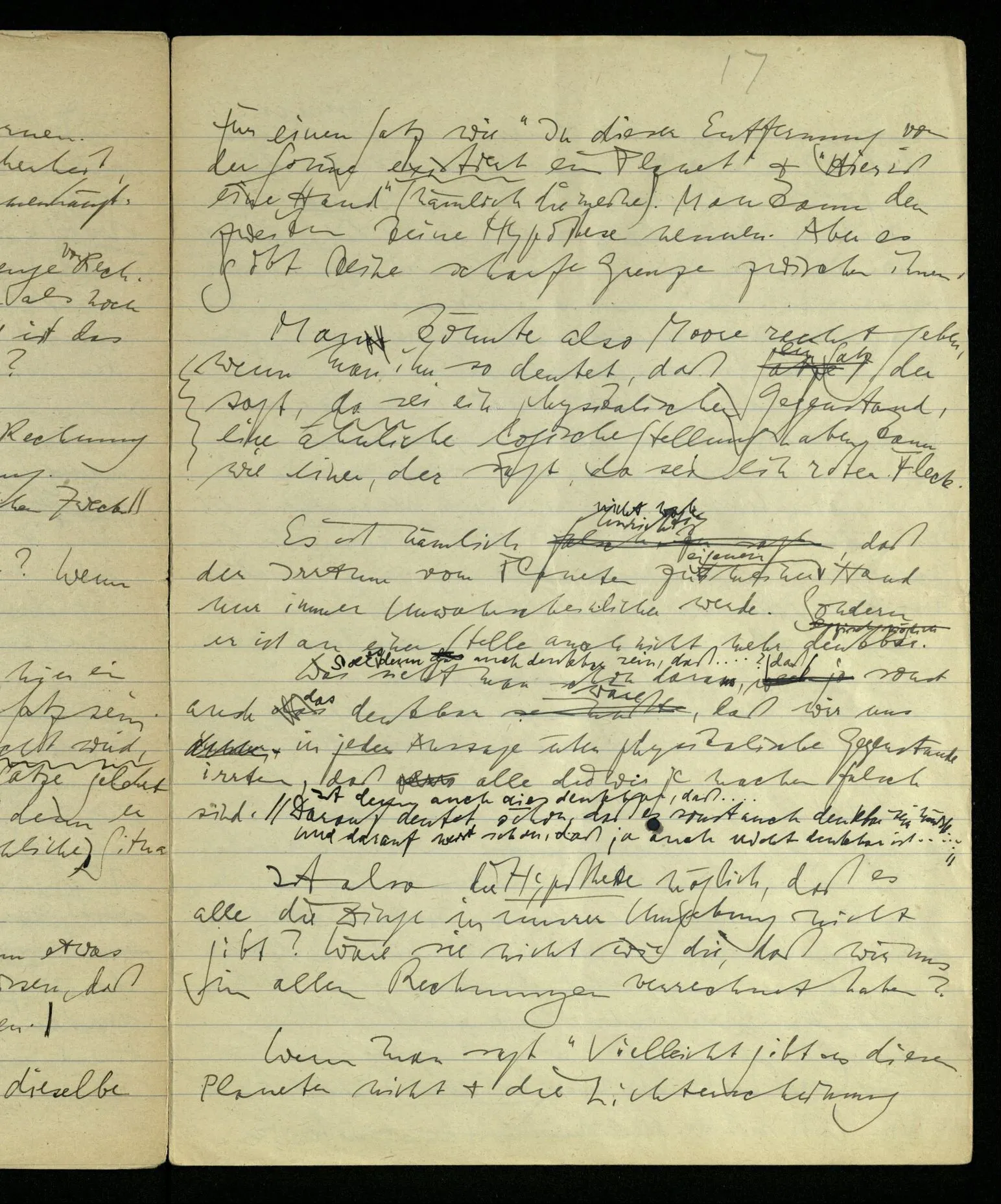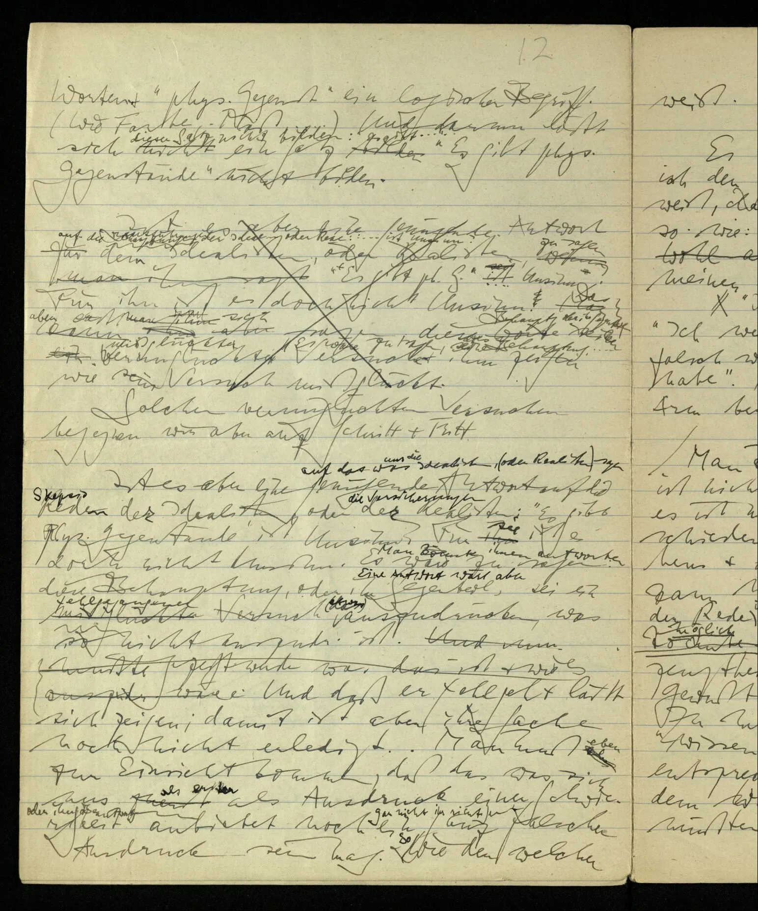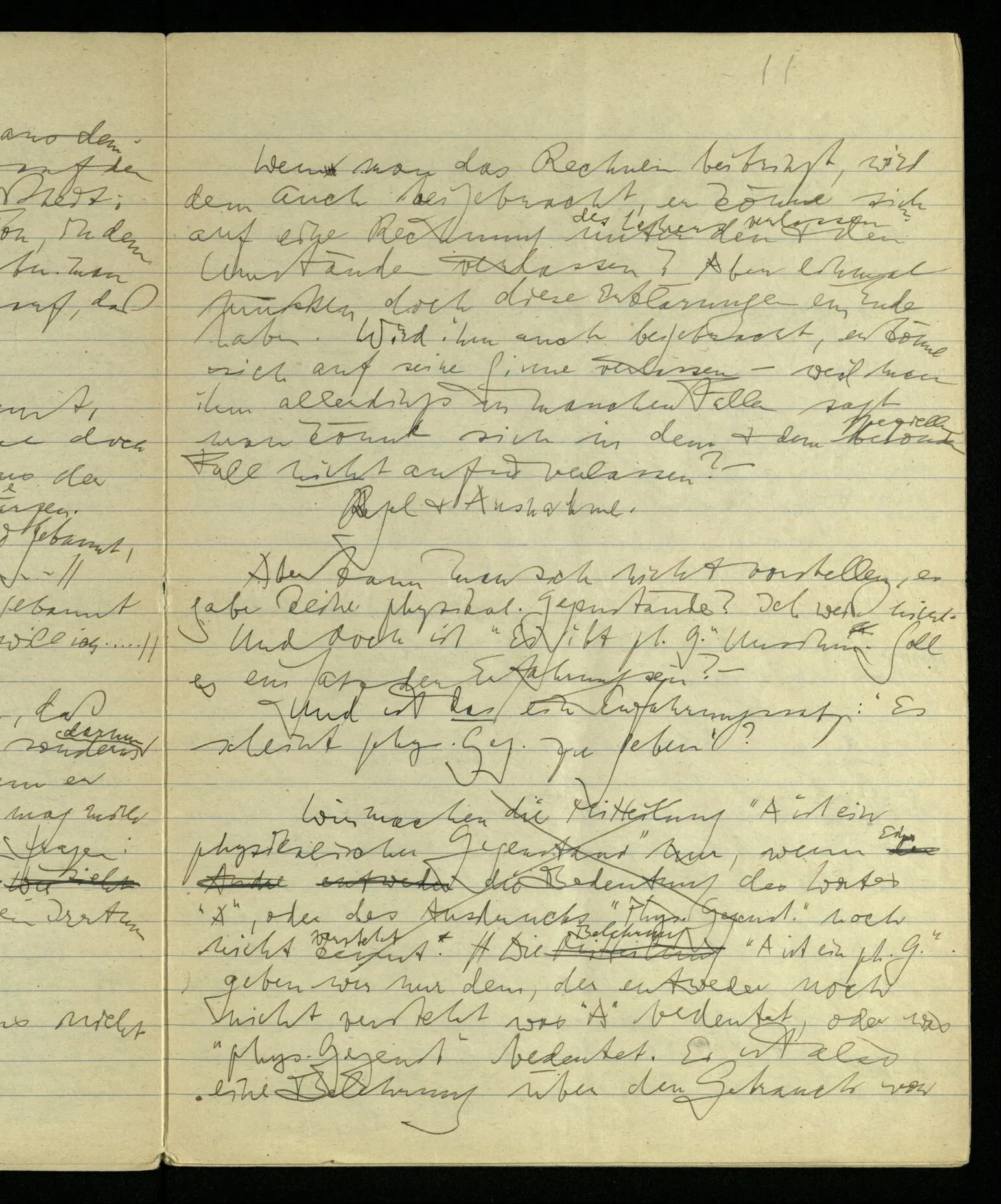 Aber kann man sich nicht vorstellen, es gäbe keine physikalischen Gegenstände? Ich weiß nicht. Und doch ist “Es gibt physikalische Gegenstände” Unsinn. Soll es ein Satz der Erfahrung sein? – Und ist das ein Erfahrungssatz: “Es scheint physikalische Gegenstände zu geben”?