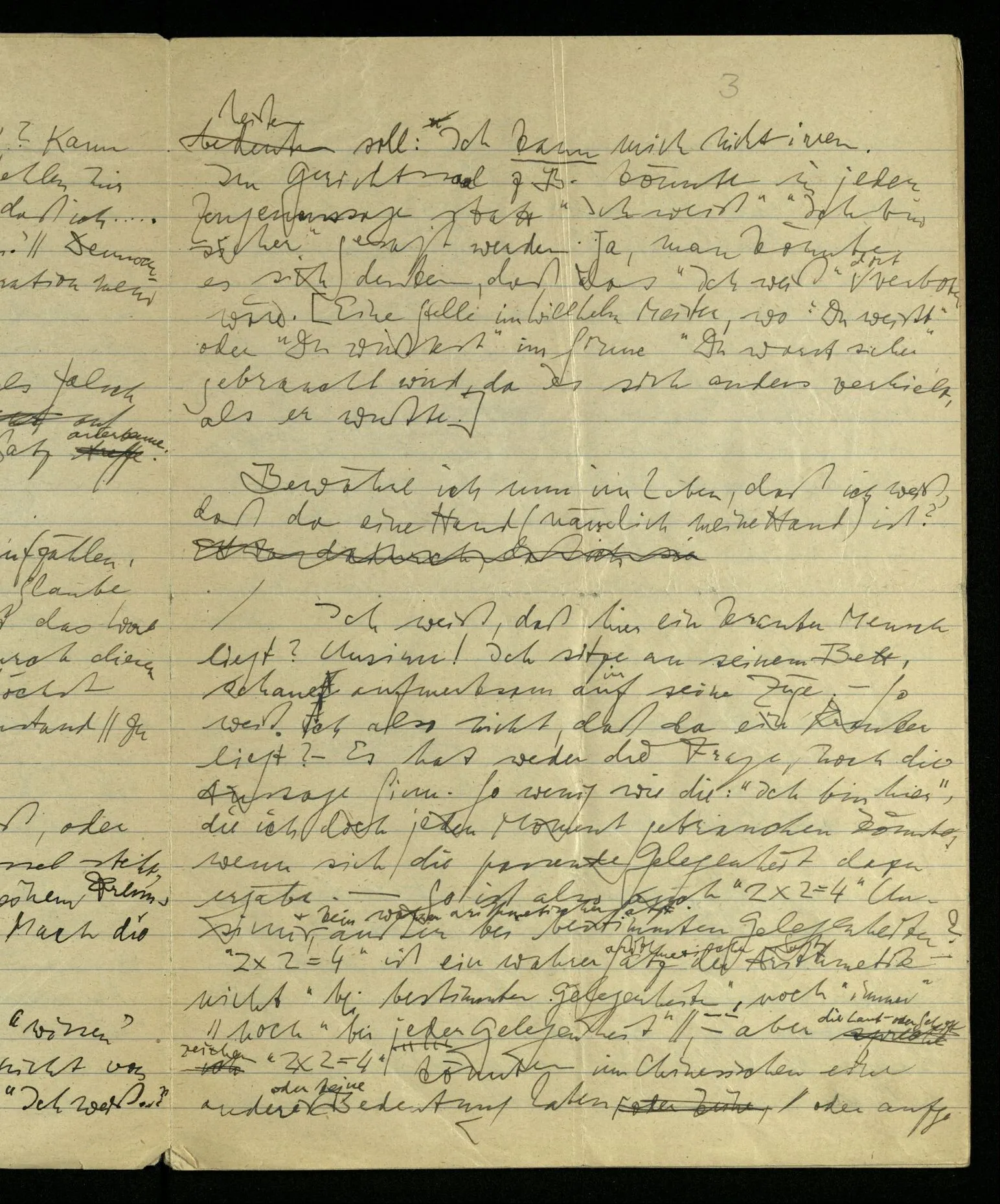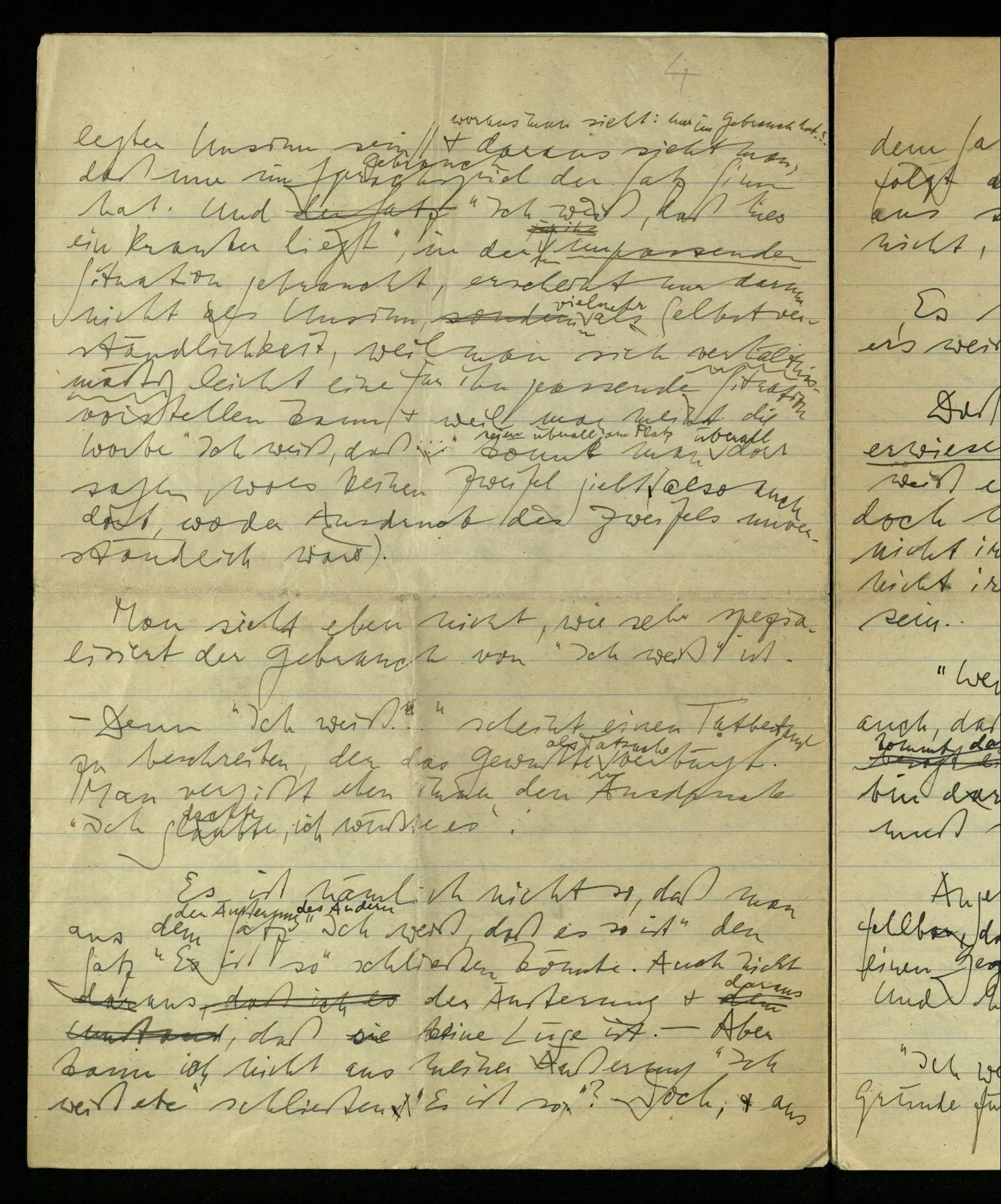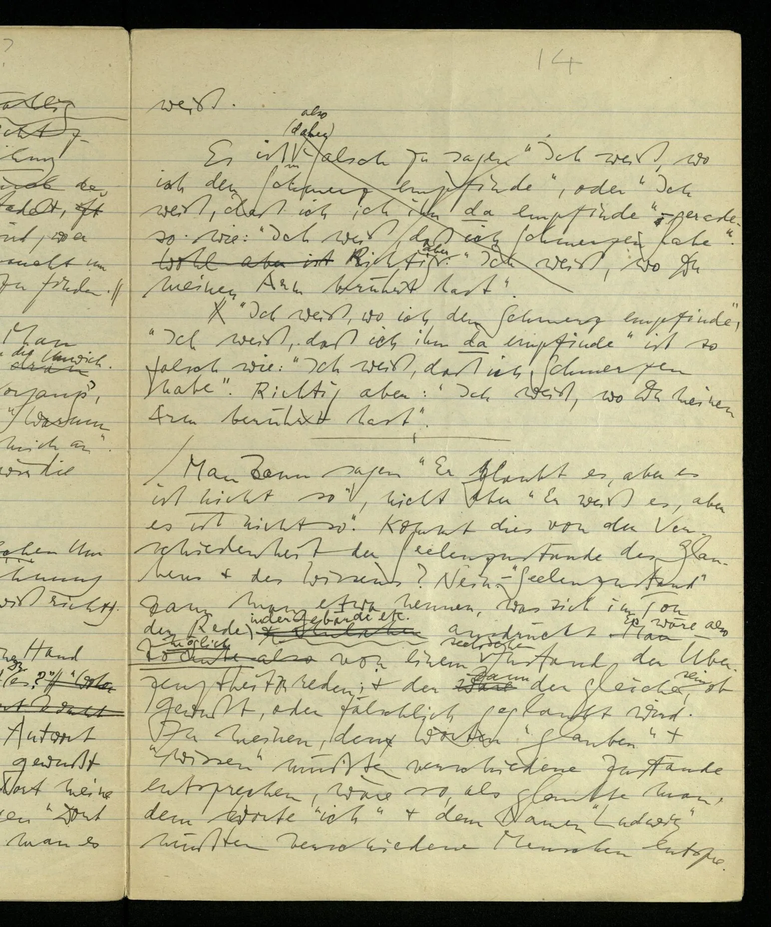 Man kann sagen “Er glaubt es, aber es ist nicht so”, nicht aber “Er weiß es, aber es ist nicht so”. Kommt dies von der Verschiedenheit der Seelenzustände des Glaubens & des Wissens? Nein. – “Seelenzustand” kann man etwa nennen, was sich im Ton der Rede in der Gebärde etc. ausdrückt. Es wäre also möglich von einem seelischen Zustand der Überzeugtheit zu reden; & der kann der gleiche sein, ob gewußt, oder fälschlich geglaubt wird. Zu meinen, den Worten “glauben” & “wissen” müßten verschiedene Zustände entsprechen, wäre so, als glaubte man, dem Worte “ich” & dem Namen “Ludwig” müßten verschiedene Menschen entsprechen, weil die Begriffe verschieden sind.