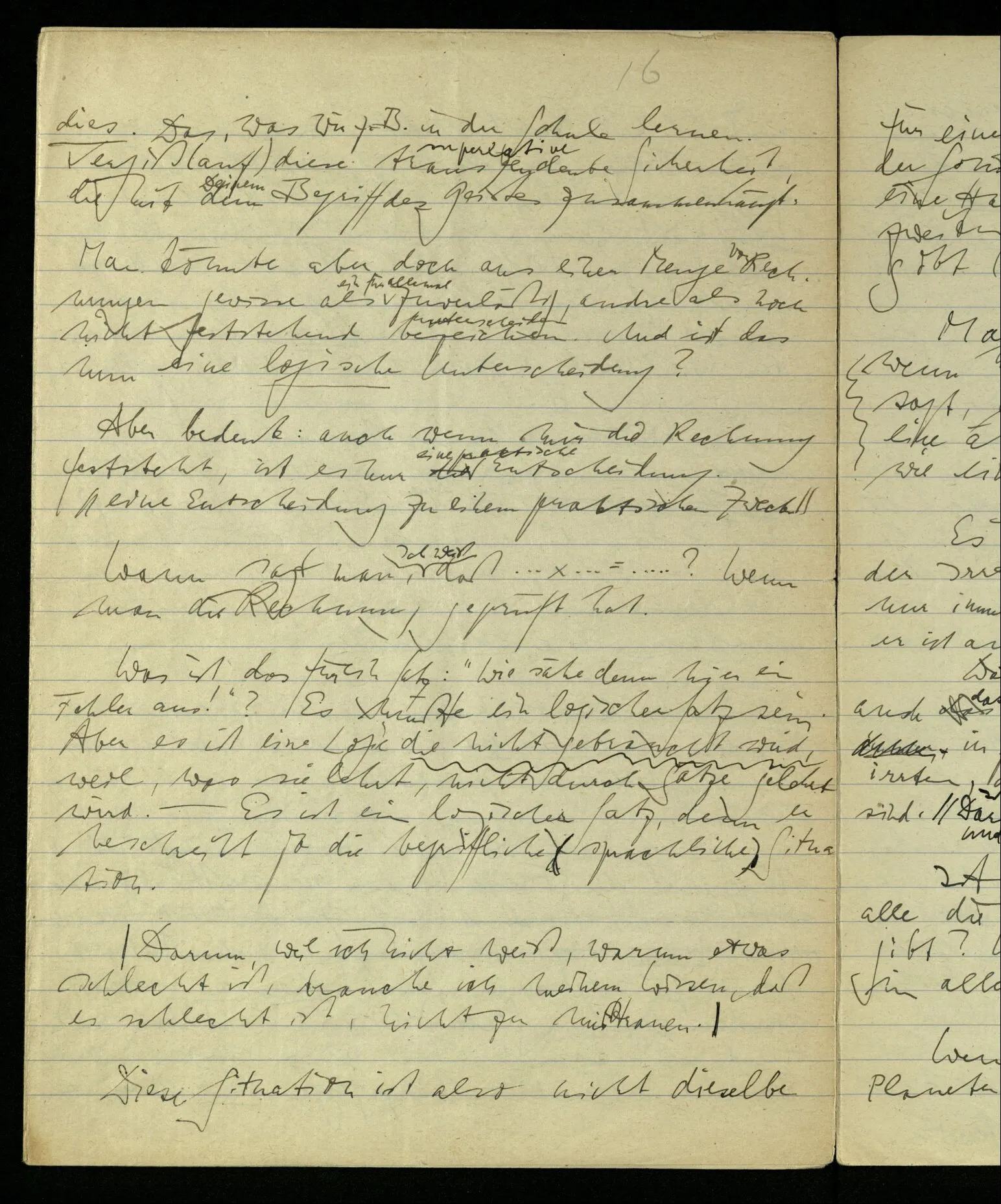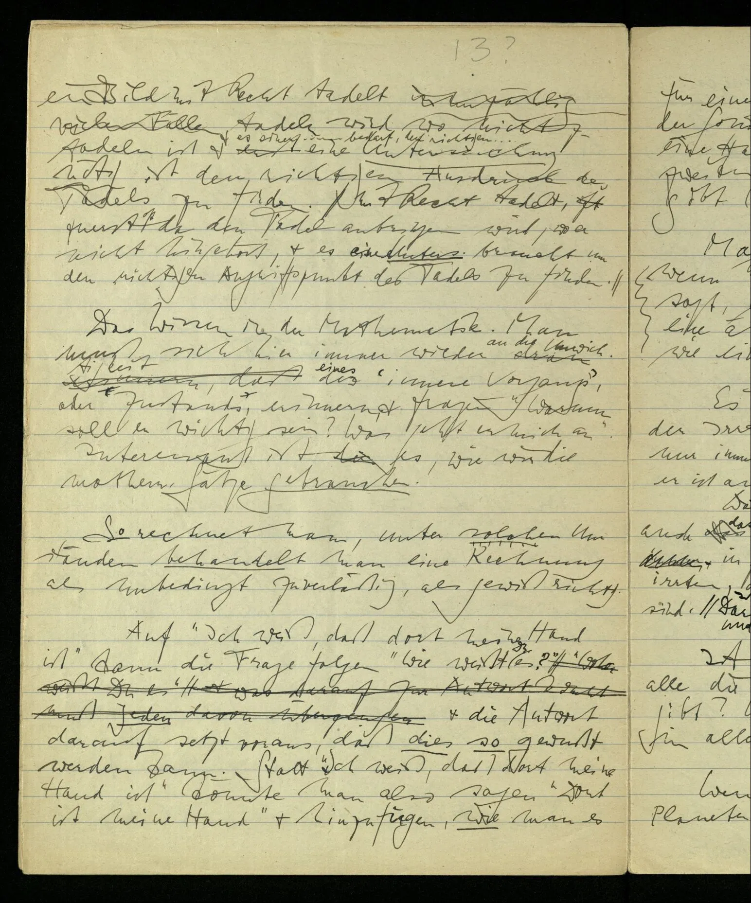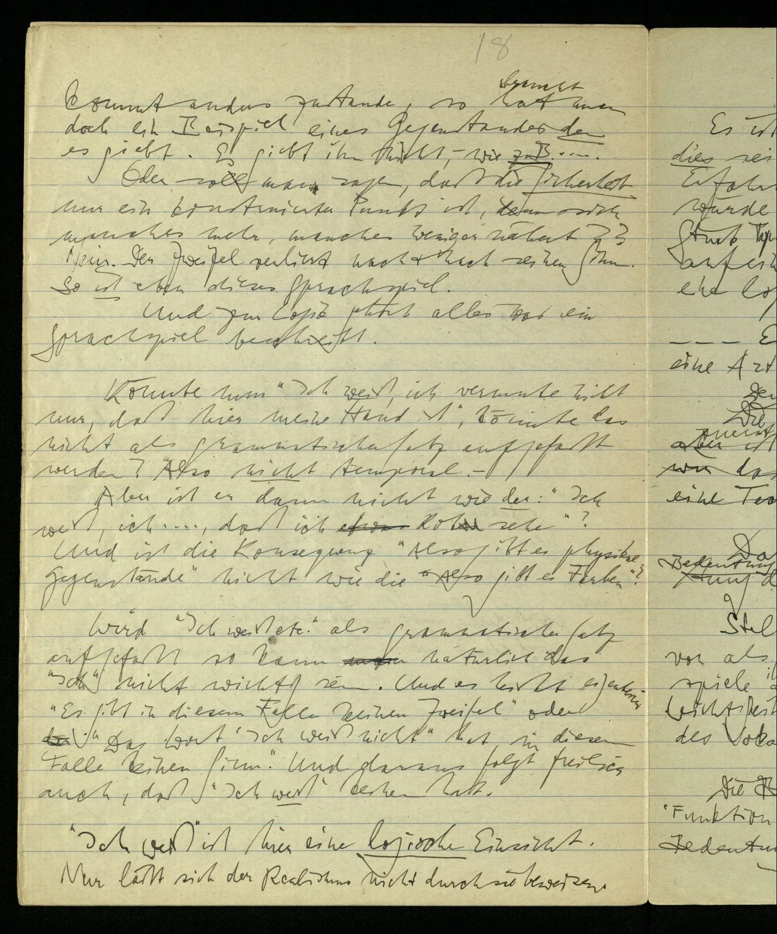 Man kann sagen “Er glaubt es, aber es ist nicht so”, nicht aber “Er weiß es, aber es ist nicht so”. Kommt dies von der Verschiedenheit der Seelenzustände des Glaubens & des Wissens? Nein. – “Seelenzustand” kann man etwa nennen, was sich im Ton der Rede in der Gebärde etc. ausdrückt. Es wäre also möglich von einem seelischen Zustand der Überzeugtheit zu reden; & der kann der gleiche sein, ob gewußt, oder fälschlich geglaubt wird. Zu meinen, den Worten “glauben” & “wissen” müßten verschiedene Zustände entsprechen, wäre so, als glaubte man, dem Worte “ich” & dem Namen “Ludwig” müßten verschiedene Menschen entsprechen, weil die Begriffe verschieden sind.