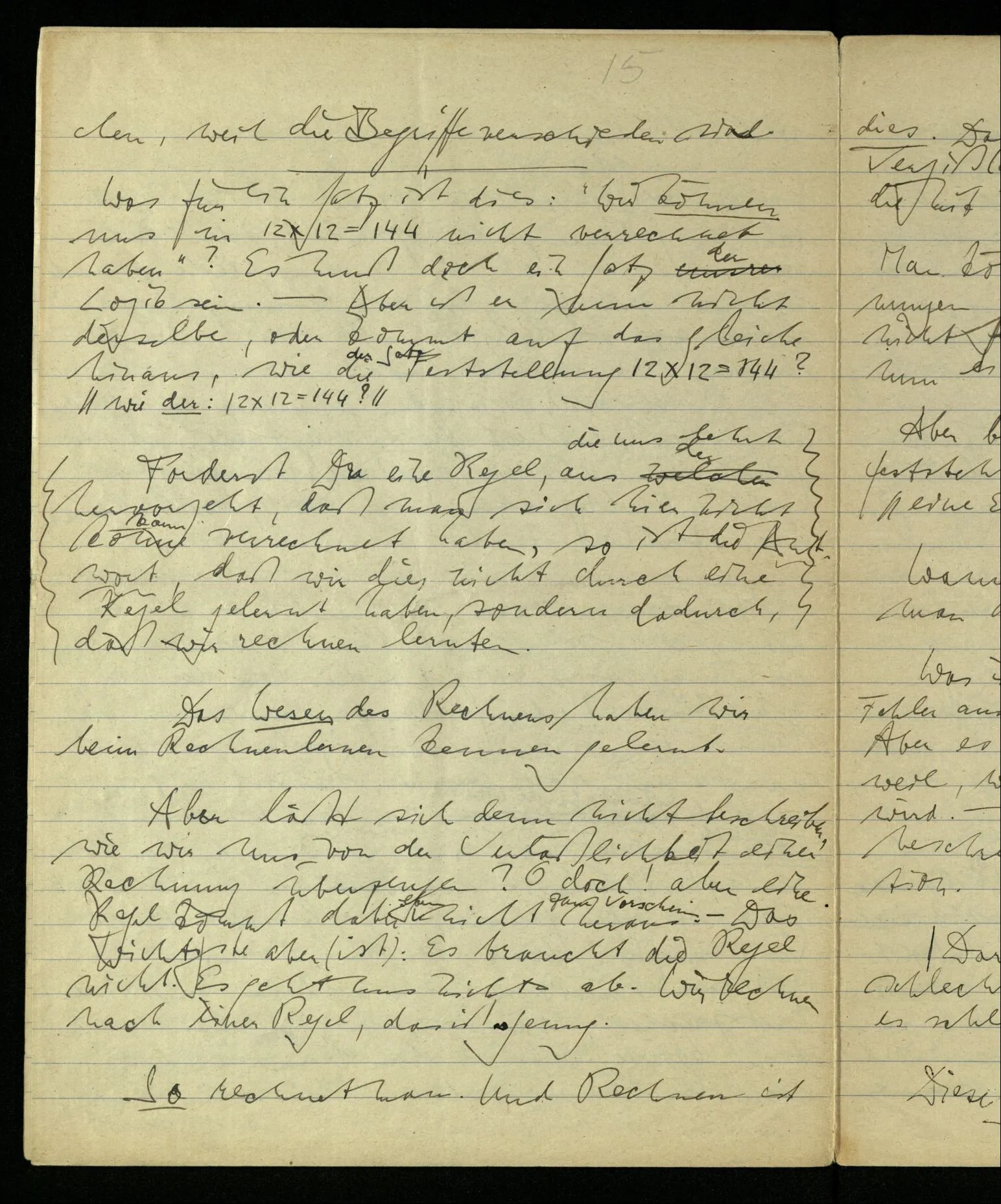 Aber läßt sich denn nicht beschreiben, wie wir uns von der Verläßlichkeit einer Rechnung überzeugen? O doch! aber eine Regel kommt dabei eben nicht heraus. – Das Wichtigste aber (ist): Es braucht die Regel nicht. Es geht uns nicht ab. Wir rechnen nach einer Regel, das ist genug.