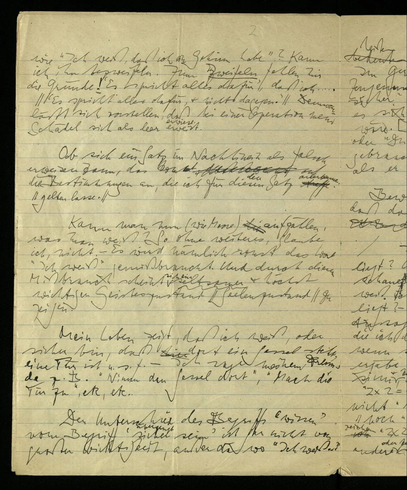 Ich weiß, daß hier ein kranker Mensch liegt? Unsinn! Ich sitze an seinem Bett, schaue aufmerksam auf seine Züge. – So weiß ich also nicht, daß da ein Kranker liegt? – Es hat weder die Frage, noch die Aussage Sinn. So wenig wie die: “Ich bin hier”, die ich doch jeden Moment gebrauchen könnte, wenn sich die passende Gelegenheit dazu ergäbe. – So ist also auch “2 × 2 = 4” Unsinn & kein wahrer arithmetischer Satz, außer bei bestimmten Gelegenheiten? “2 × 2 = 4” ist ein wahrer Satz der Arithmetik – nicht “bei bestimmten Gelegenheiten”, noch “immer” , – aber die Laut- oder Schriftzeichen “2 × 2 = 4” könnten im Chinesischen eine andere oder keine Bedeutung haben & daraus sieht man, daß nur im Sprachspiel der Satz Sinn hat. Und “Ich weiß, daß hier ein Kranker liegt”, in der unpassenden Situation gebraucht, erscheint nur darum nicht als Unsinn, vielmehr als Selbstverständlichkeit, weil man sich verhältnismäßig leicht eine für ihn passende Situation vorstellen kann & weil man meint die Worte “Ich weiß, daß …” könne man überall dort sagen, wo es keinen Zweifel gibt (also auch dort, wo der Ausdruck des Zweifels unverständlich wäre).