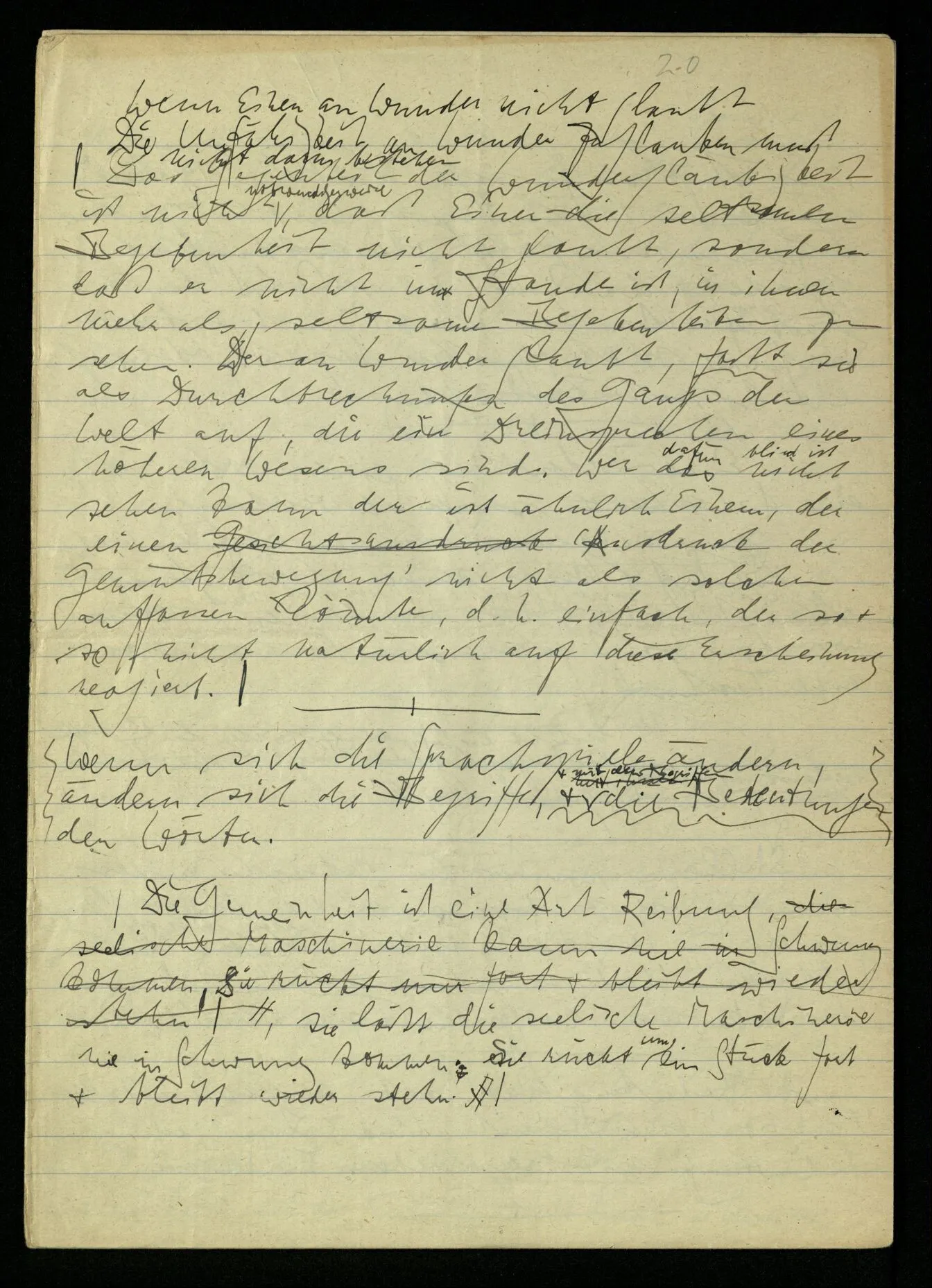 Das Gegenteil der Wundergläubigkeit ist nicht notwendigerweise, daß Einer die seltsamen Begebenheiten nicht glaubt, sondern daß er nicht im Stande ist, in ihnen mehr als seltsame Begebenheiten zu sehen. Der an Wunder glaubt, faßt sie als Durchbrechungen des Gangs der Welt auf, die ein Dreinsprechen eines höheren Wesens sind. Wer das nicht sehen kann der ist ähnlich Einem, der einen ‘Ausdruck der Gemütsbewegung’ nicht als solchen auffassen könnte, d.h. einfach, der so & so nicht natürlich auf diese Erscheinung reagiert.