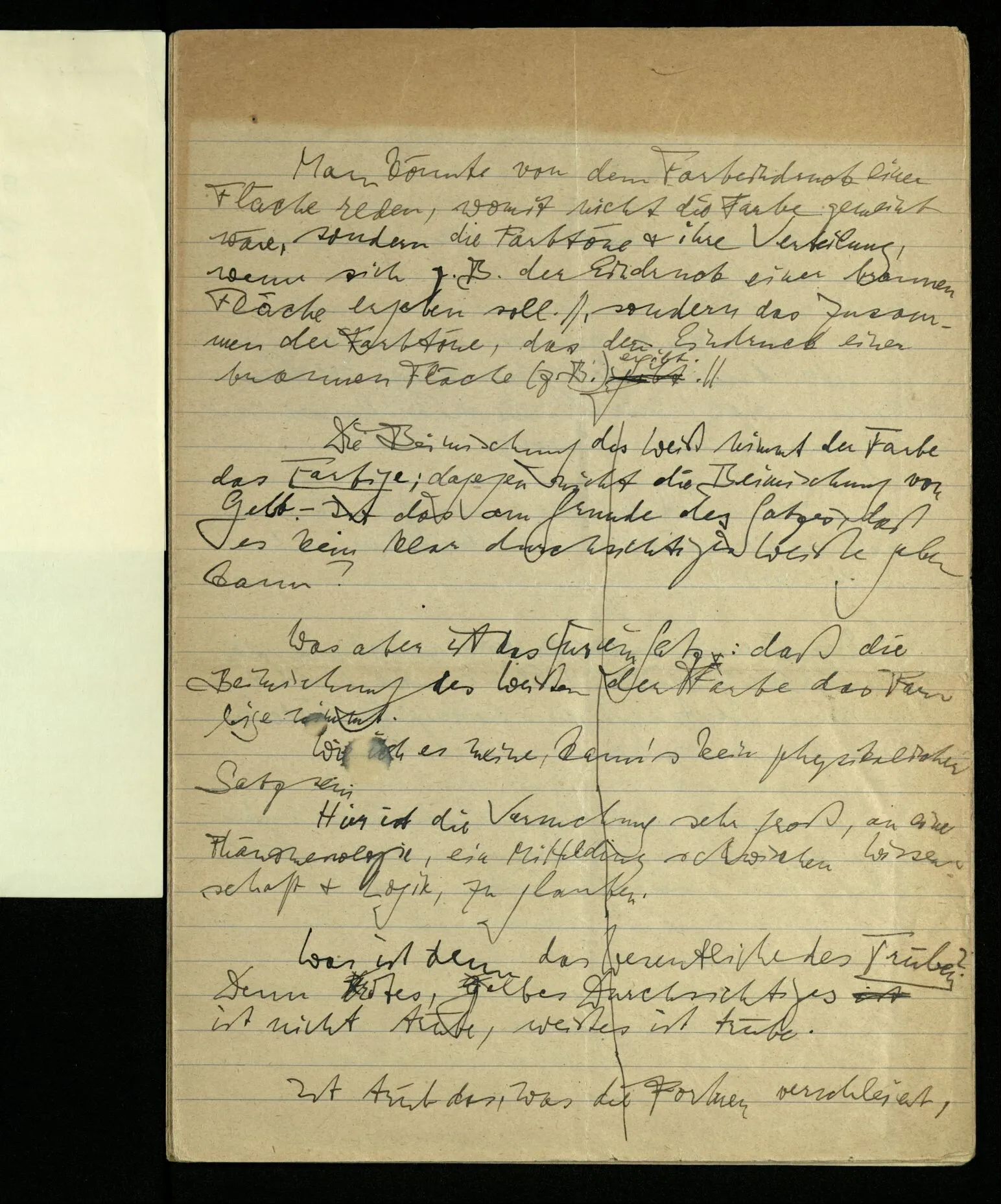 Was aber ist das für ein Satz: daß die Beimischung des Weißen der Farbe das Farbige nimmt. Wie ich es meine, kann’s kein physikalischer Satz sein. Hier ist die Versuchung sehr groß, an eine Phänomenologie, ein Mittelding zwischen Wissenschaft & Logik, zu glauben.