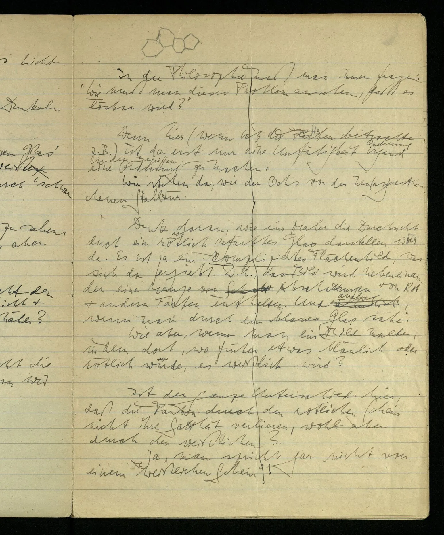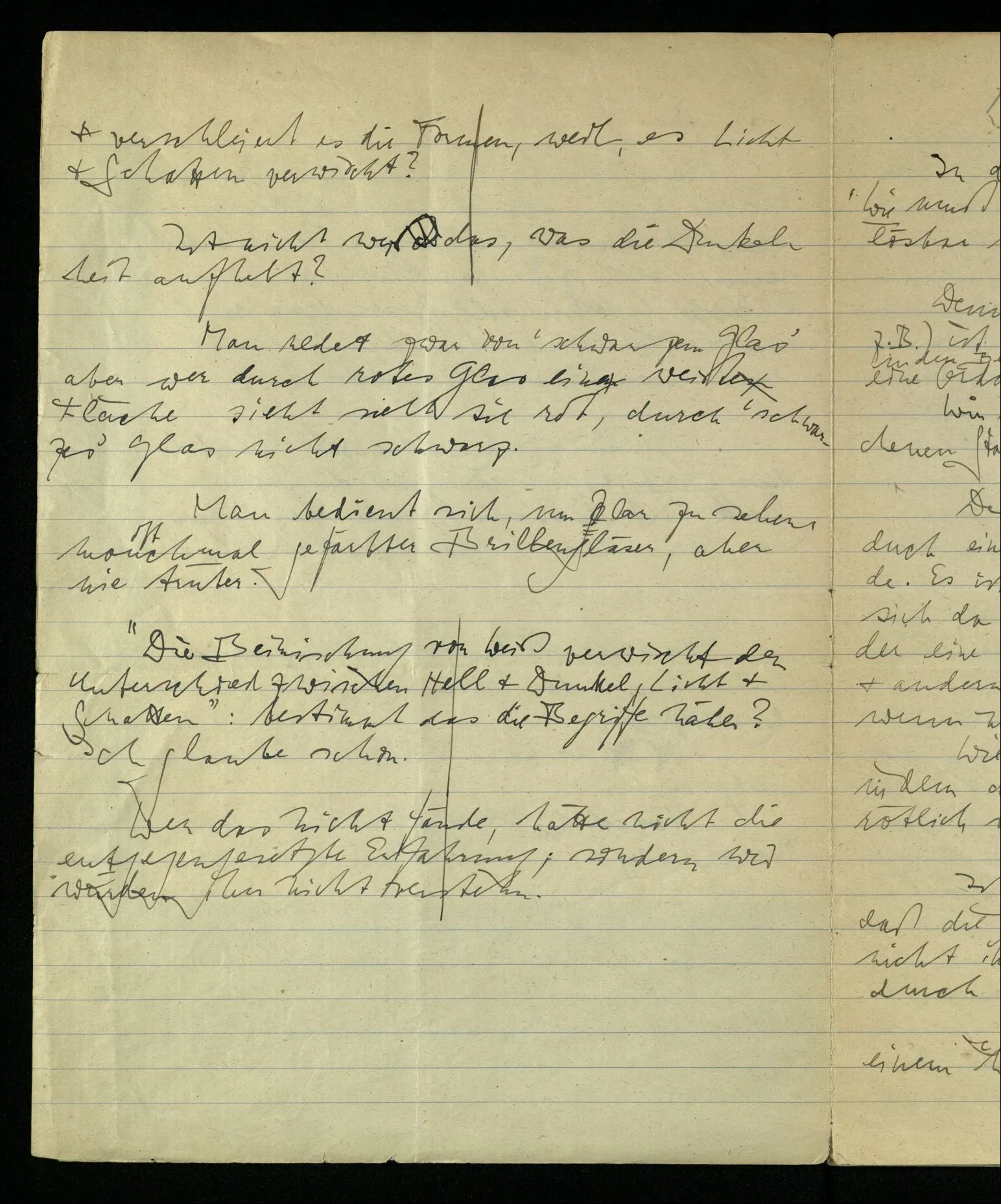 Denk daran, wie ein Maler die Durchsicht durch ein rötlich gefärbtes Glas darstellen würde. Es ist ja ein kompliziertes Flächenbild, was sich da ergiebt. D.h., das Bild wird nebeneinander eine Menge von Abschattungen von Rot & andern Farben enthalten. Und analog, wenn man durch ein blaues Glas sähe. Wie aber, wenn man ein Bild malte, in dem dort, wo früher etwas bläulich oder rötlich wurde, es weißlich wird?